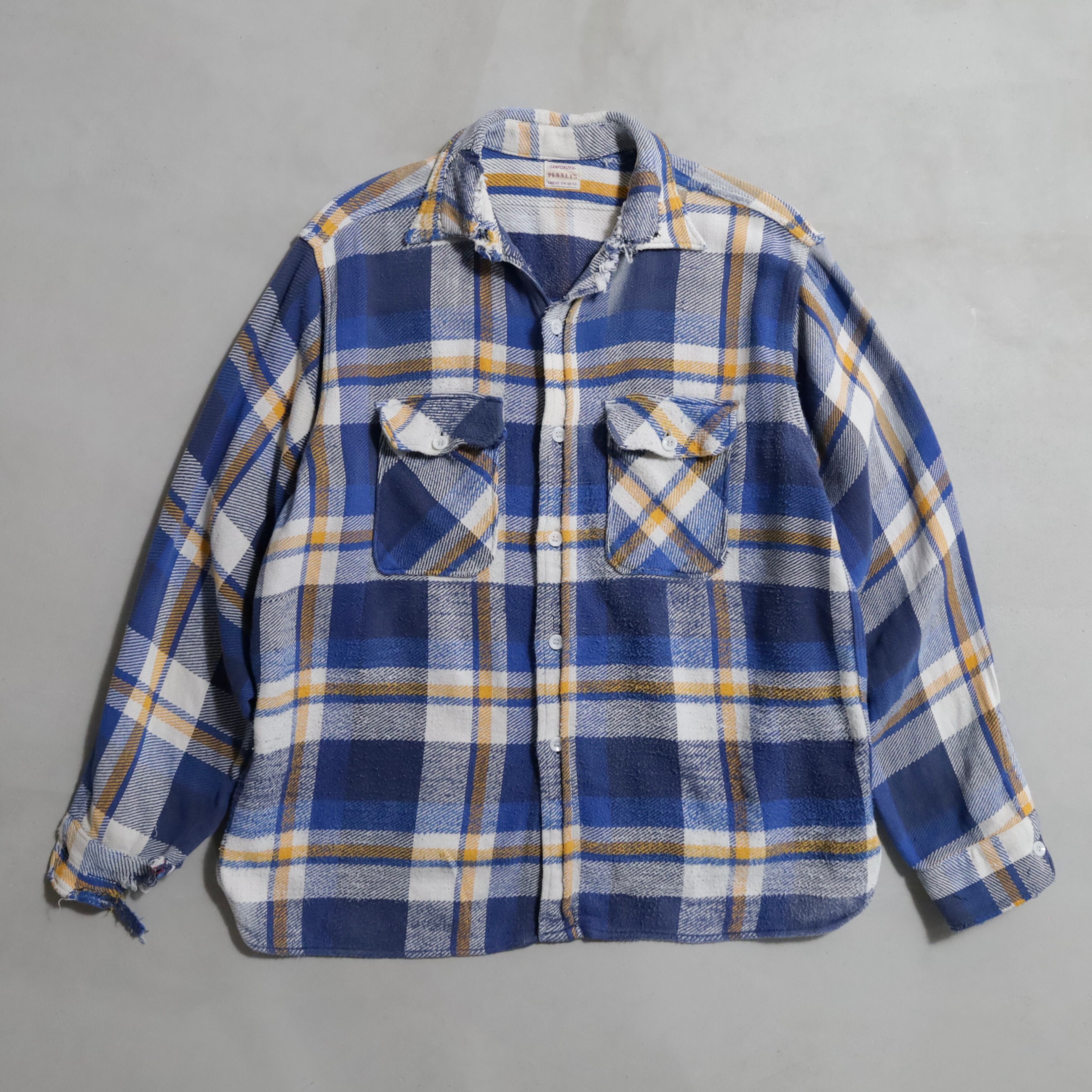 雰囲気最高ですね。グッドカラーに希少なLARGEサイズもポイント高いと思います。古いネルシャツでブルーは出ないですよ。フラップ付ポケットに皿ボタン仕様のナイスディテールです。グッドダメージなどを考慮したプライス設定となっていますので、この機会に是非ご検討ください。