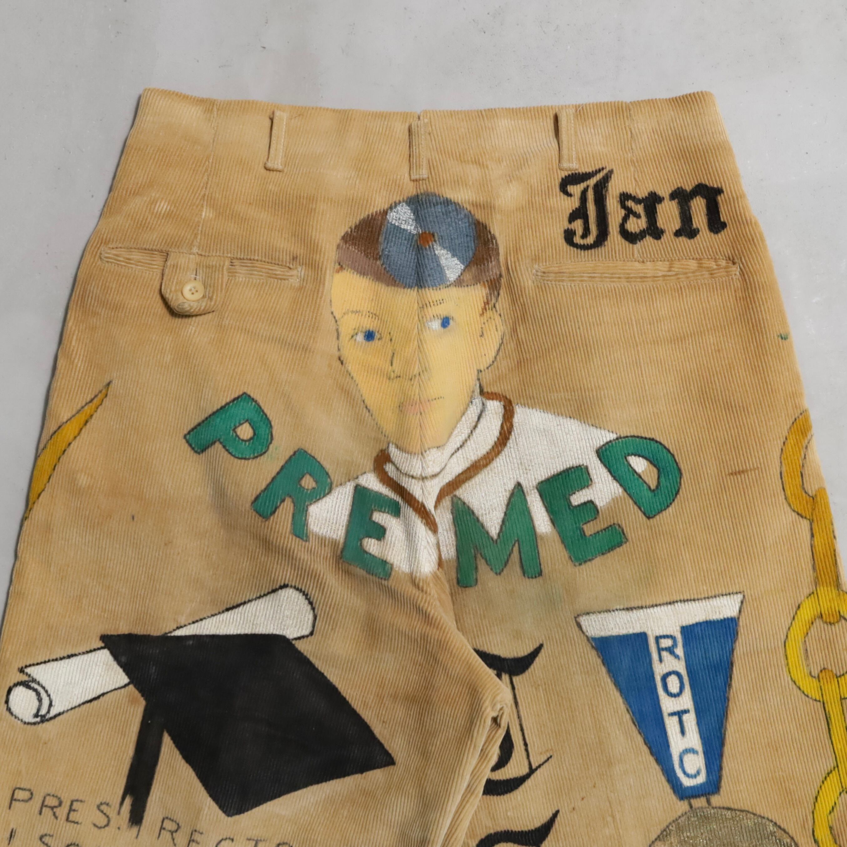 大変希少なメモリアルパンツをグッドコンディションで買付できました。メモリアルパンツの中でも頭一つ抜けたスペシャルですね。プリンストン大学の通称BEER JACKETと同じ伝統的な習わしの逸品です。様々なハンドペイントの中、"PREMED"から医学部の学生だったと読み取れますね。オリジナル個体としての希少性やデザイン性は勿論、太畝コーディロイに綺麗なテーパードシルエット、実寸W32/L31のゴールデンサイズと時代に合ったファッションピースとしてもおすすめしたいです。この様な一点物やアートピースはアメリカ本国の方が価値を見出し高く評価されています。今後を見据えても損のないスペシャルピース、この機会に是非ご検討ください。