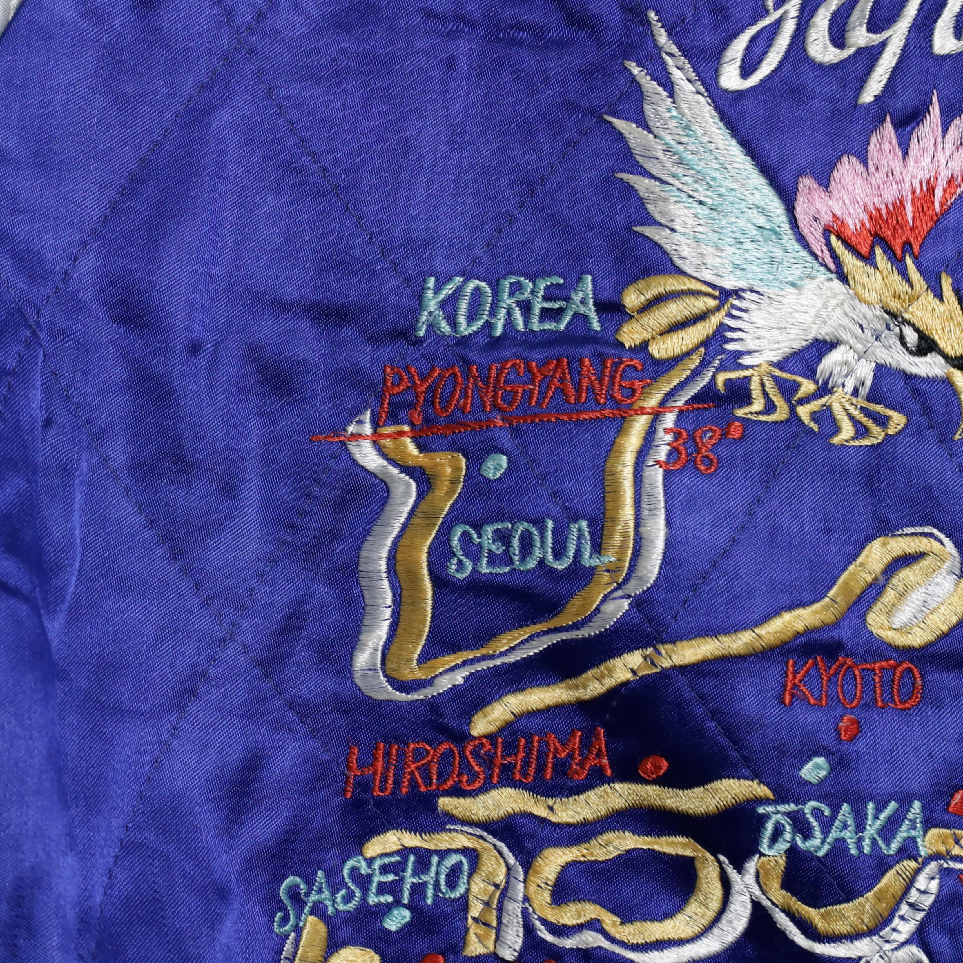 真っ赤な龍のレアパターンスカジャンを買付できました。良いグレードです。ブラックサテン/ブルーサテン、A面は両胸龍×背面龍/B面は両胸鷹×背面鷹×日本・朝鮮半島のハイグレードな刺繍が目を惹きますね。38度線も入ります。特にA面は真っ赤な龍に高波の大きな刺繍がインパクトがあり最高ですよ。変わらずニーズは高いですし、コレクションとしてもおすすめのグッドピース、好条件での販売となりますのでこの機会に是非ご検討ください。