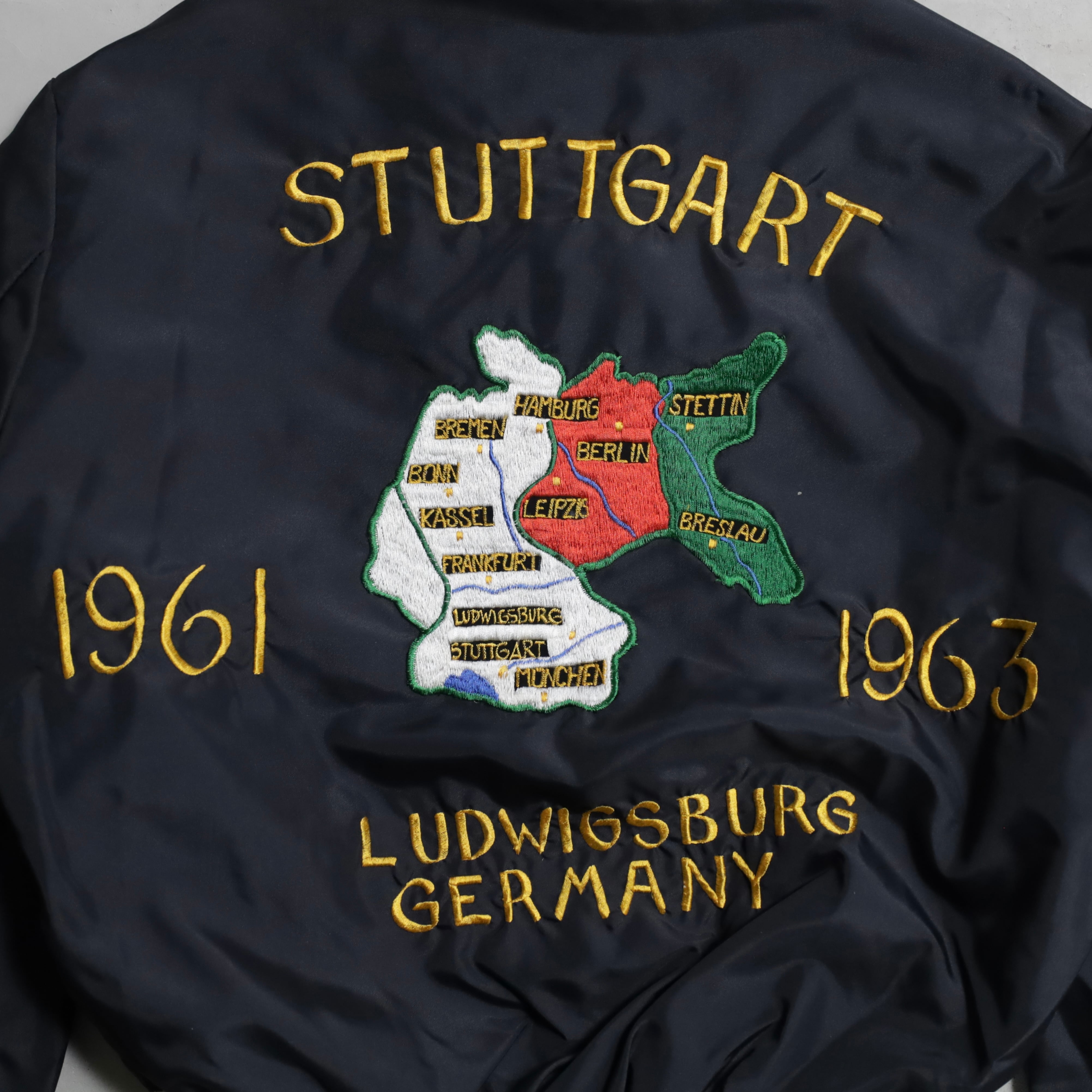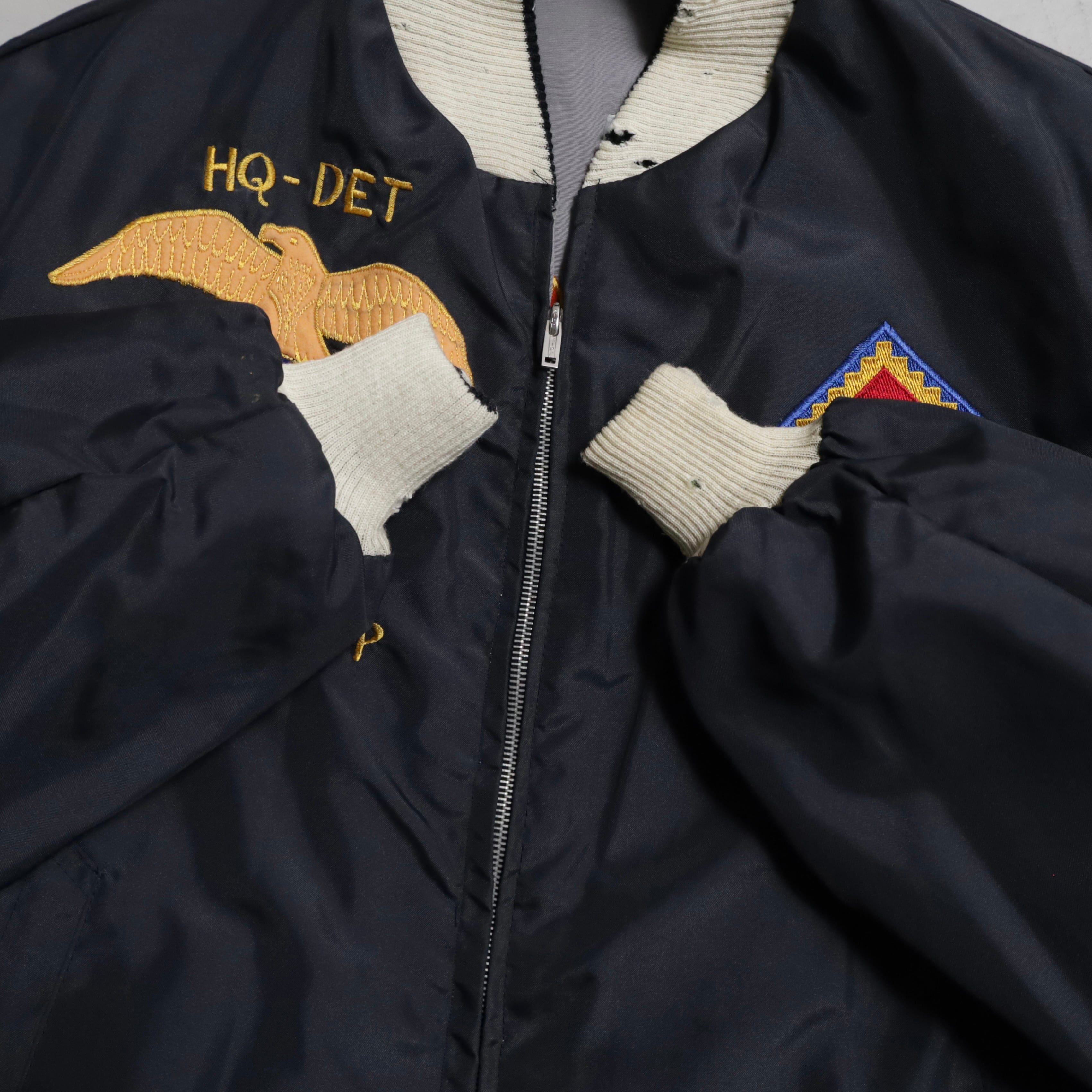 希少なジャーマンスーベニアをデッドストックコンディションで買付できました。レッドデビルパターンのビッグサイズ個体。スペシャルですね。A面はレッドデビル刺繍/B面はジャーマンマップ刺繍。A面の7段の階段を上るレッドデビルに"SEVEN STEPS TO HELL"刺繍、左胸に入るフラワーの"LOS ANGELES CARIFORNIA"の刺繍、センス抜群ですし無茶苦茶かっこいいですね。SEVEN STEPS TO HELLの標語やB面左胸のピラミッド型のエンブレムは第7部隊で使用されていました。グレーボディも珍しいですしビッグサイズも魅力です。アメリカ本国でもスーベニアや刺繍一点物は変わらず評価が高く、このような希少個体は益々評価されていきます。所有満足度の高い正真正銘のスペシャルピース、この機会に是非ご検討ください。