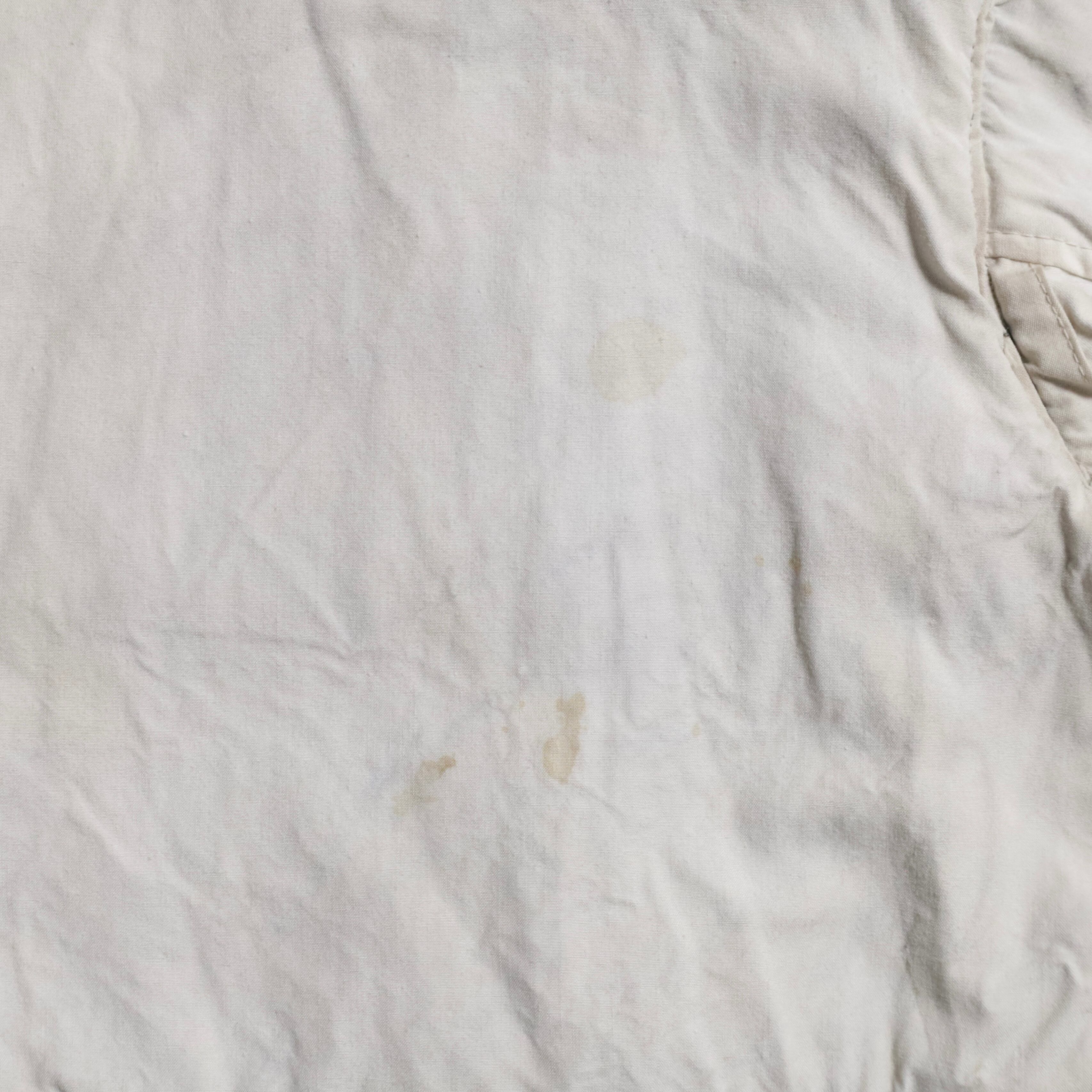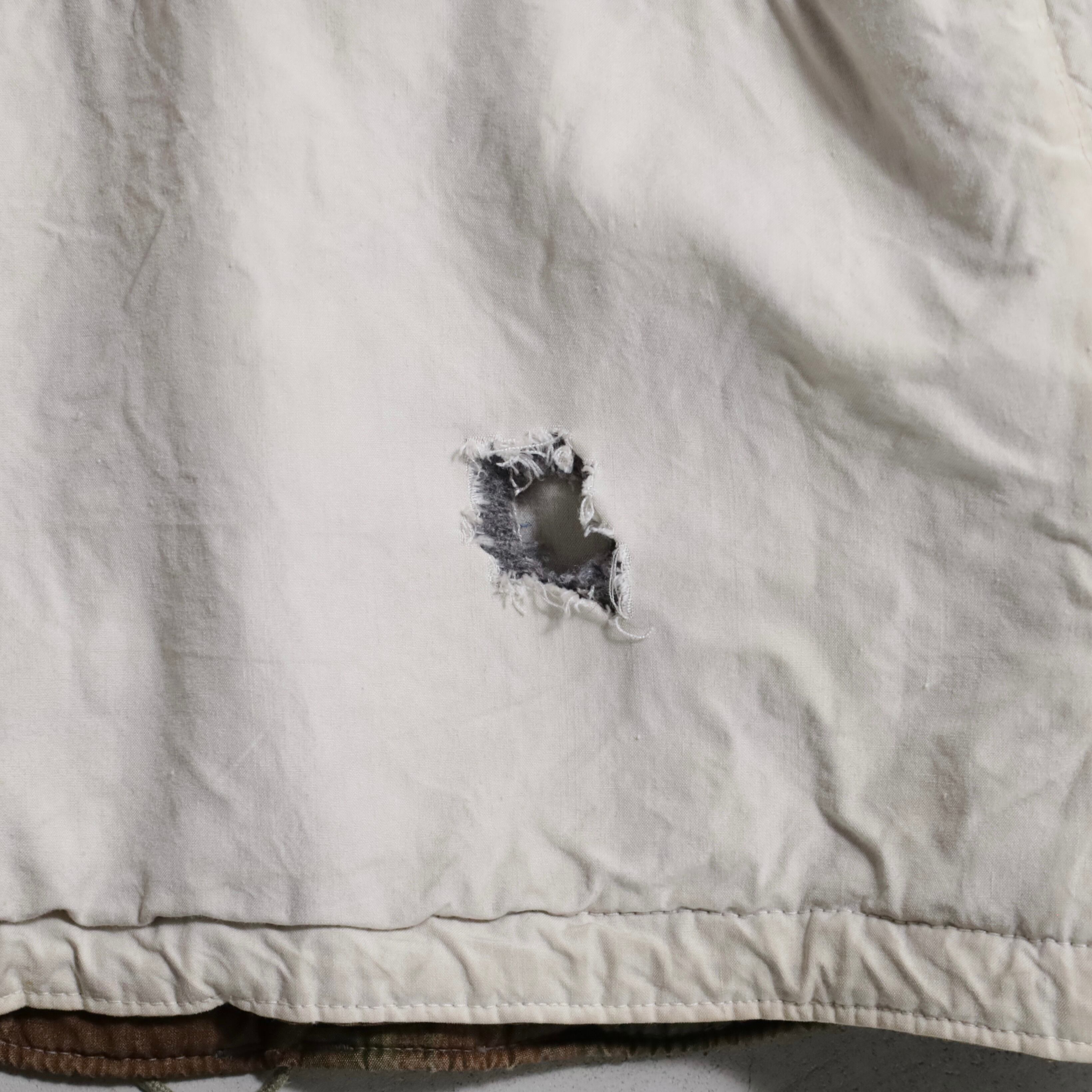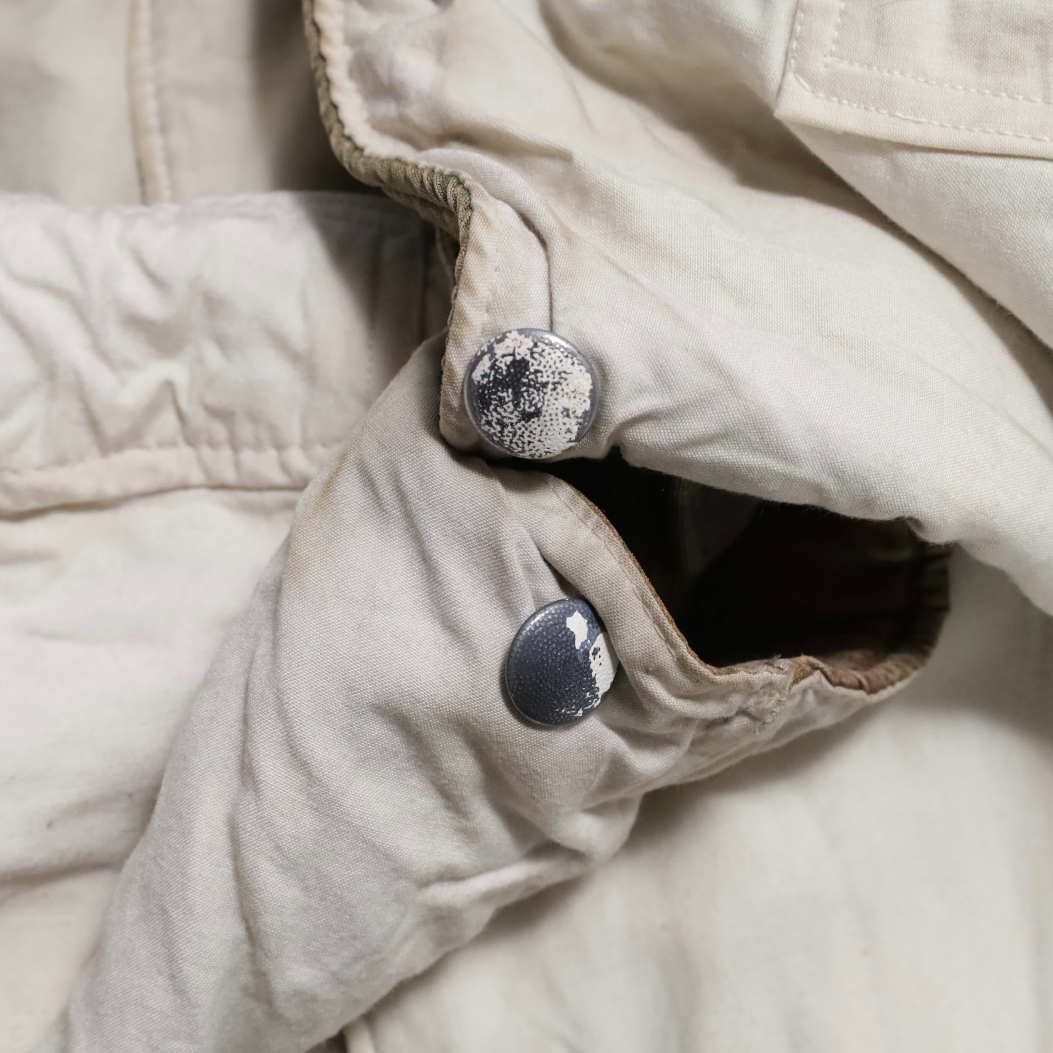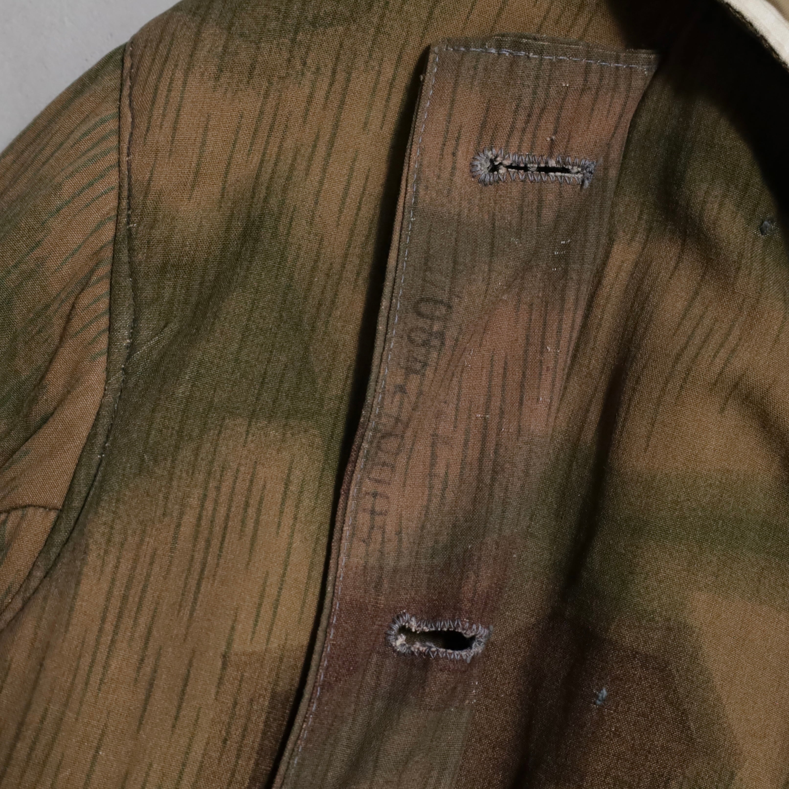 大変希少な第二次大戦期のドイツ軍リバーシブルパーカーを買付できました。スーパーレアピースです。SUMPF(沼地)とTARNMUSTER(迷彩模様)を意味し、沼地迷彩模様としてSUMPFTARNMUSTER(ズンプフタルンムスター)と呼ばれています。SUMPFTARNMUSTERは1943年にSPLITTERMUSTER CAMOにボカシを入れカラーパターンを改良したSUMPFTARNMUSTER 43 CAMOが採用され、1944年に更に改良したSUMPFTARNMUSTER 44 CAMOの2種類が存在し、当該個体は後年の44 CAMOとなります。シェルは恐らくコットンレーヨン混合素材、裏地はスノーカモ(ホワイト)となっています。両面ウエストドローコード付、中綿仕様でかなりずっしりとした重量感です。ファッションとしてデザイン性の高い1着となりますし、コレクターアイテム・アーカイブピースとしても資料価値の高いスペシャルピース、この機会に是非ご検討ください。