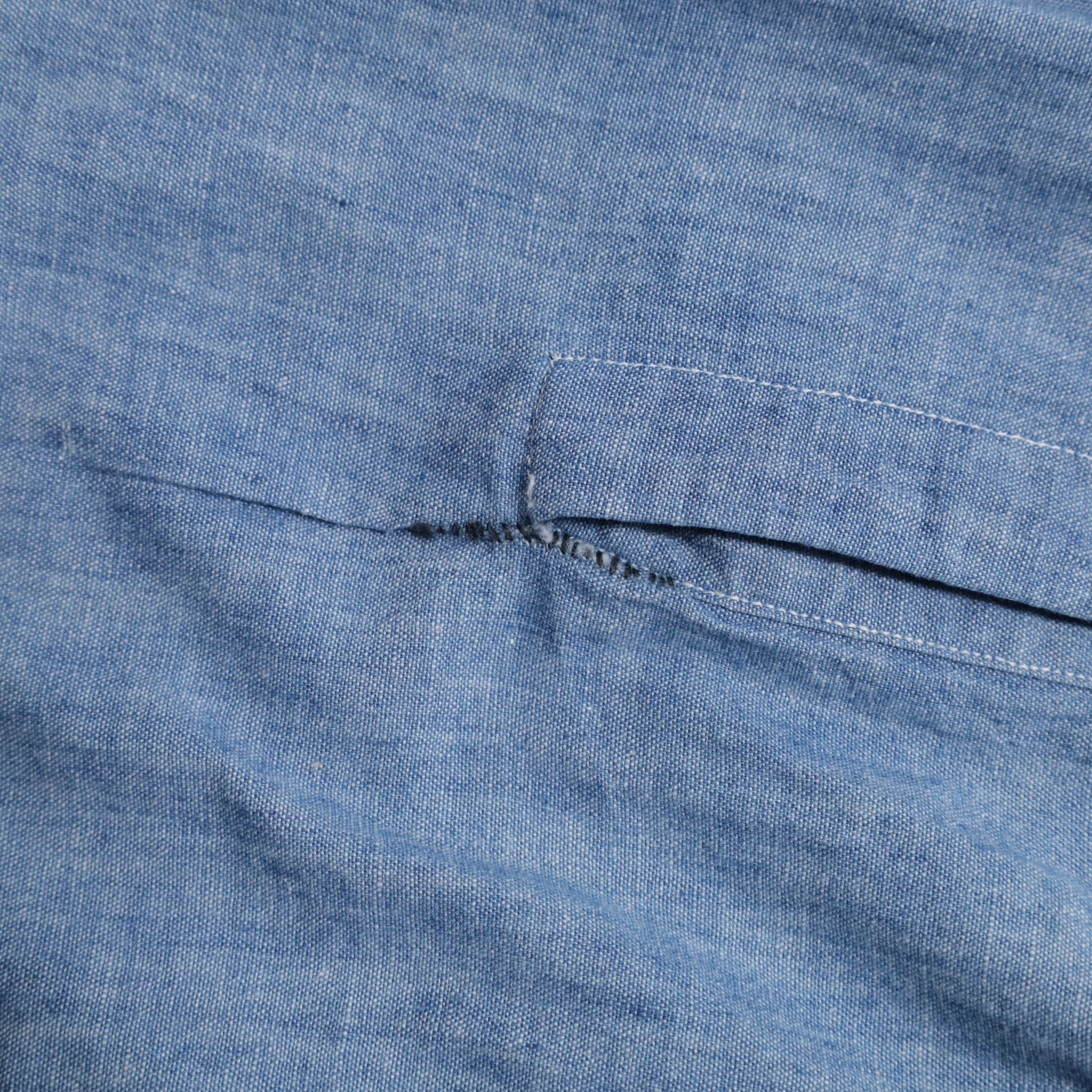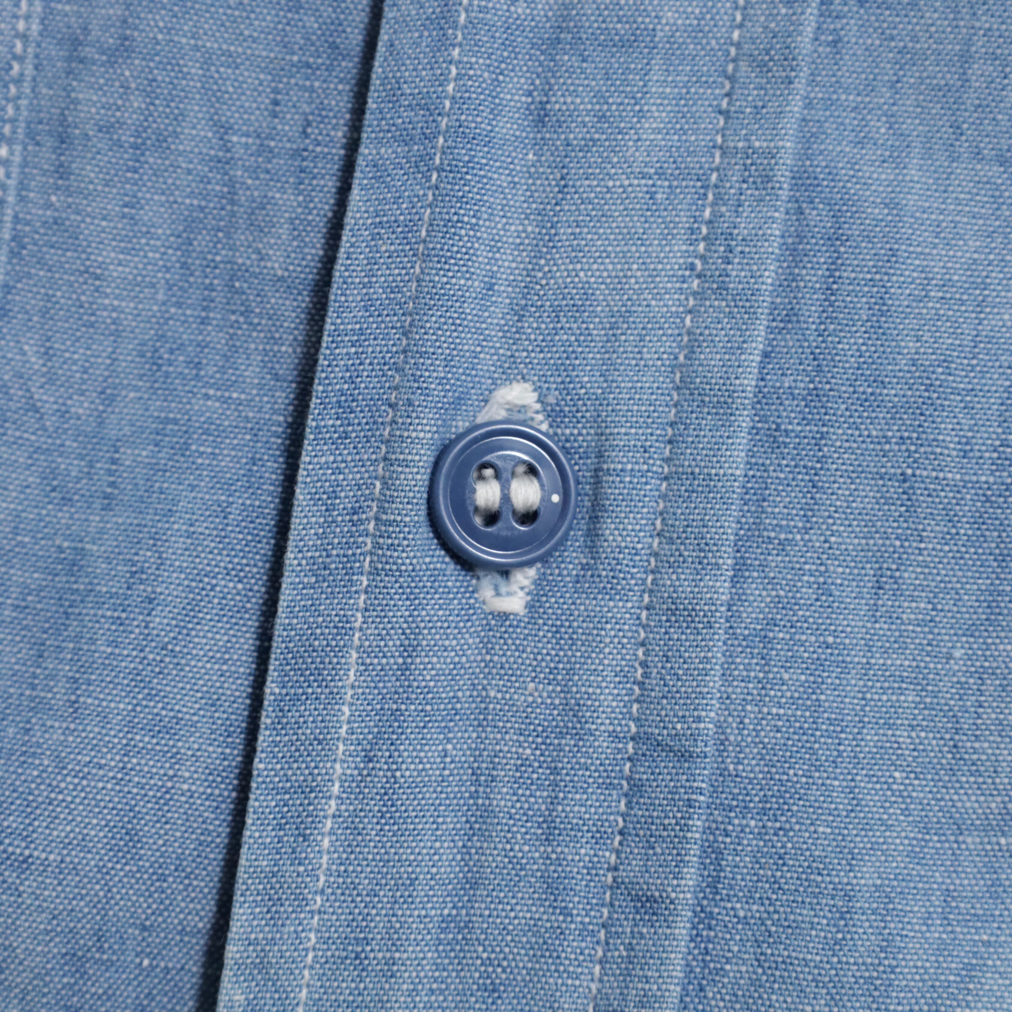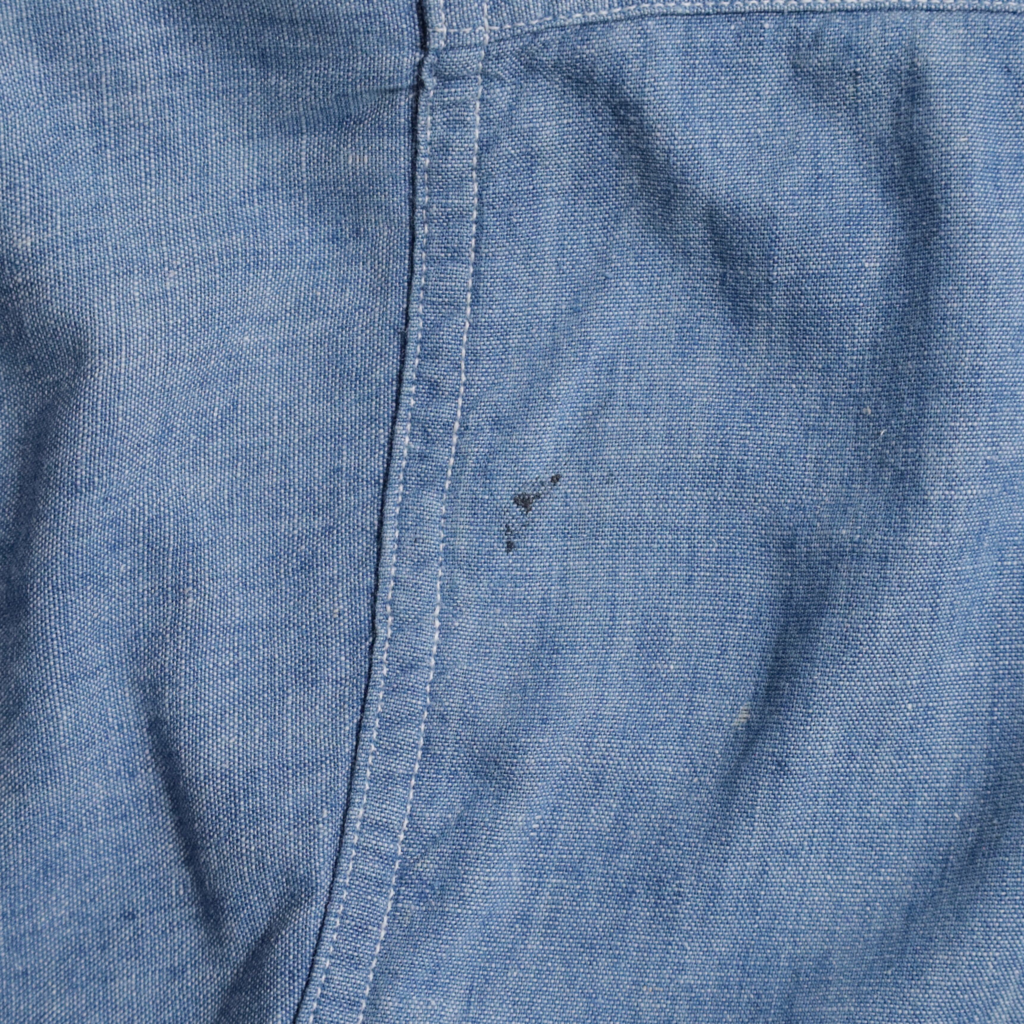 両面ステンシルがはっきりと残るシャンブレーシャツ、グッドコンディションで買付できました。襟元のコントラクトも薄らと確認できます。襟シングルステッチ・台襟あり・マチ付の良いディテールですね。何よりも両面ステンシルが最高です。サラッと羽織ってもかっこいいですしインナーとしても重宝しますのでおすすめですよ。この機会に是非ご検討ください。