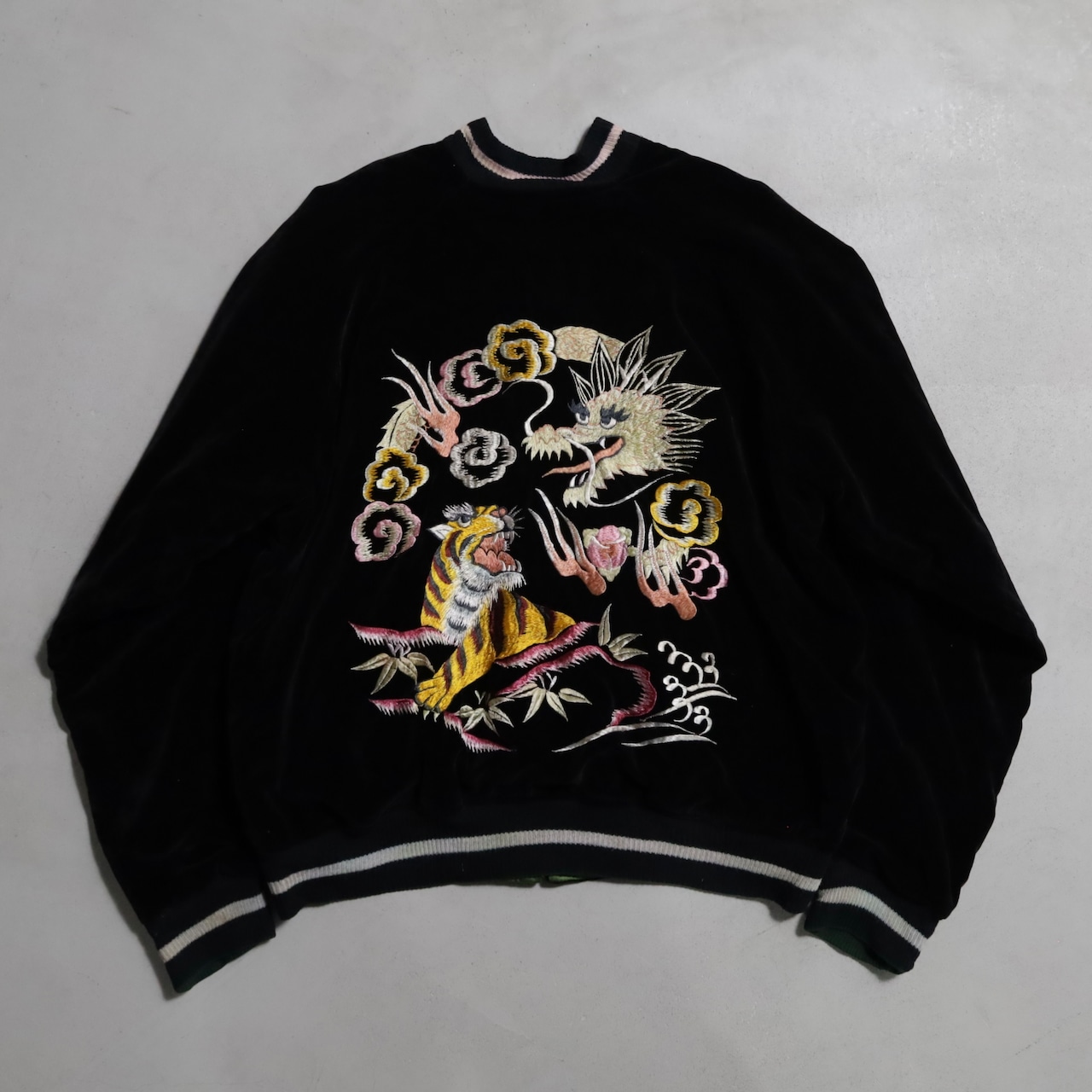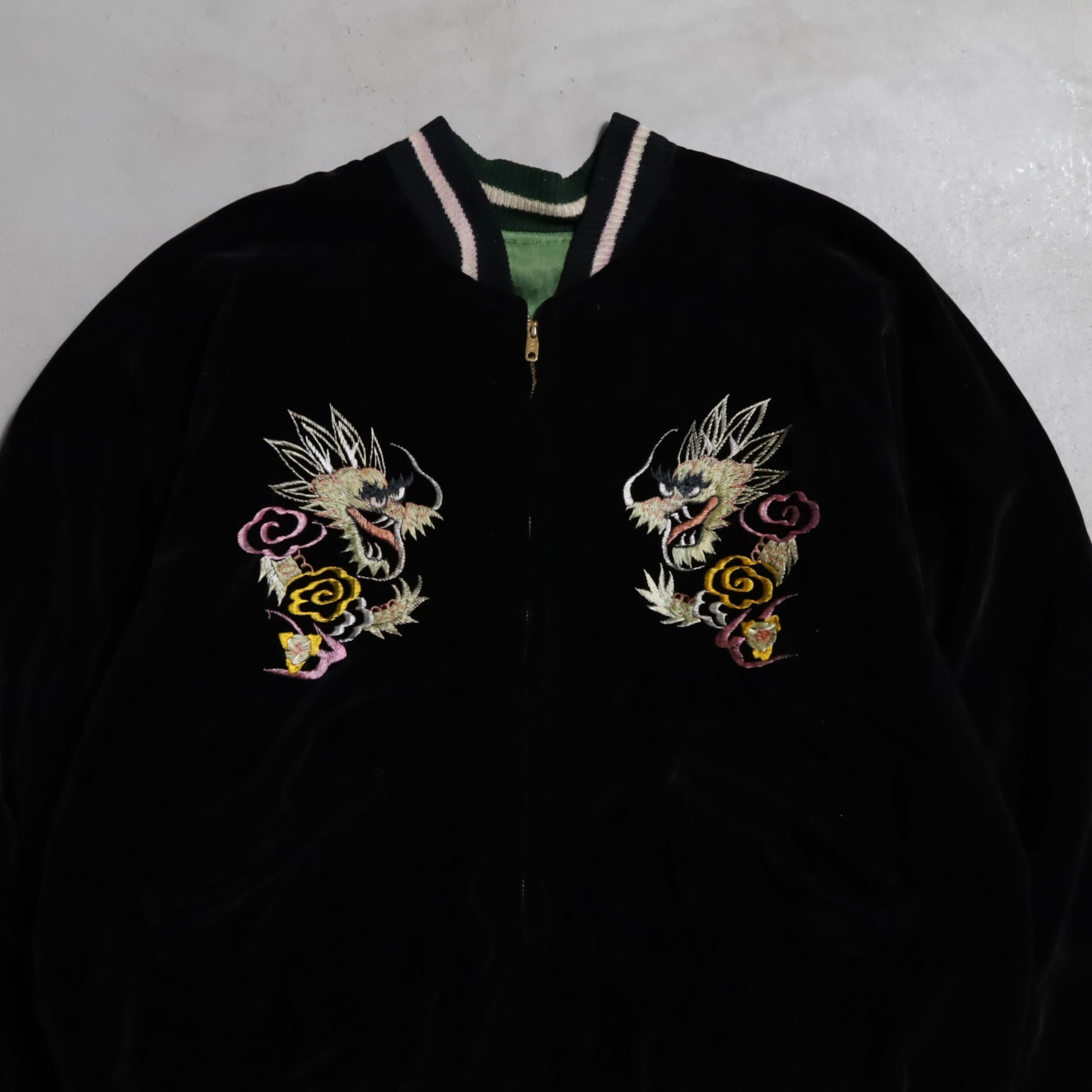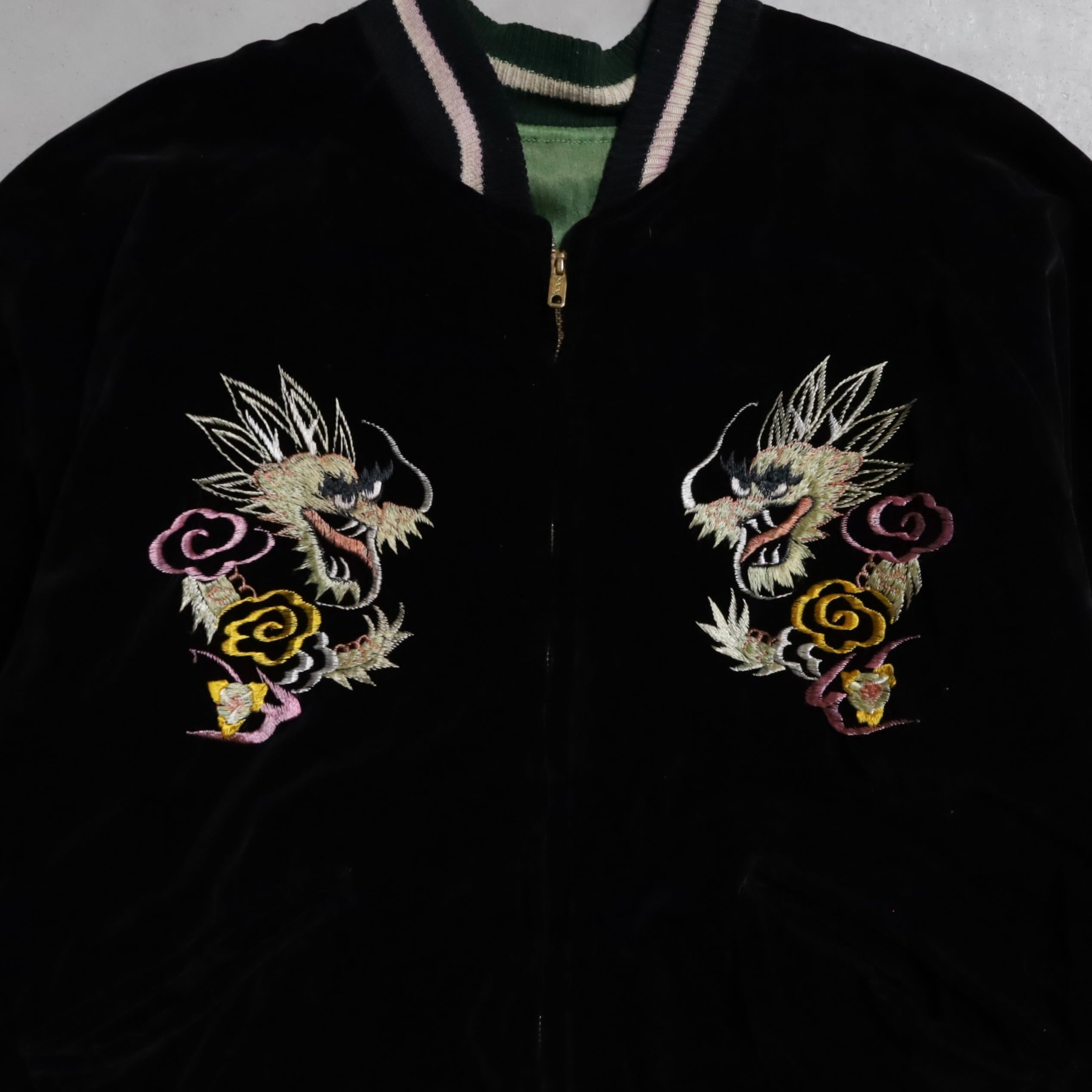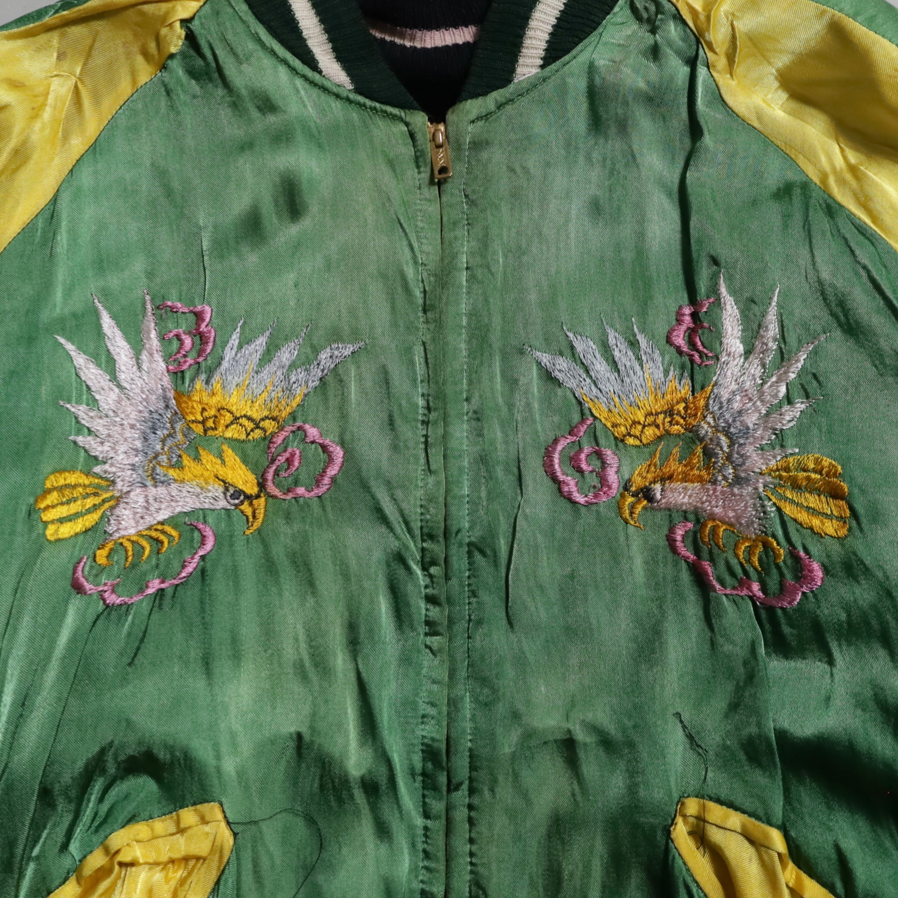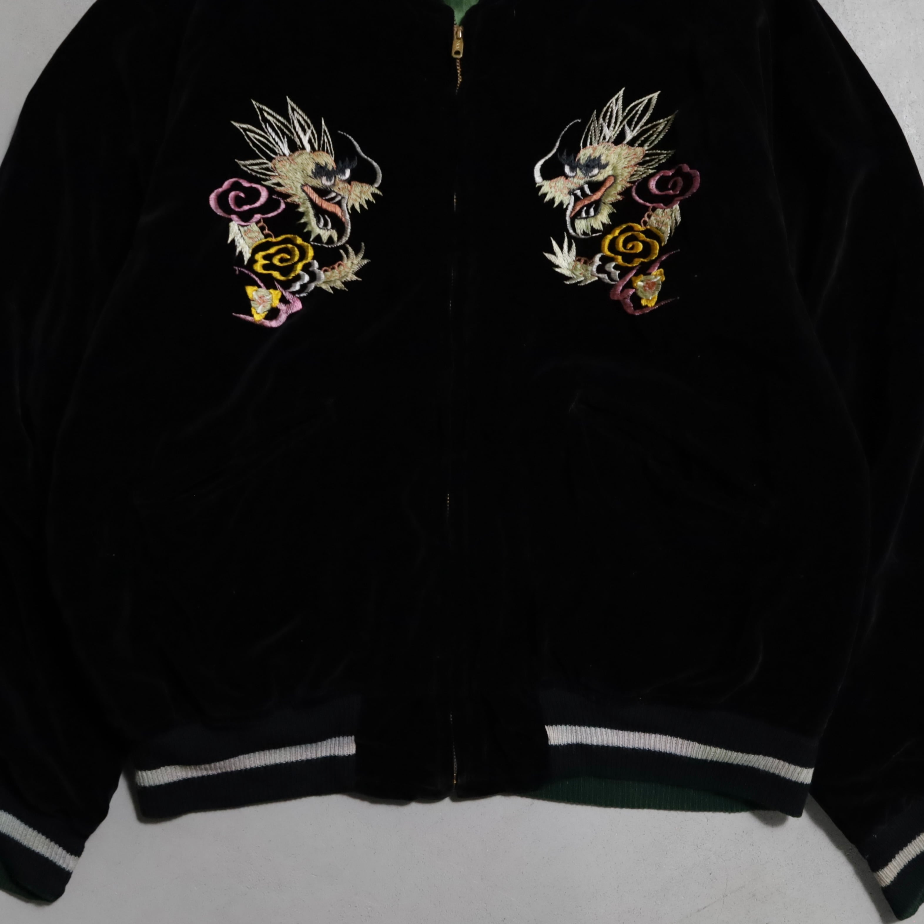 ニーズの高い黒別珍のビッグサイズスカジャンを買い付けできました。グッドコンディションです。黒別珍/グリーン×イエローサテン。A面は龍と虎、B面は鷹のハイグレードな刺繍、良い構図ですね。黒別珍に175/60でしっかりと着用できるサイズ、最高です。アメリカ本国でもスーベニアや刺繍一点物は変わらず評価が高く、このような希少個体は益々評価されていきます。所有満足度の高い逸品、この機会に是非ご検討ください。