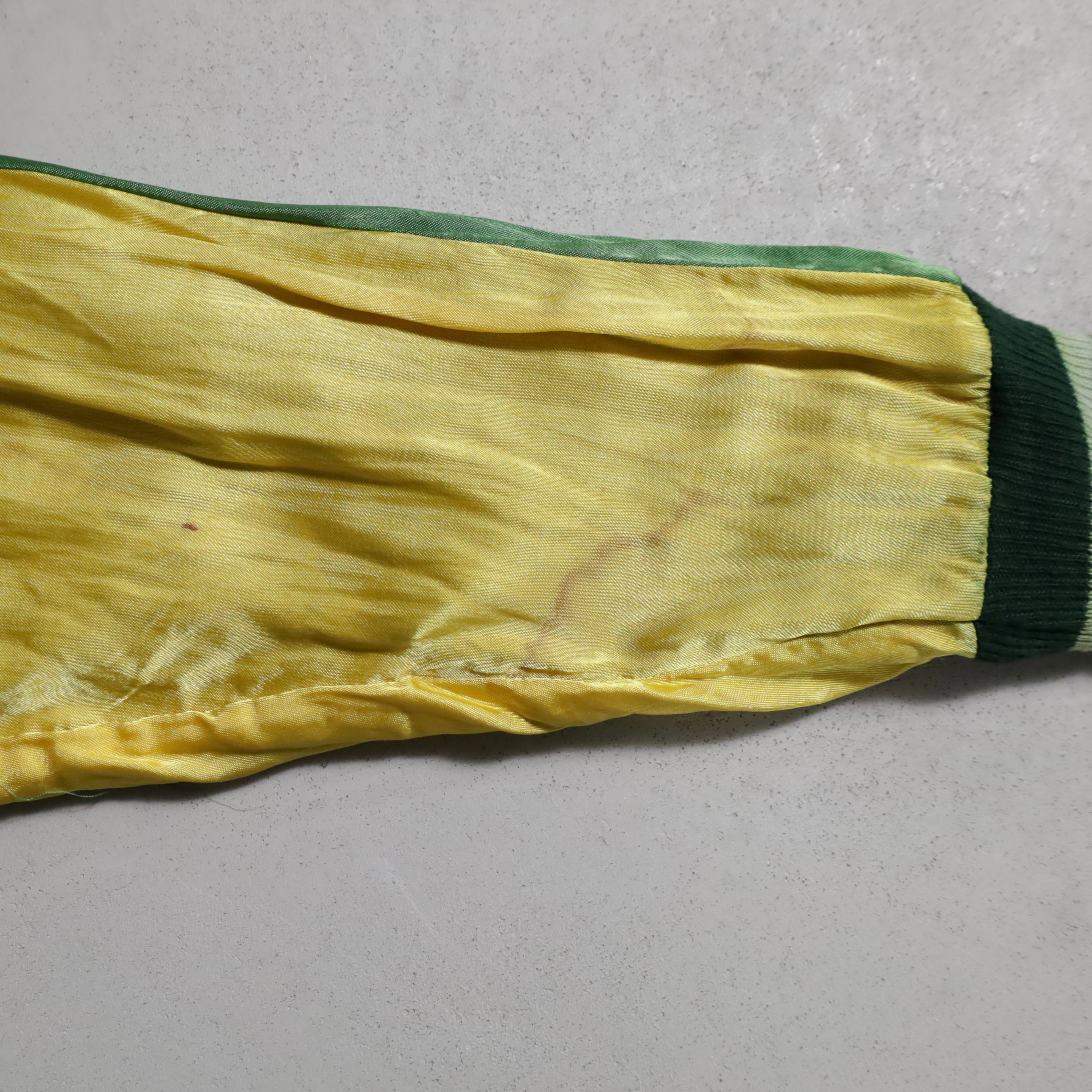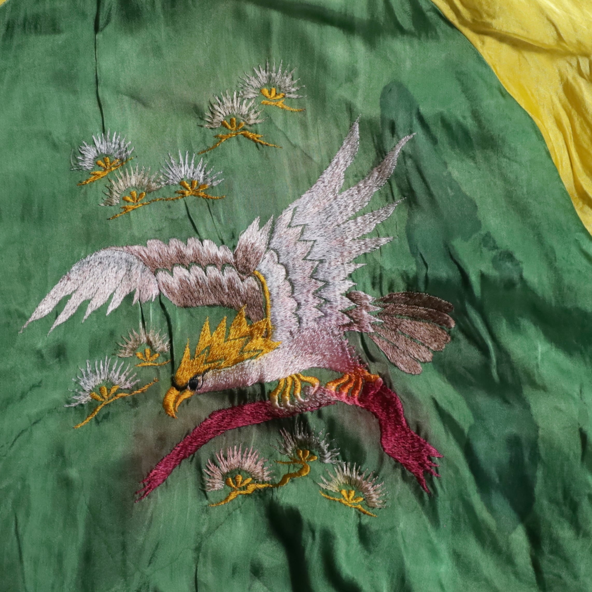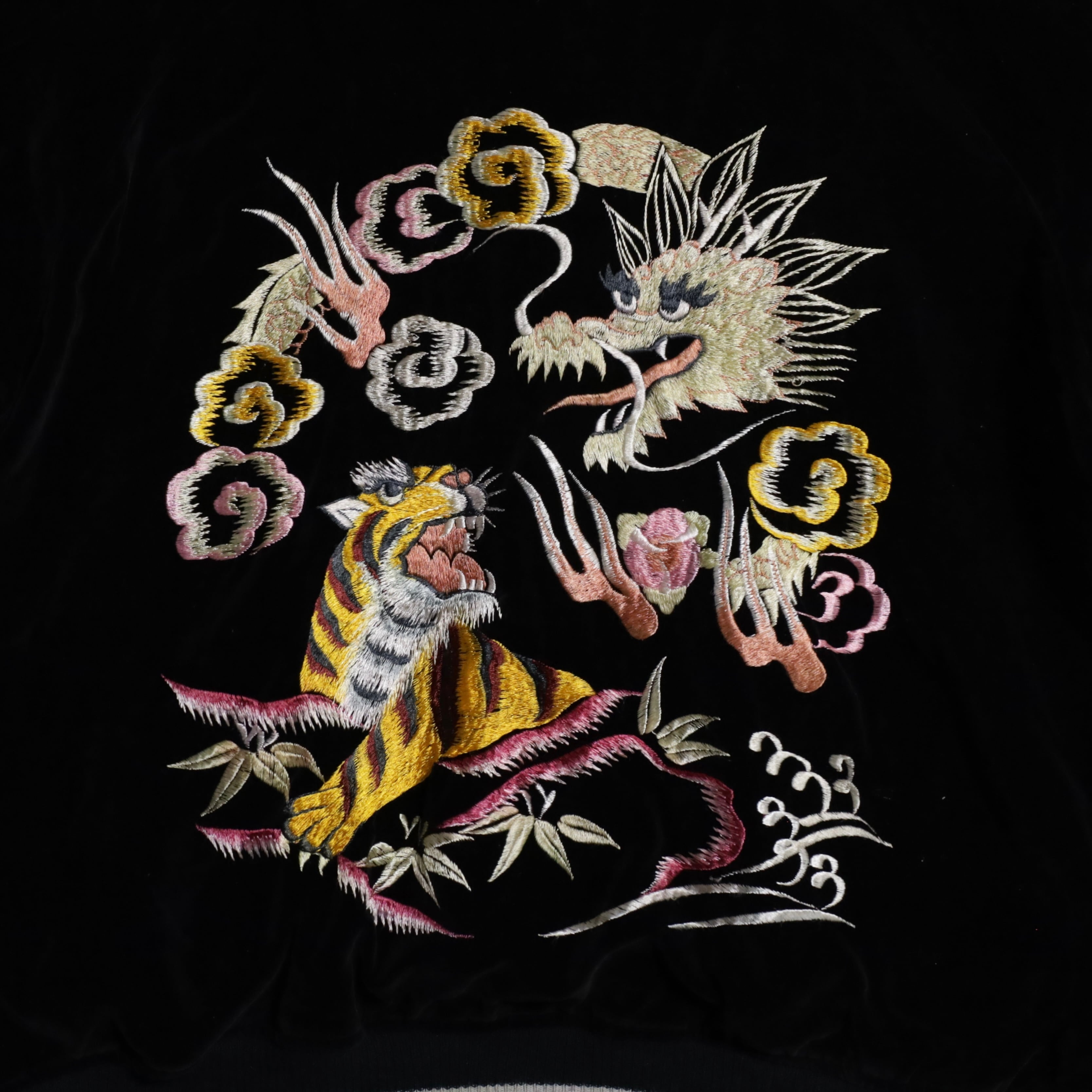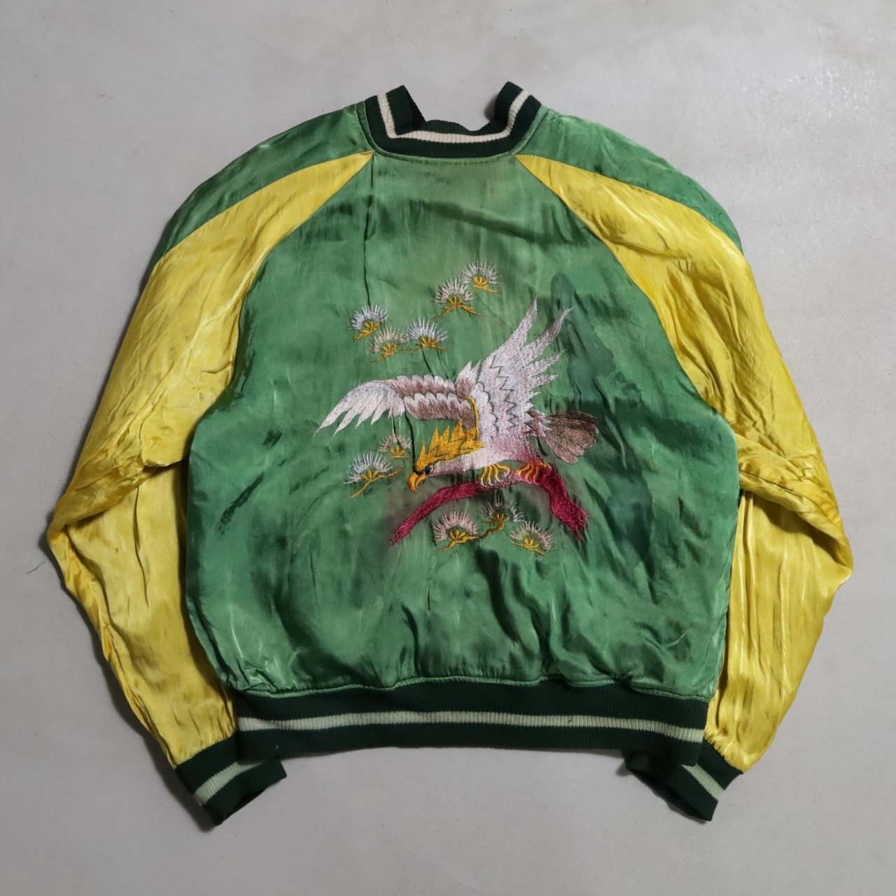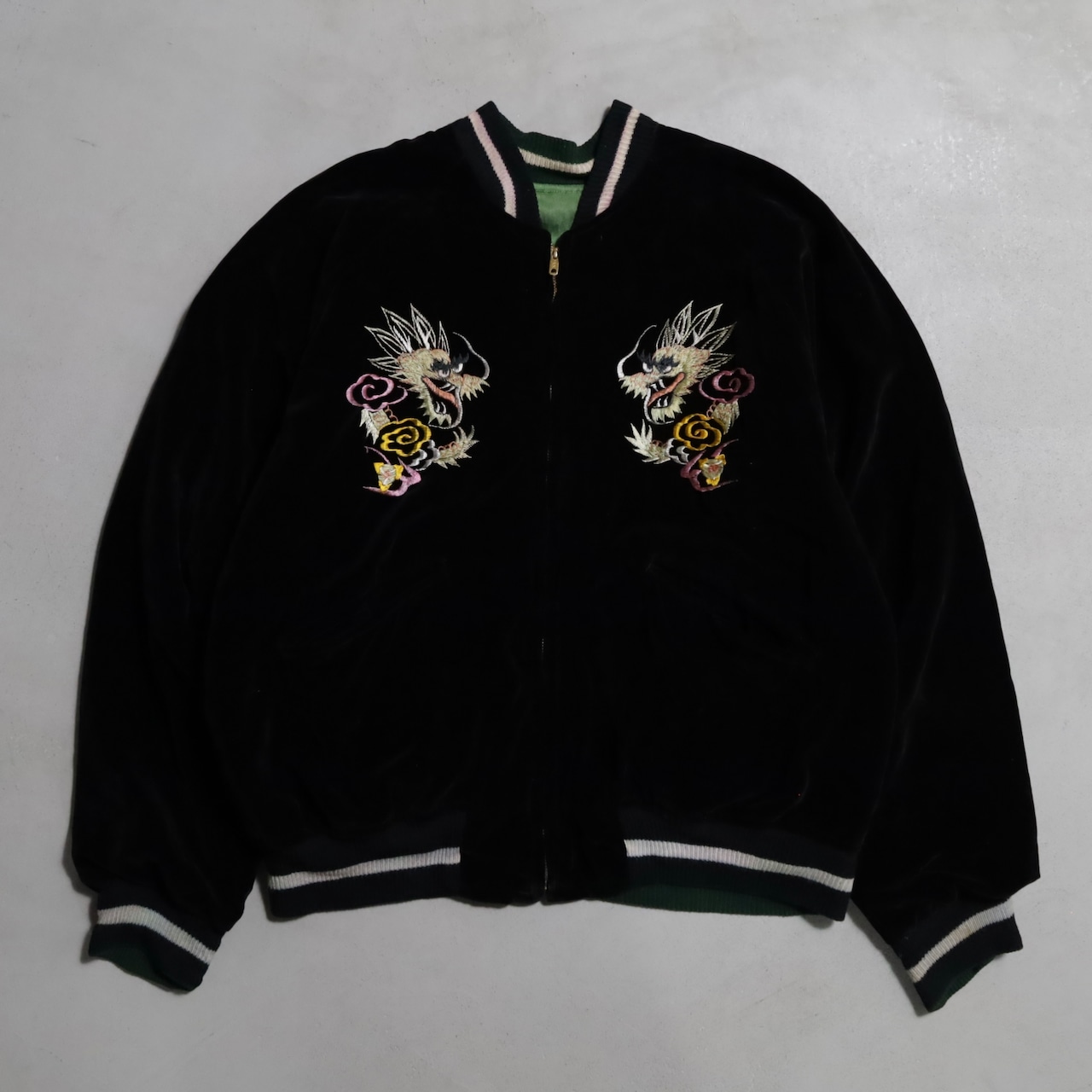 ニーズの高い黒別珍のビッグサイズスカジャンを買い付けできました。グッドコンディションです。黒別珍/グリーン×イエローサテン。A面は龍と虎、B面は鷹のハイグレードな刺繍、良い構図ですね。黒別珍に175/60でしっかりと着用できるサイズ、最高です。アメリカ本国でもスーベニアや刺繍一点物は変わらず評価が高く、このような希少個体は益々評価されていきます。所有満足度の高い逸品、この機会に是非ご検討ください。