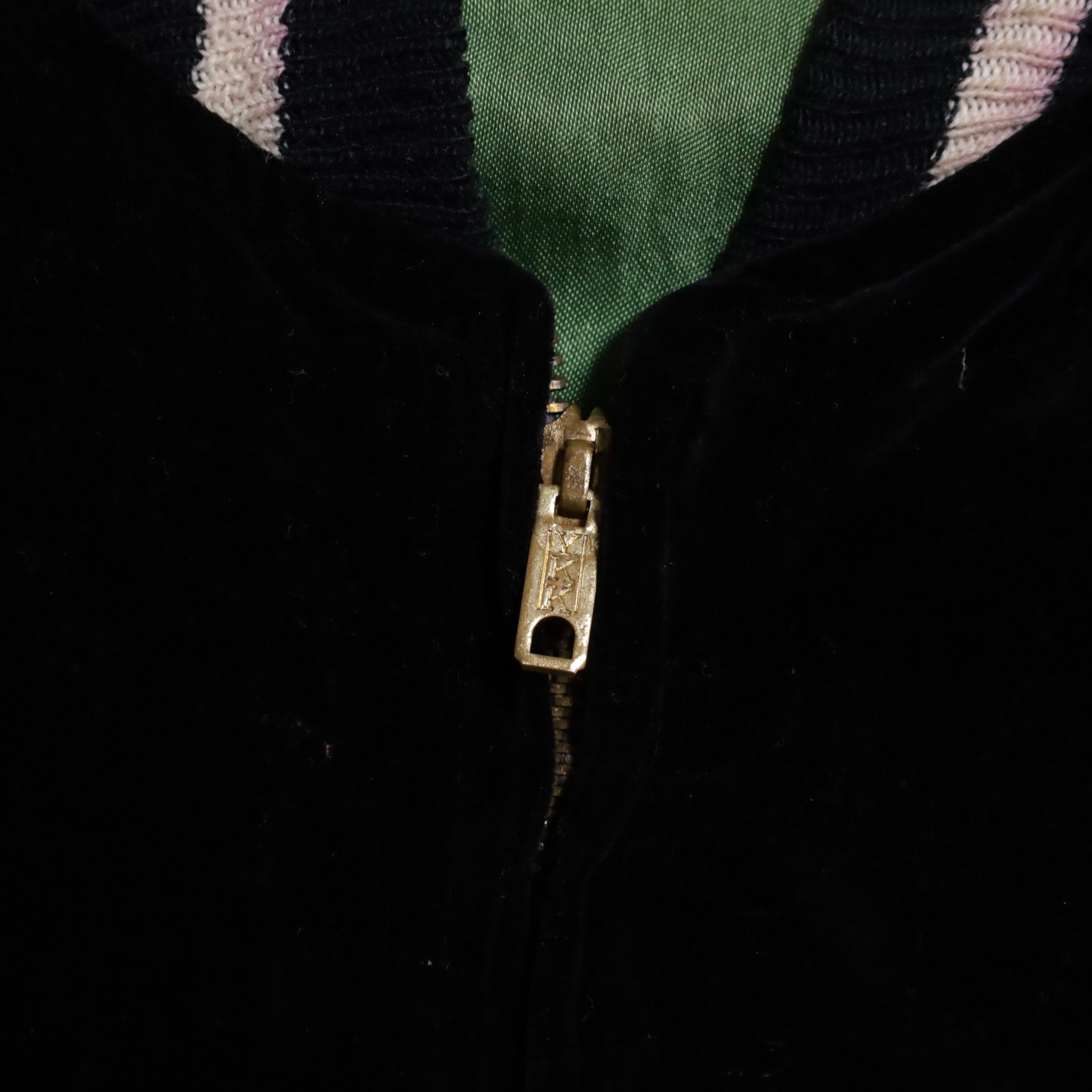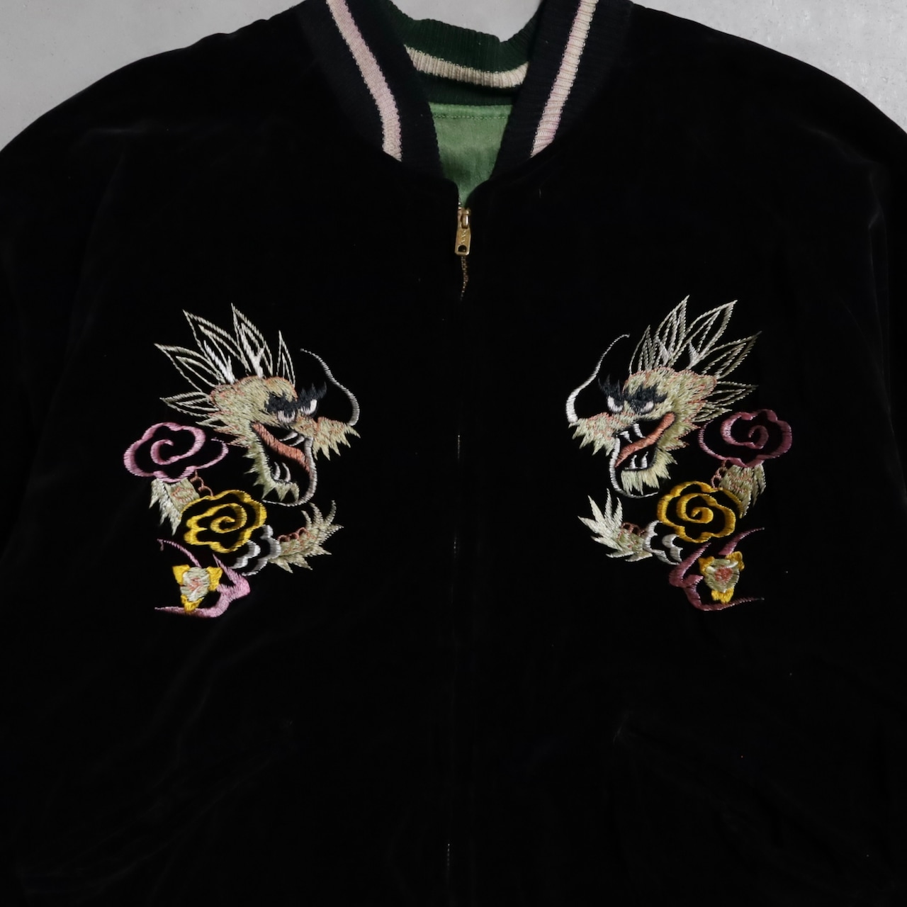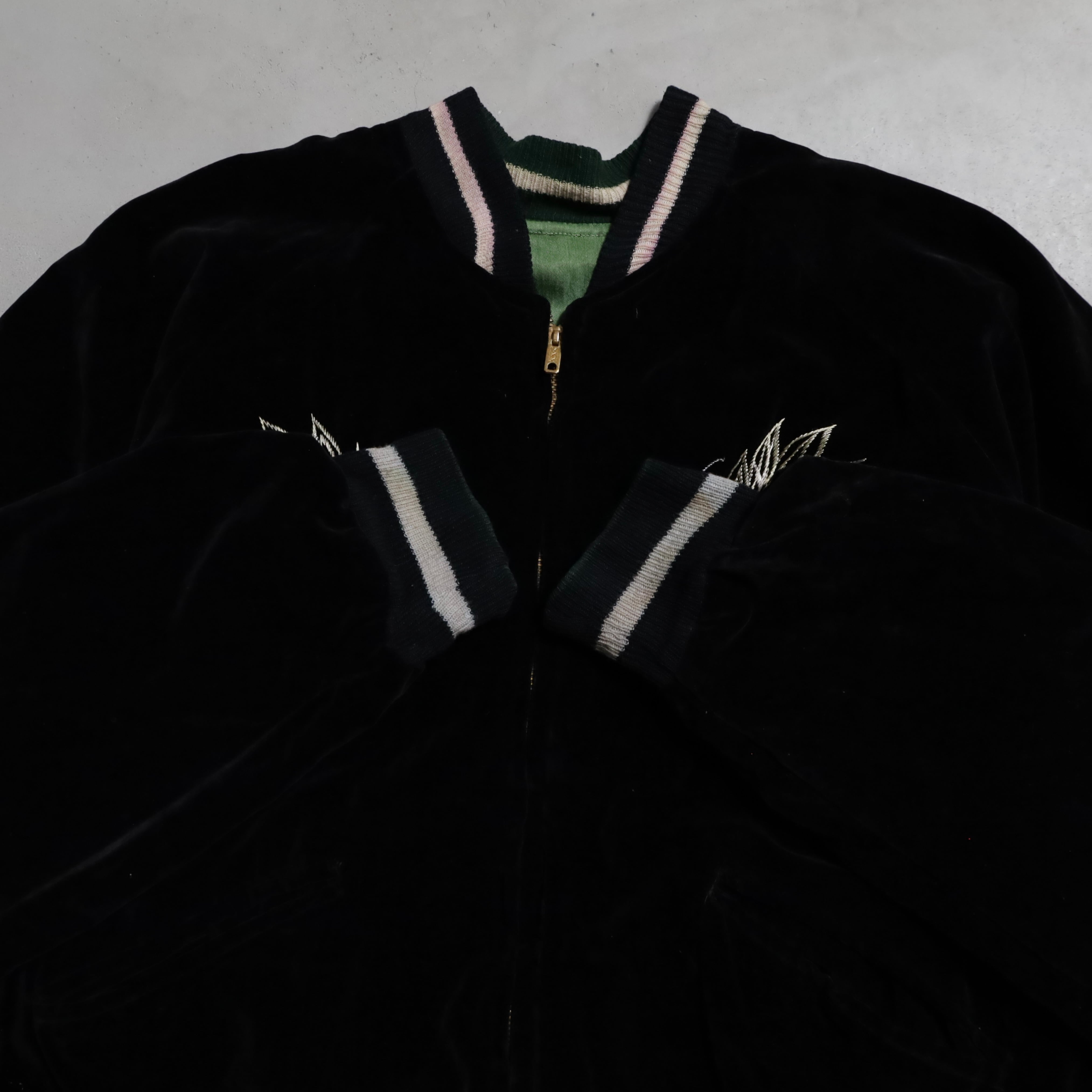 状態 目立った傷や汚れがない A面(黒別珍) 襟・袖のリブラインに僅かに赤色の色移りあり、袖に僅かに薄汚れあり、右肩・左袖に僅かに擦れあり/B面(サテン) 全体的に薄汚れあり、刺繍に僅かに赤色の色移りあり、右肩付近・刺繍付近・袖に薄汚れあり、右肩付近にのステッチにほつれあり、裾のリブラインに僅かに緑色の色移りあり