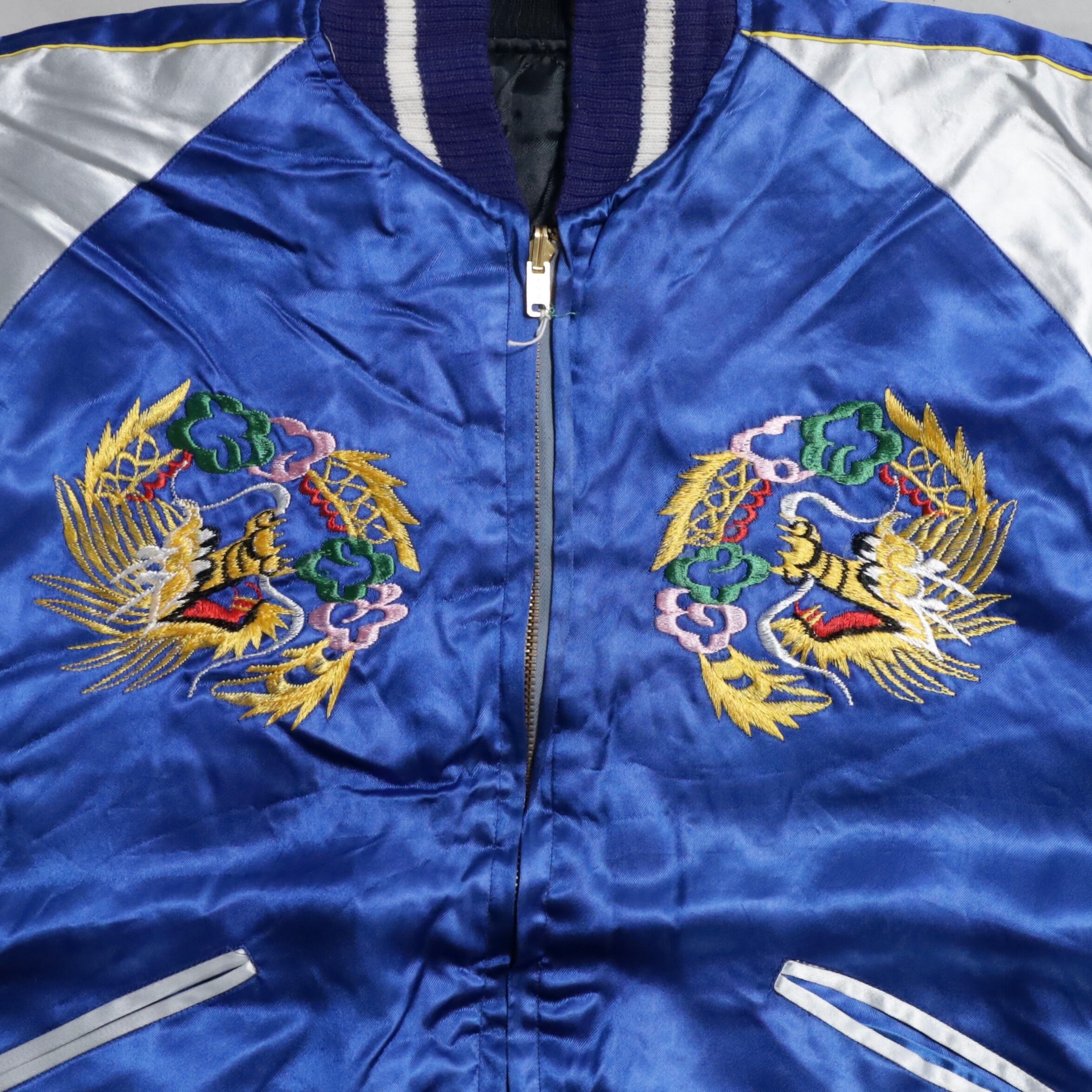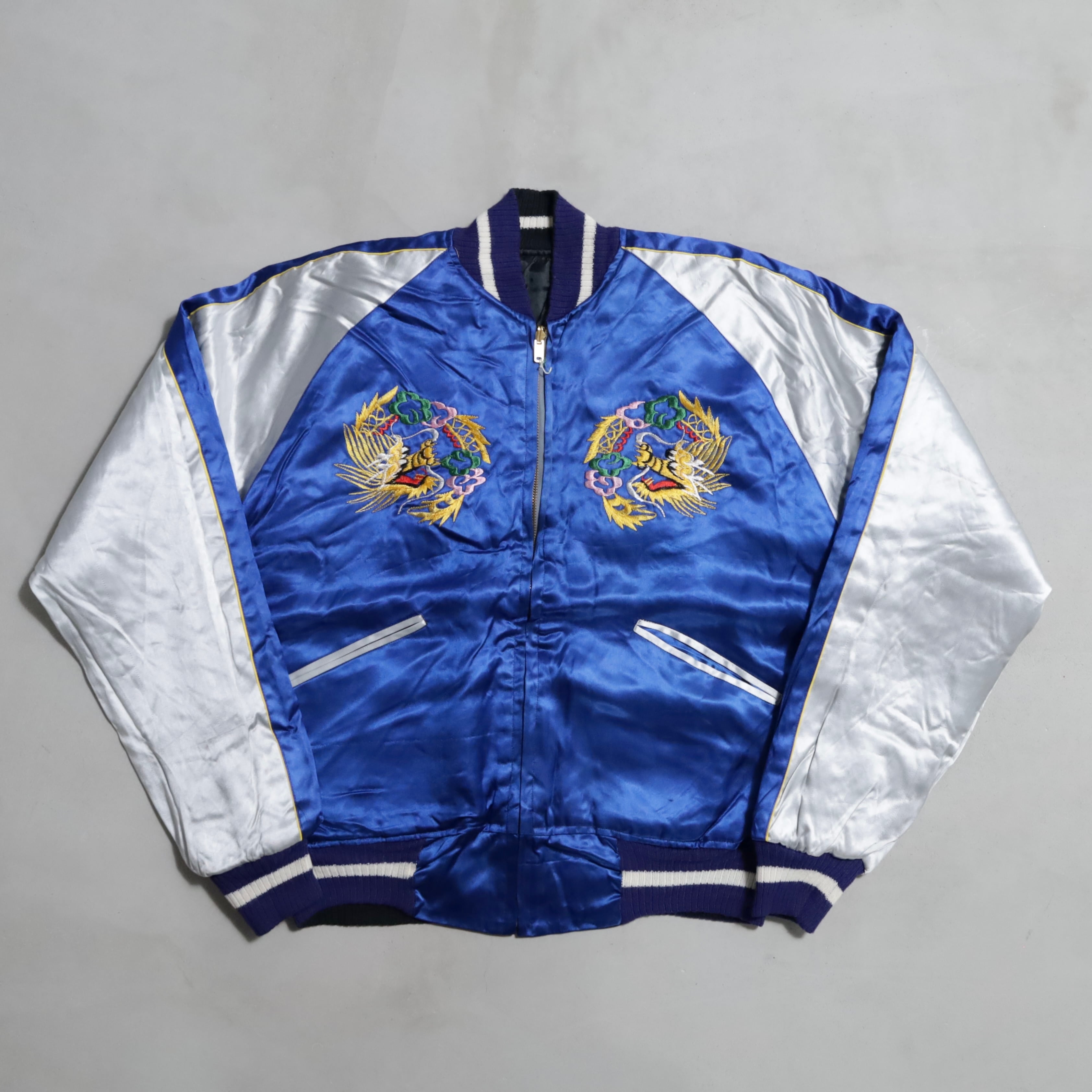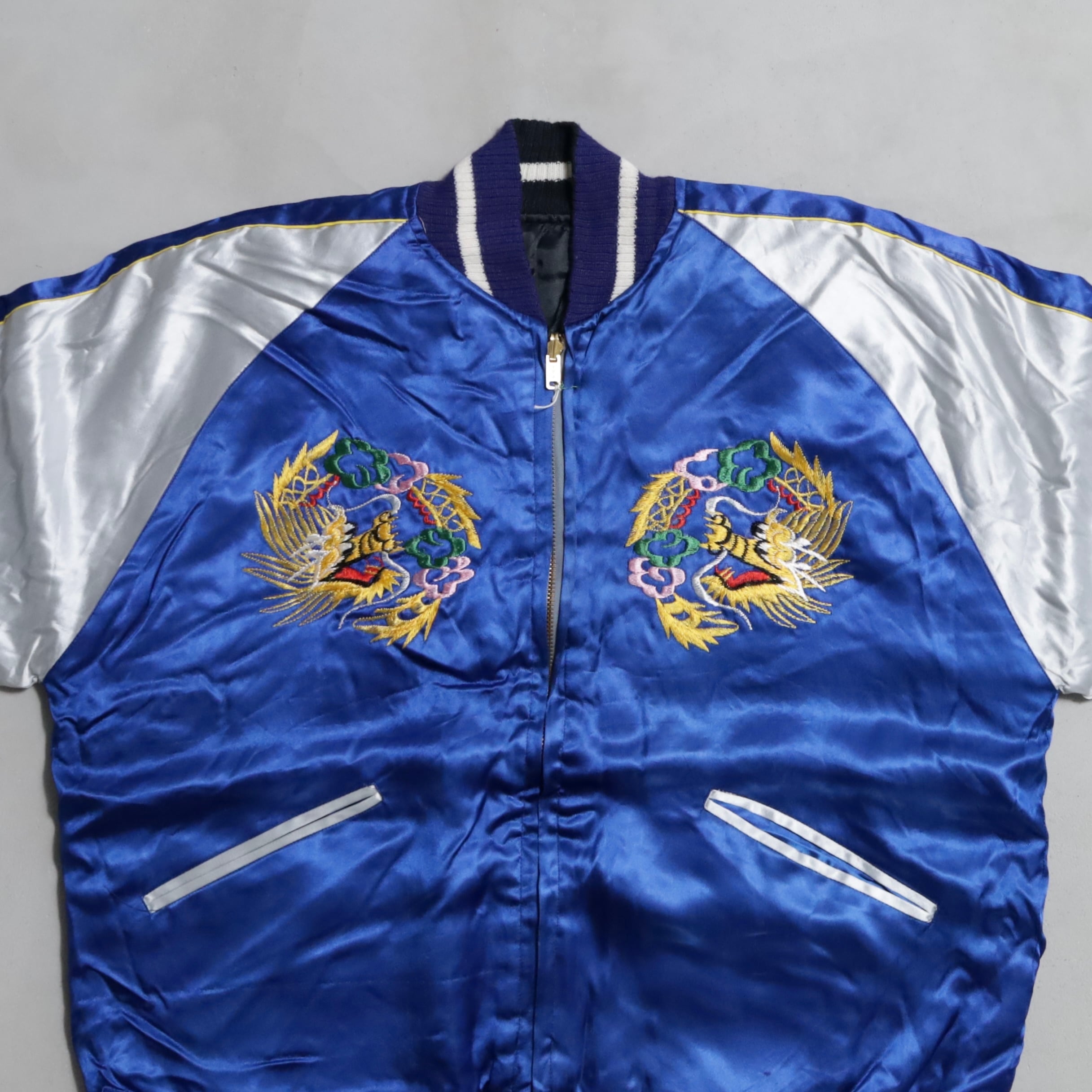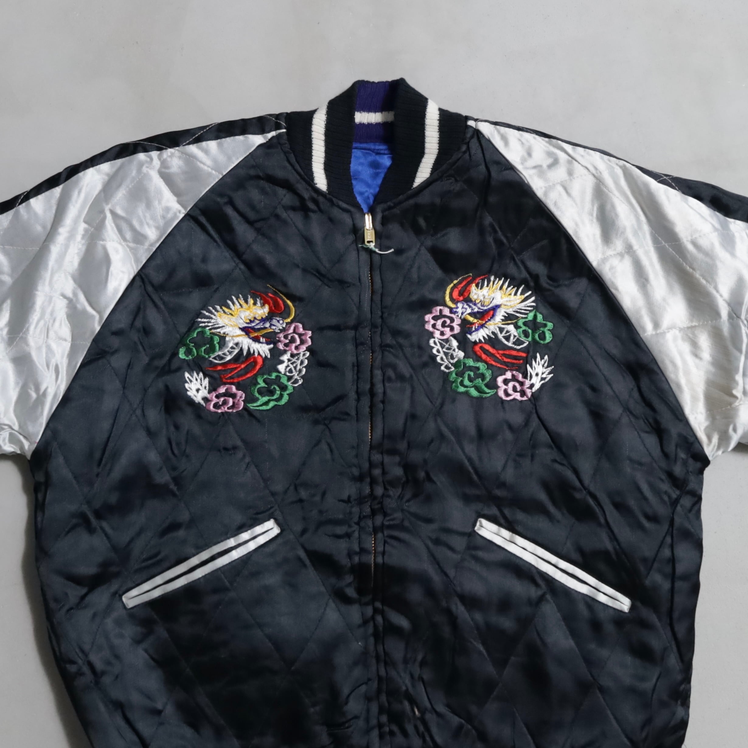 希少なサイズタグも残っています。ブルーサテン/ブラックサテン、A面は両胸龍×背面龍、日本地図、富士山/B面は両胸龍×背面虎のハイグレードな刺繍が目を惹きますね。実寸で身幅57cmのビッグサイズも魅力です。デッドストックとなると満足感も変わってくると思いますし、コレクションとしてもおすすめのグッドピース。この機会に是非ご検討ください。