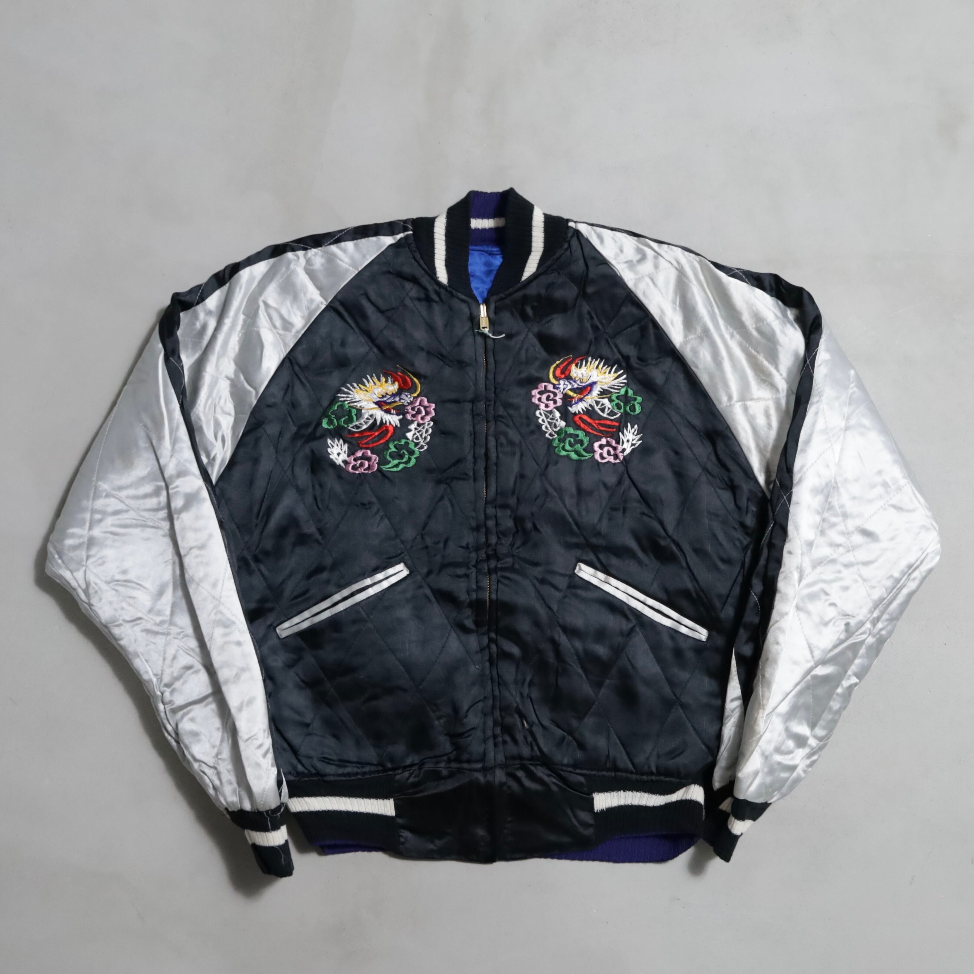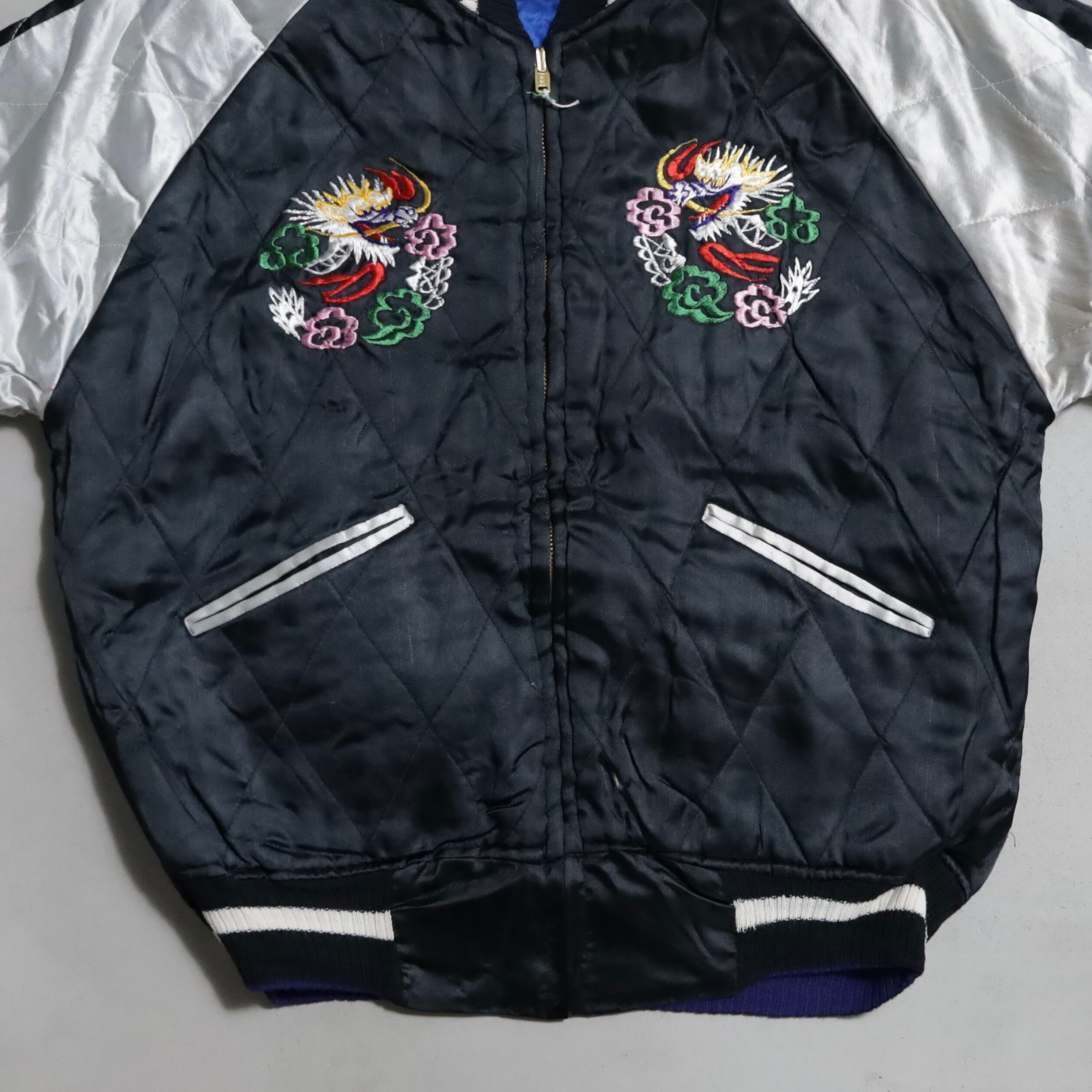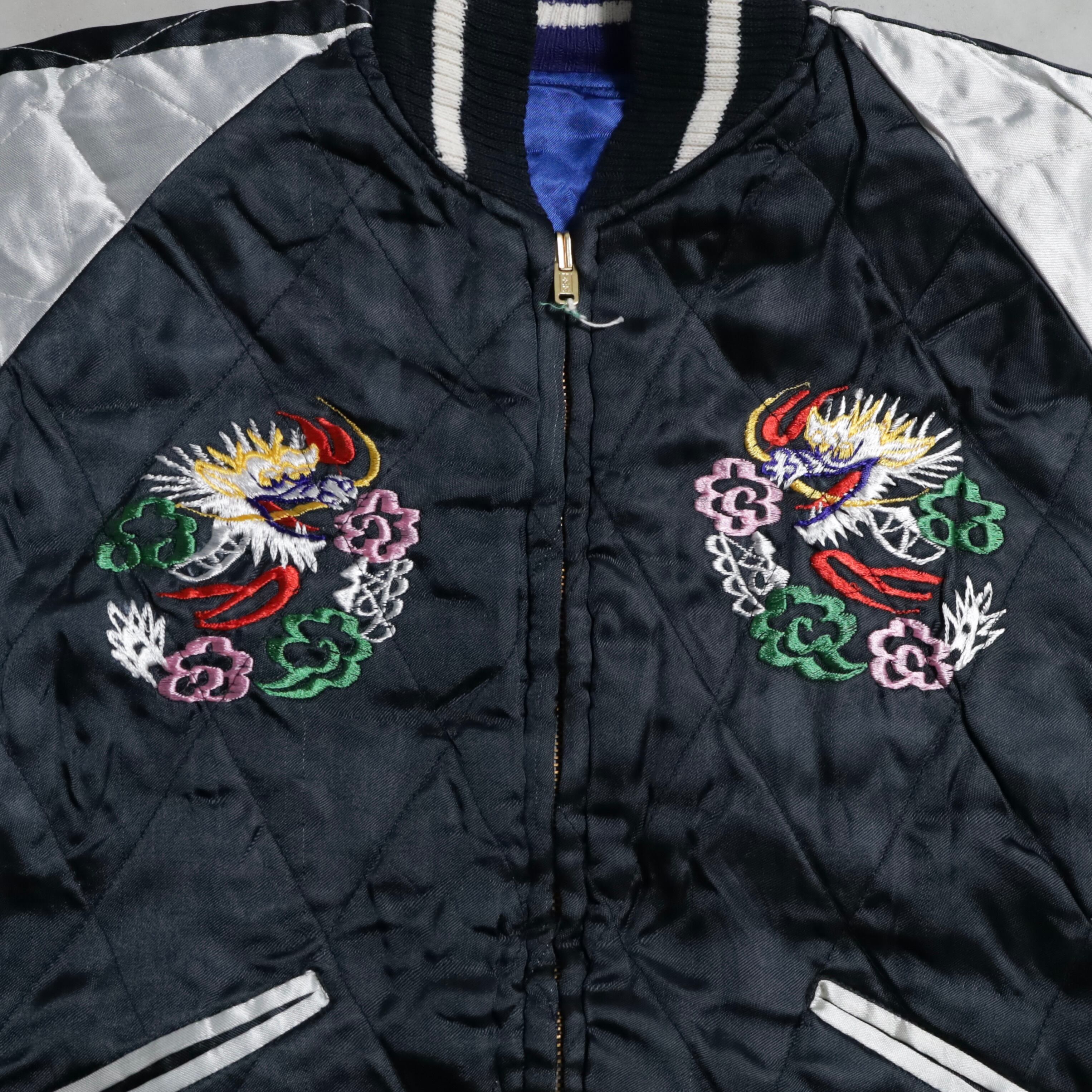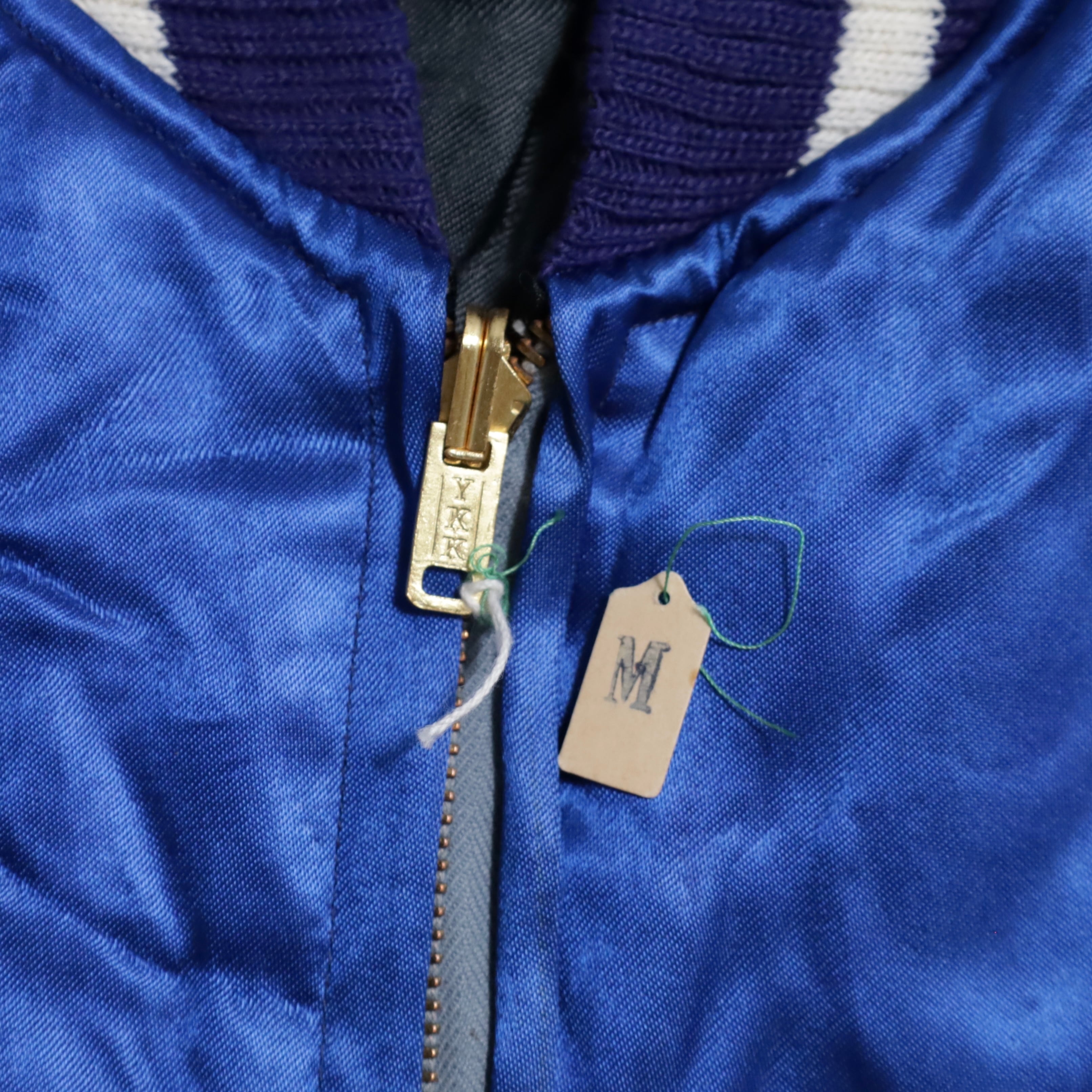 希少なサイズタグも残っています。ブルーサテン/ブラックサテン、A面は両胸龍×背面龍、日本地図、富士山/B面は両胸龍×背面虎のハイグレードな刺繍が目を惹きますね。実寸で身幅57cmのビッグサイズも魅力です。デッドストックとなると満足感も変わってくると思いますし、コレクションとしてもおすすめのグッドピース。この機会に是非ご検討ください。