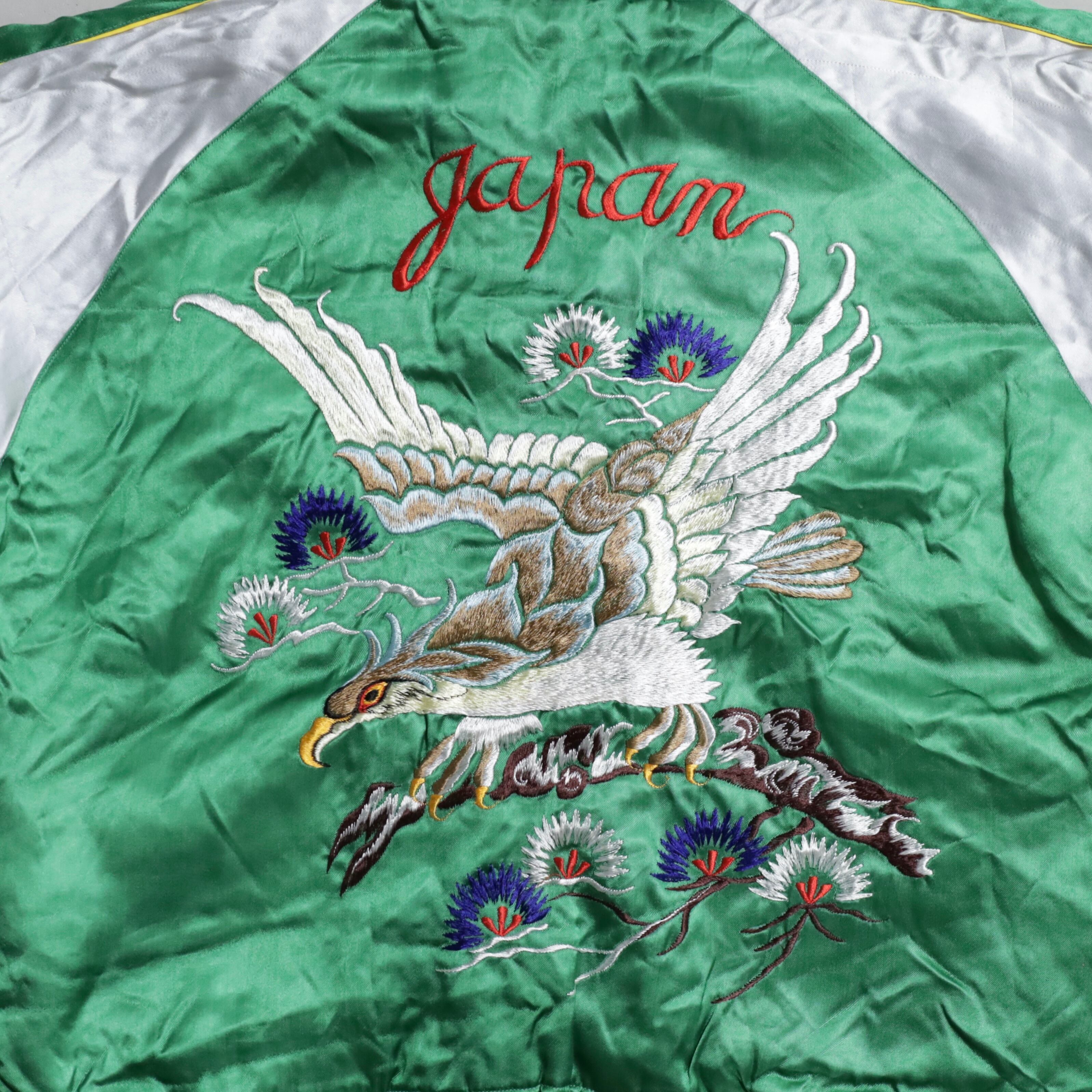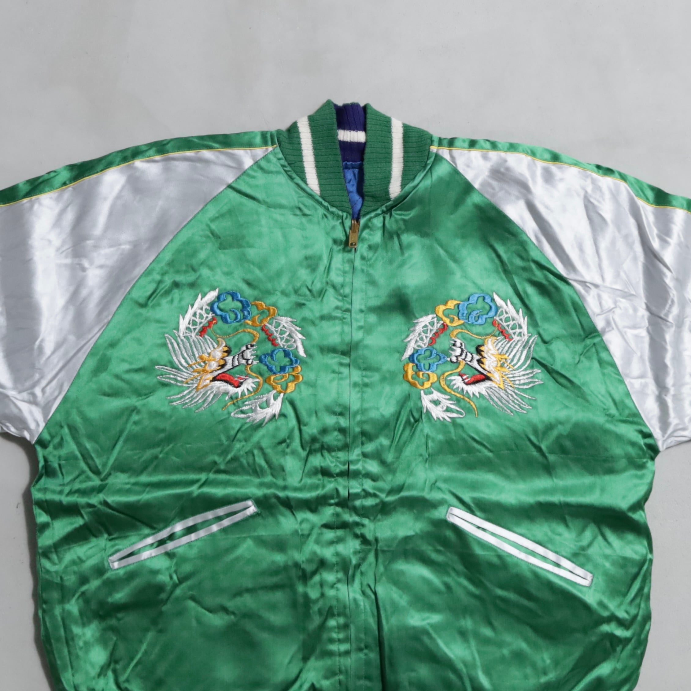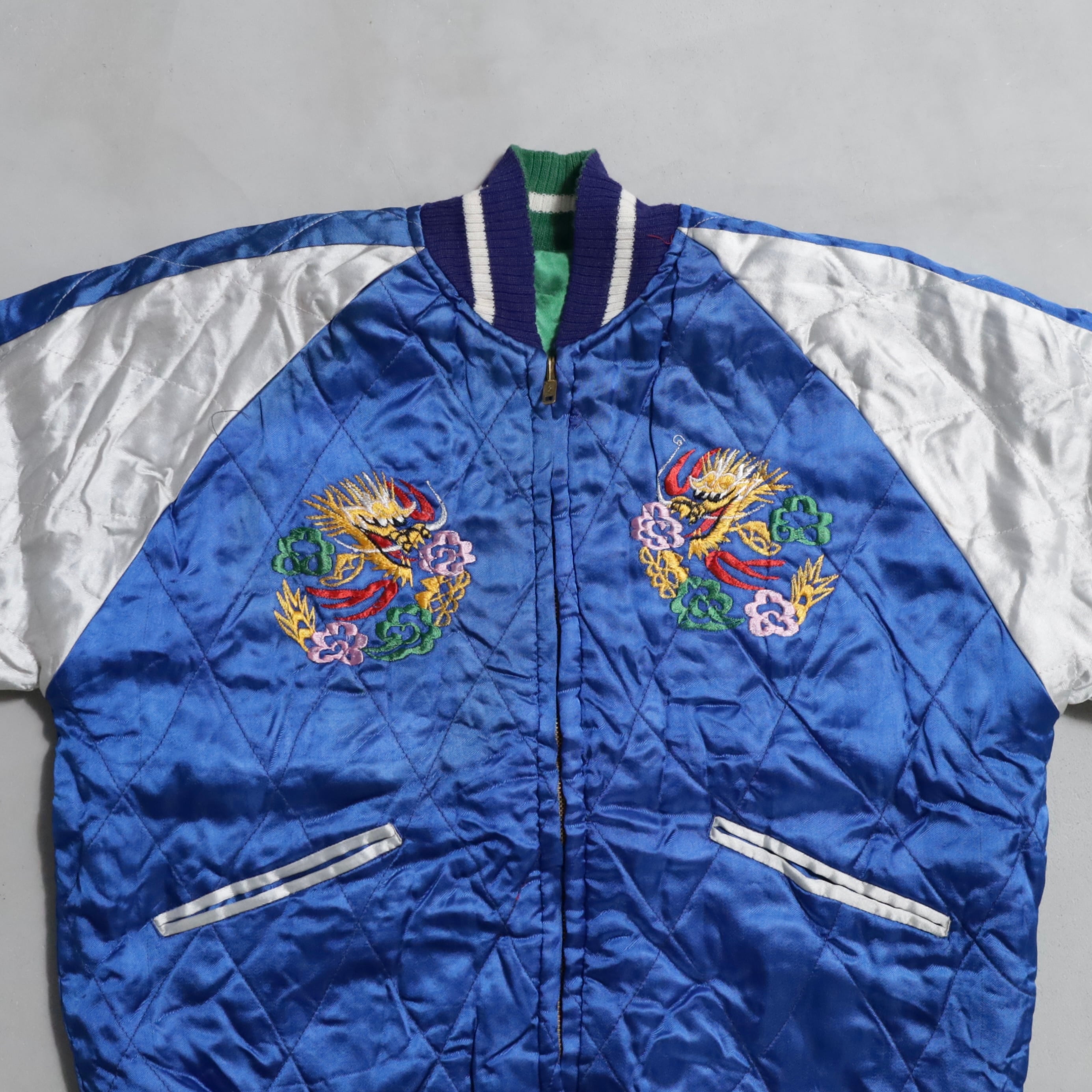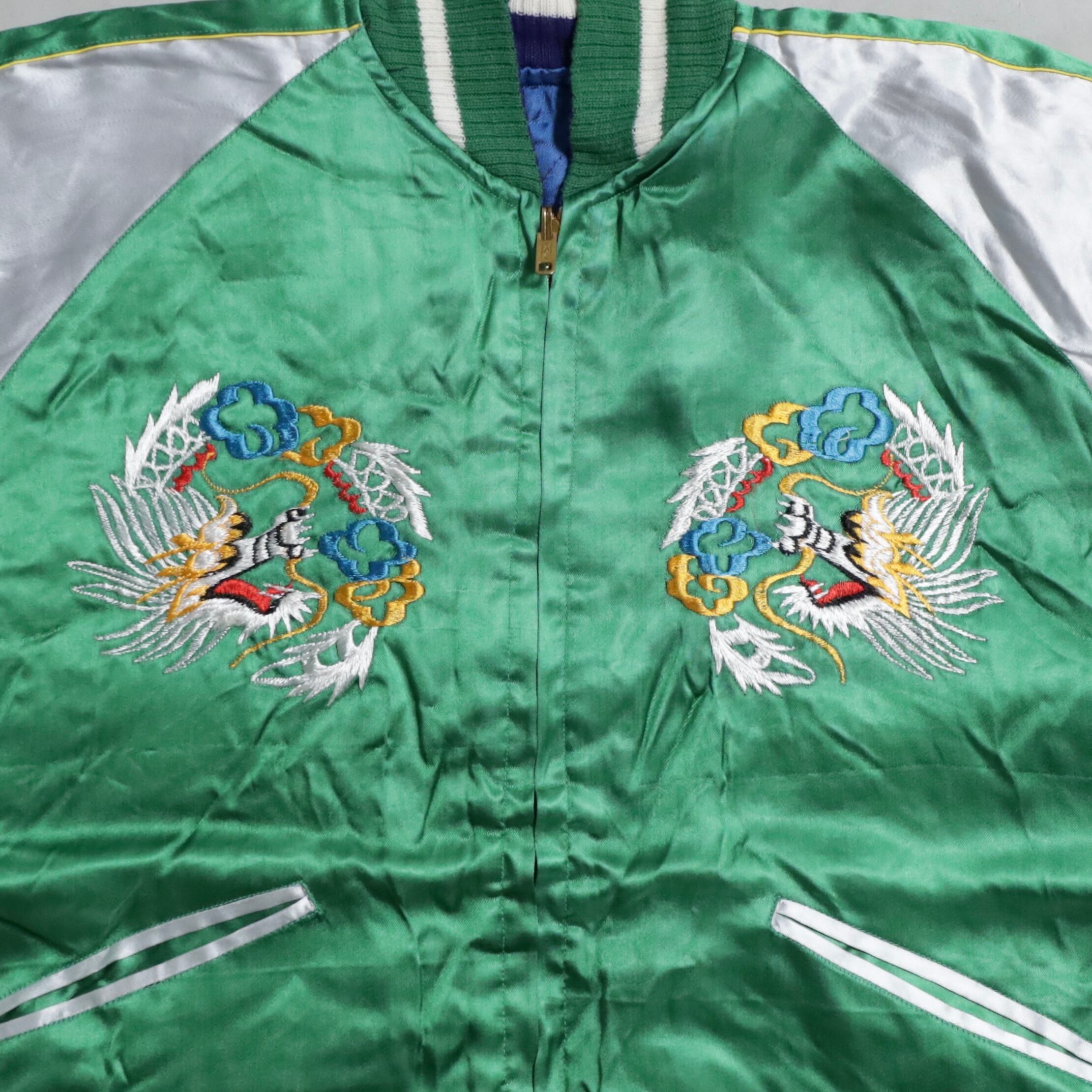 大変希少なグリーンサテン/ブルーサテン、A面は両胸龍×背面鷹/B面は両胸龍×背面虎のハイグレードな刺繍が目を惹きますね。実寸で身幅57cmのビッグサイズも魅力です。デッドストックとなると満足感も変わってくると思いますし、コレクションとしてもおすすめのグッドピース。この機会に是非ご検討ください。