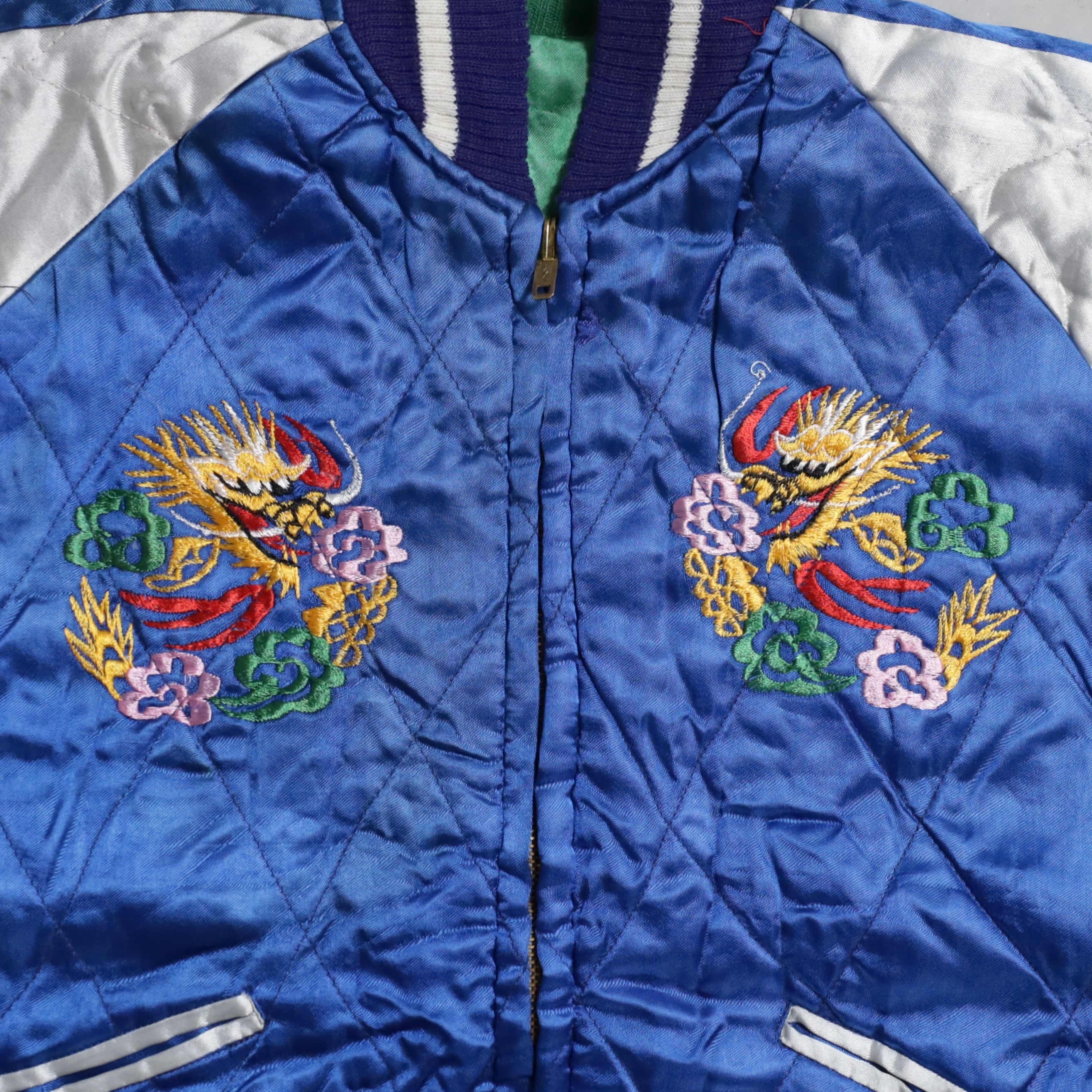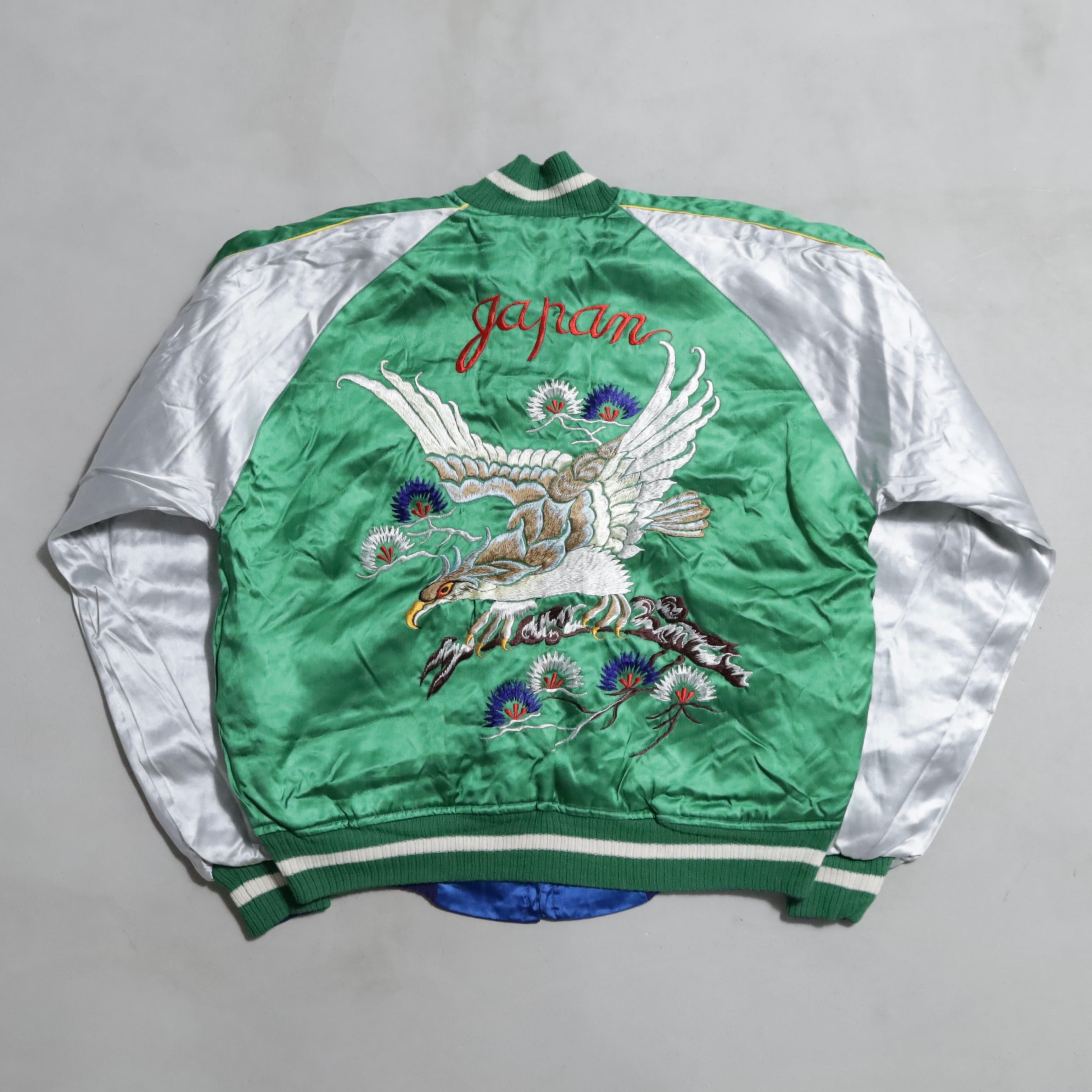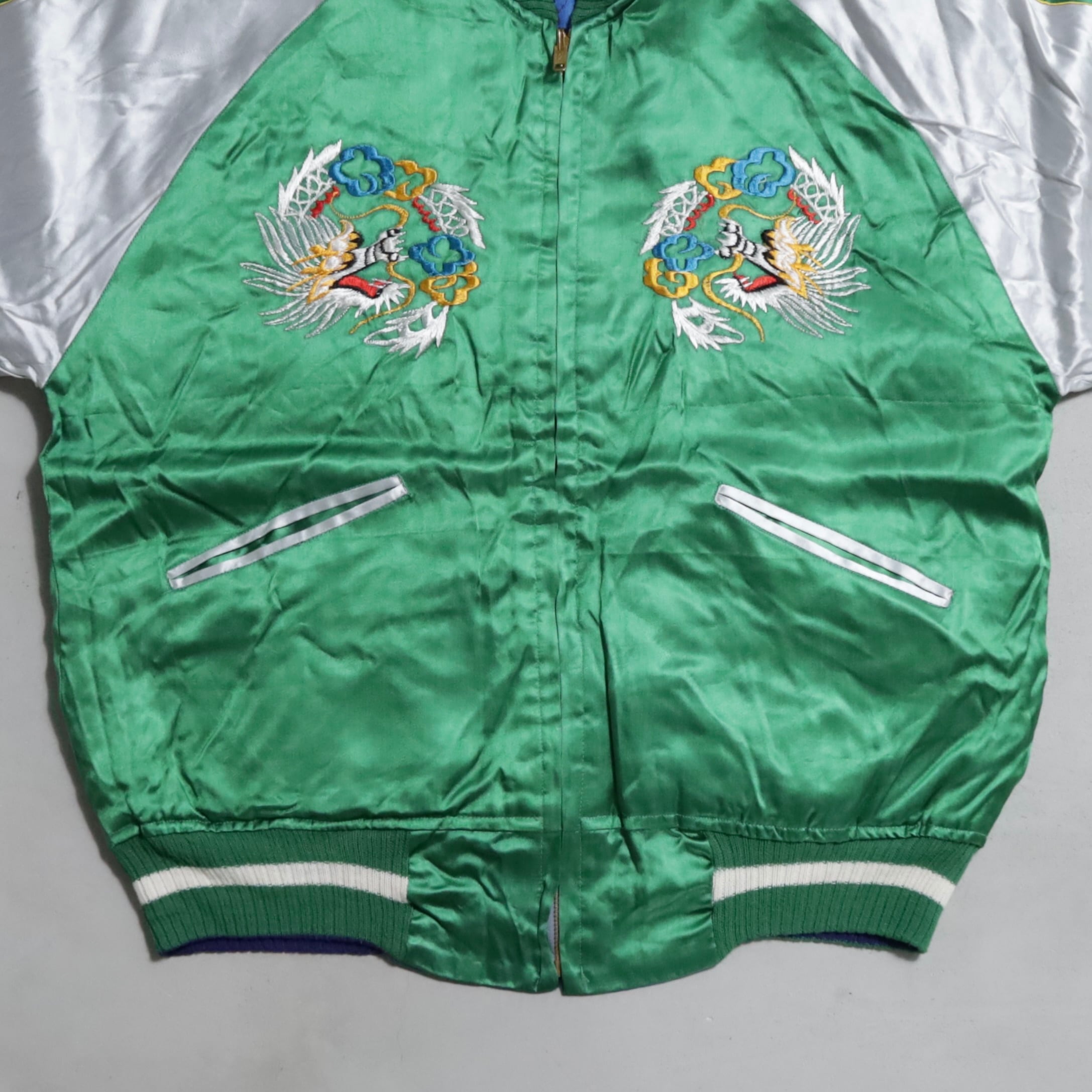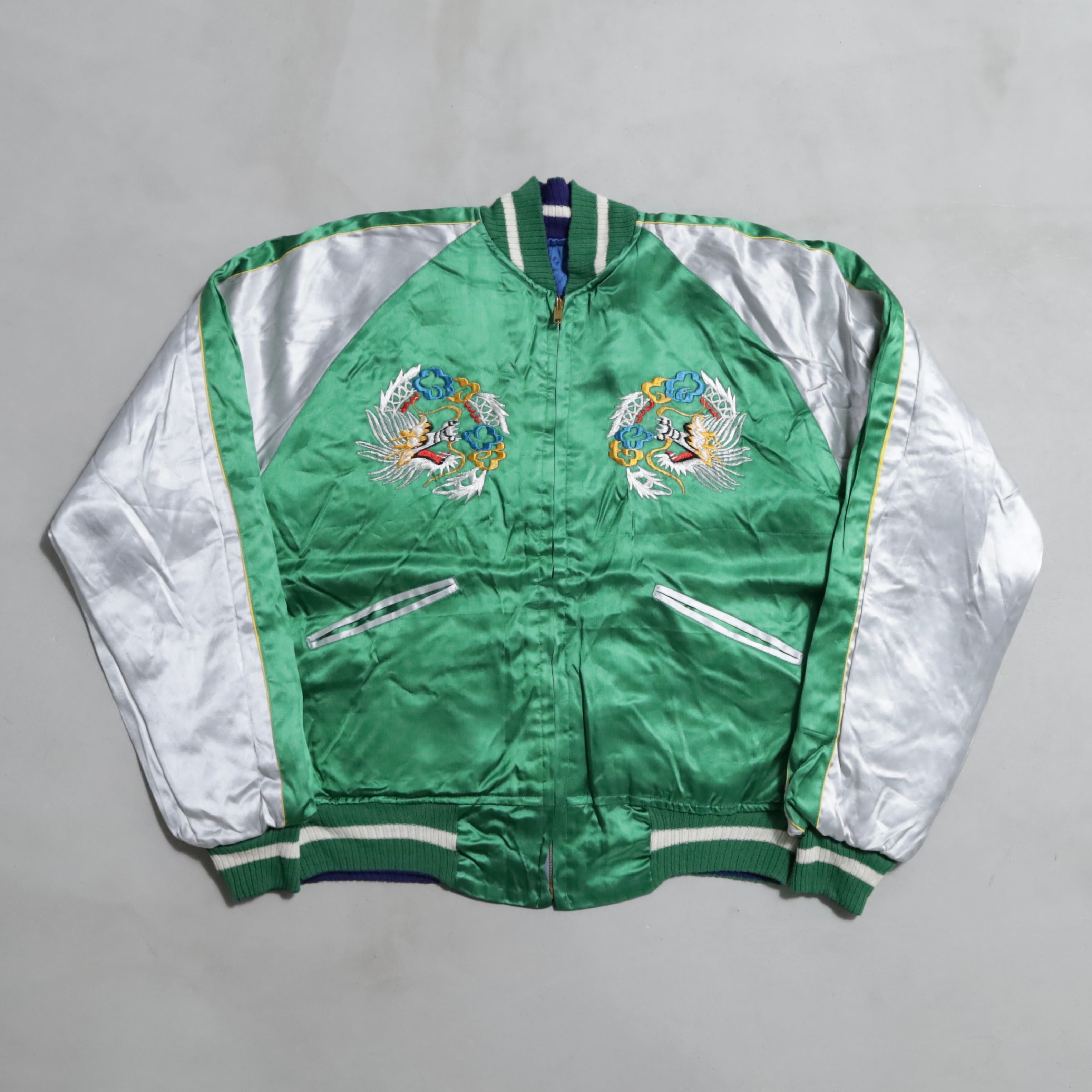 大変希少なグリーンサテン/ブルーサテン、A面は両胸龍×背面鷹/B面は両胸龍×背面虎のハイグレードな刺繍が目を惹きますね。実寸で身幅57cmのビッグサイズも魅力です。デッドストックとなると満足感も変わってくると思いますし、コレクションとしてもおすすめのグッドピース。この機会に是非ご検討ください。