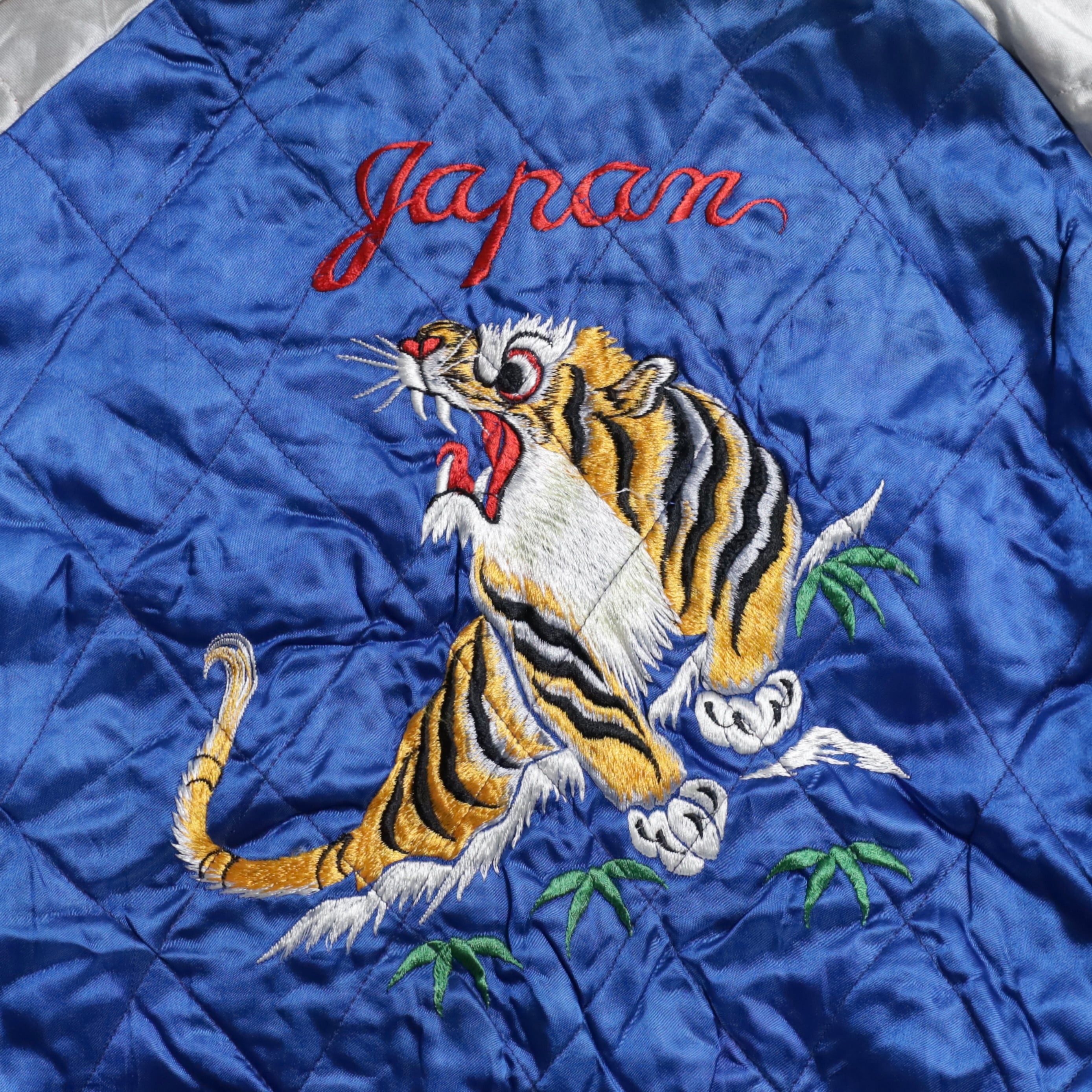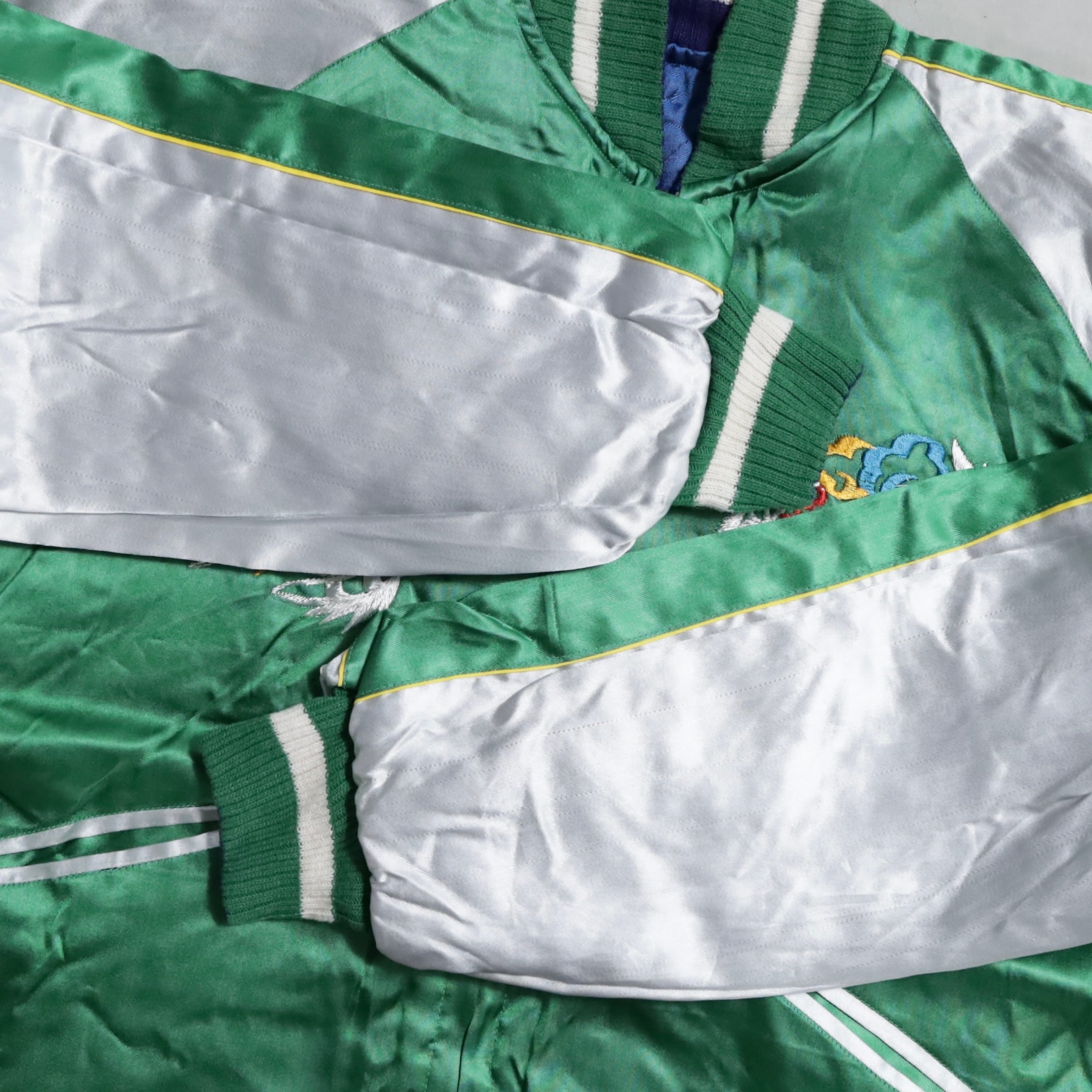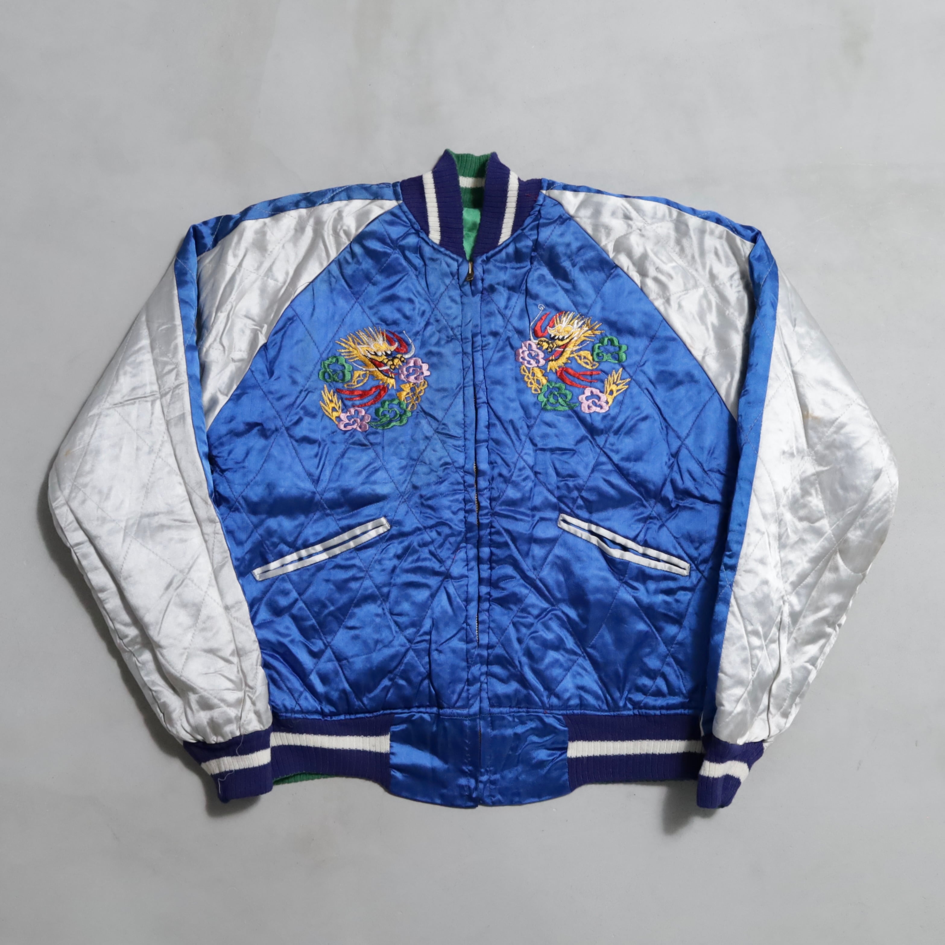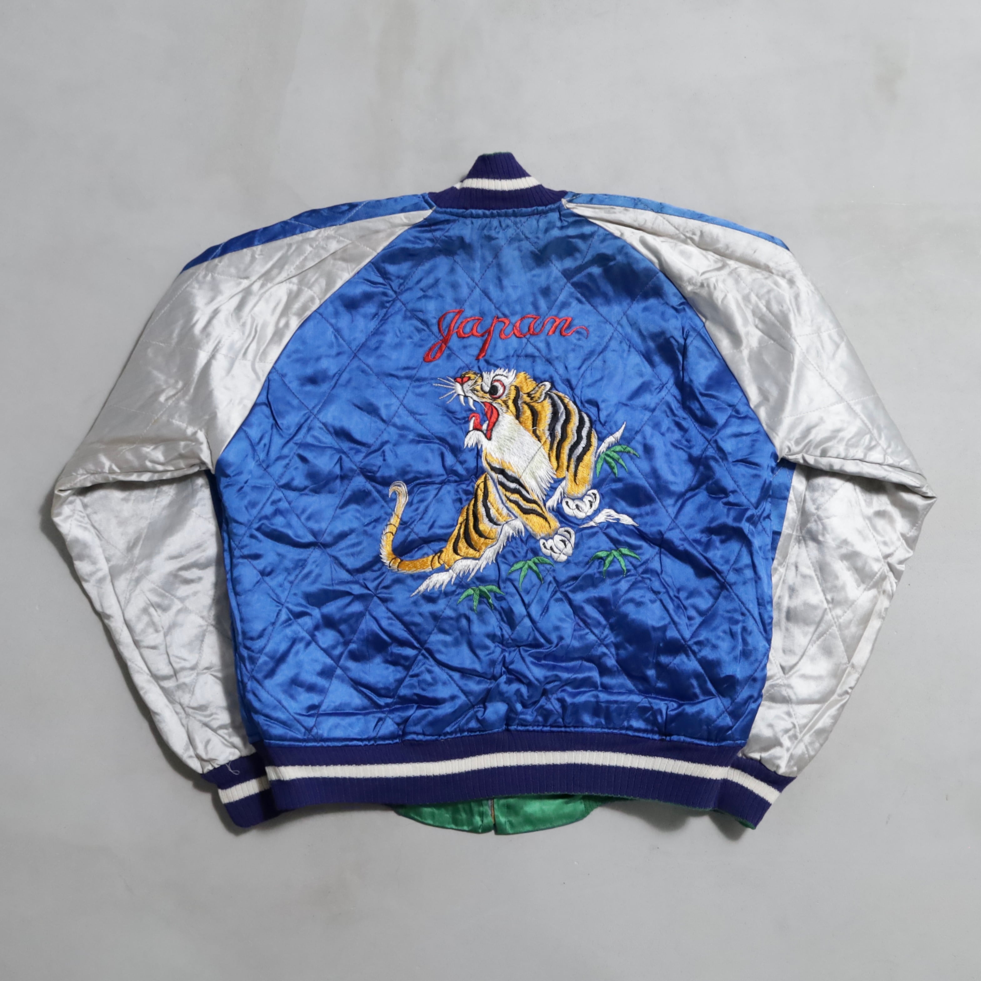 大変希少なグリーンサテン/ブルーサテン、A面は両胸龍×背面鷹/B面は両胸龍×背面虎のハイグレードな刺繍が目を惹きますね。実寸で身幅57cmのビッグサイズも魅力です。デッドストックとなると満足感も変わってくると思いますし、コレクションとしてもおすすめのグッドピース。この機会に是非ご検討ください。