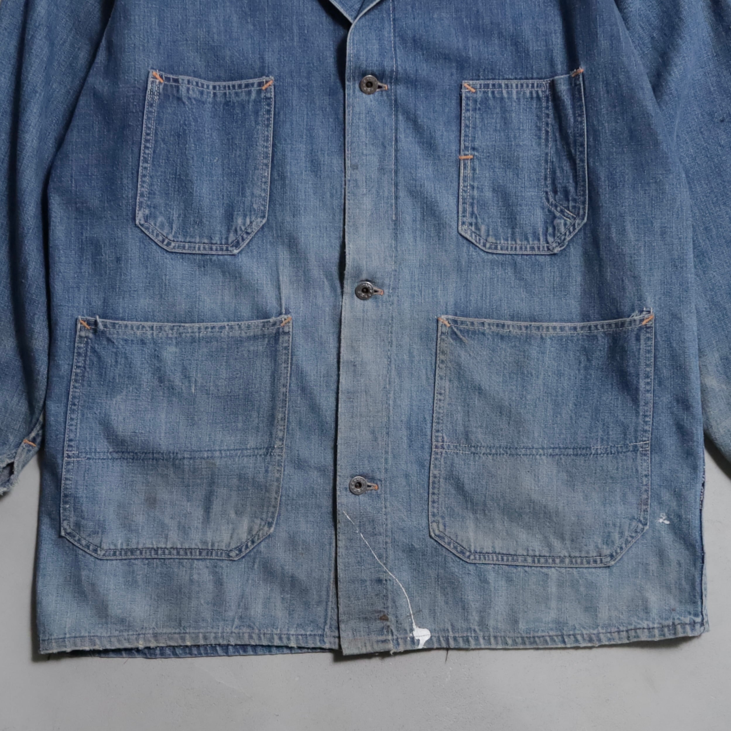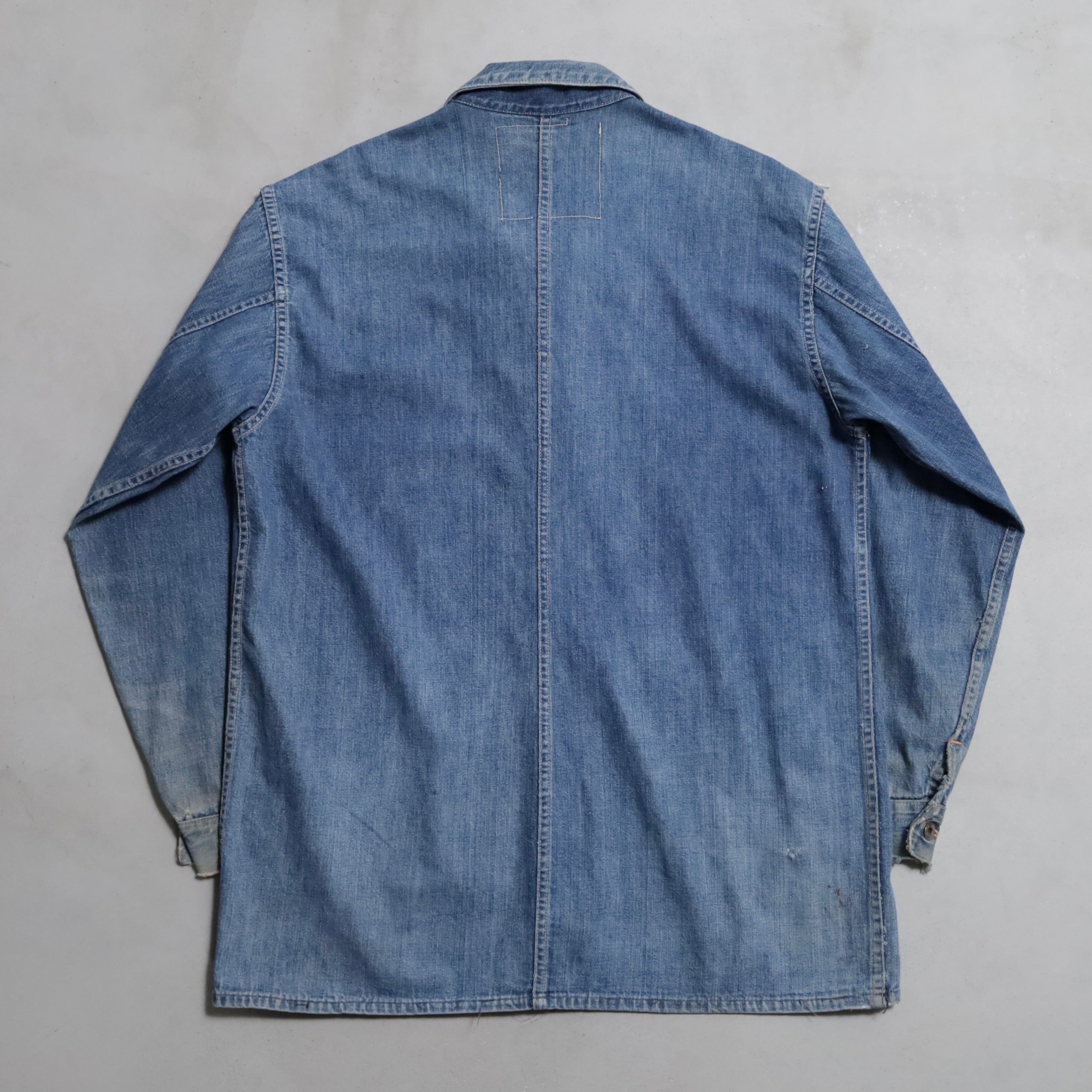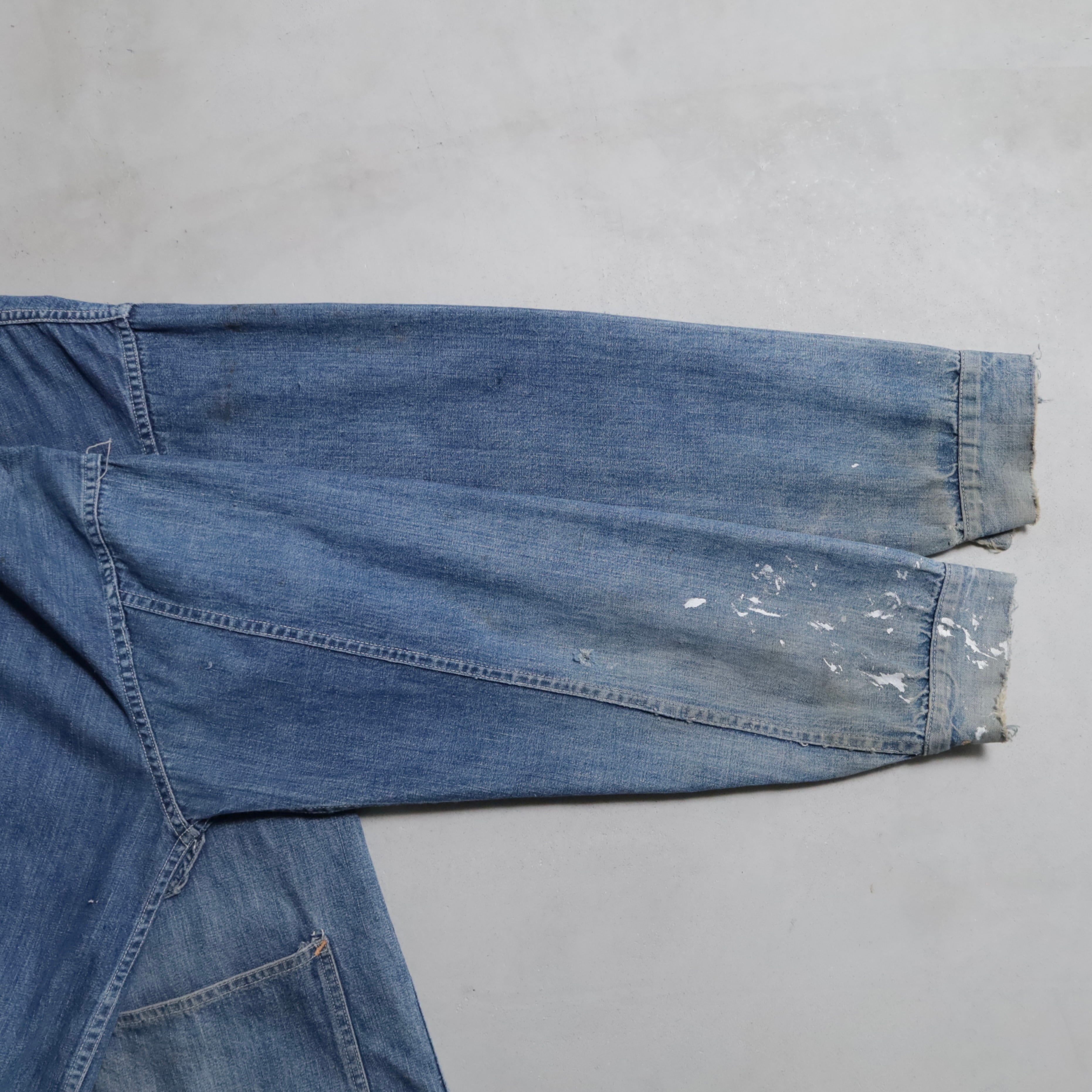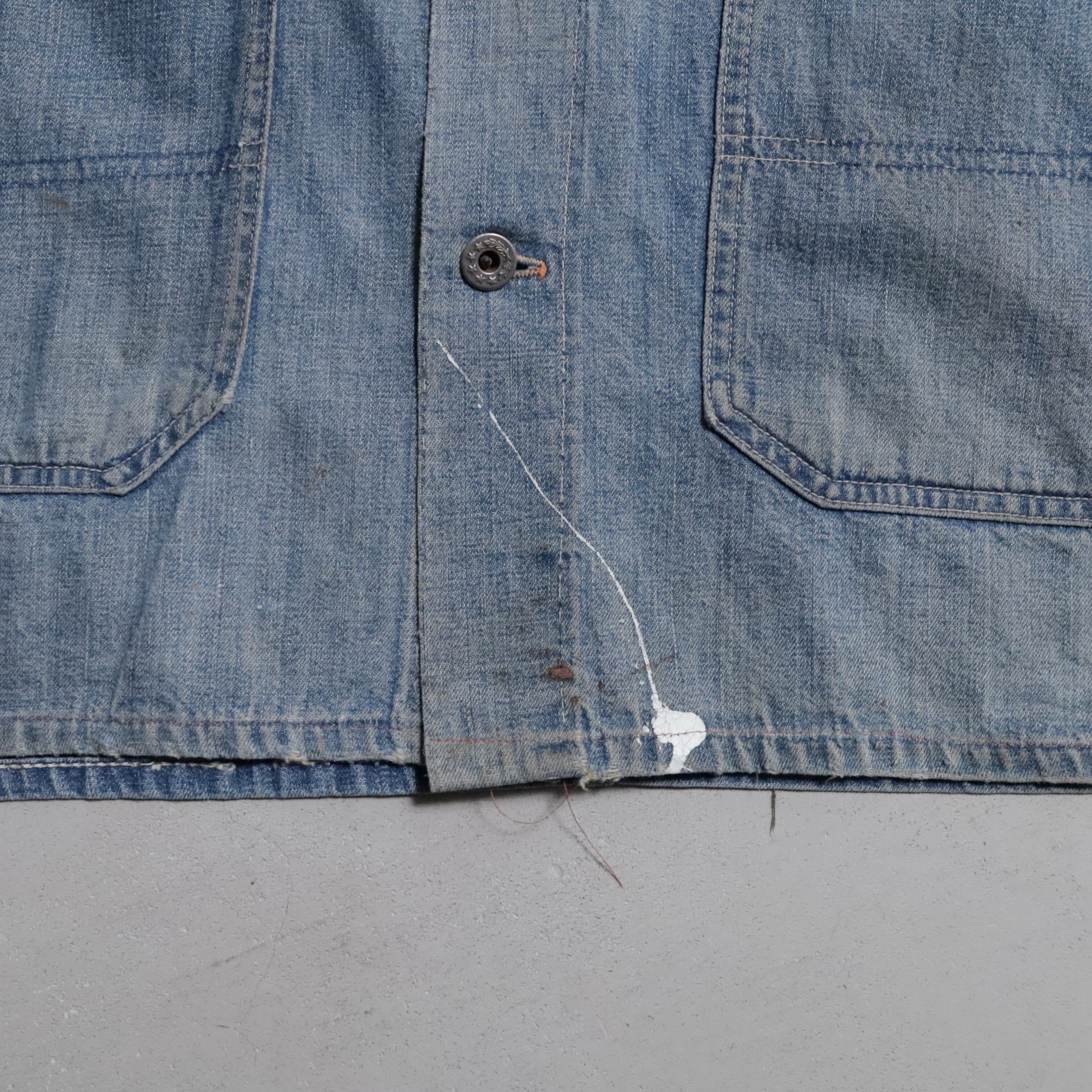 大変希少な大戦期のデニムカバーオールを買付できました。4ポケットにダブルステッチ、フロント/月桂樹打込4ボタン、カフス/月桂樹打込1ボタンのグッドディテールです。ペンキ飛びも最高にかっこいいですね。実寸で身幅63cmのビッグサイズも魅力です。デニムに限らず大戦期の評価は軒並み右肩上がりです。買い逃しのないようこの機会に是非ご検討ください。