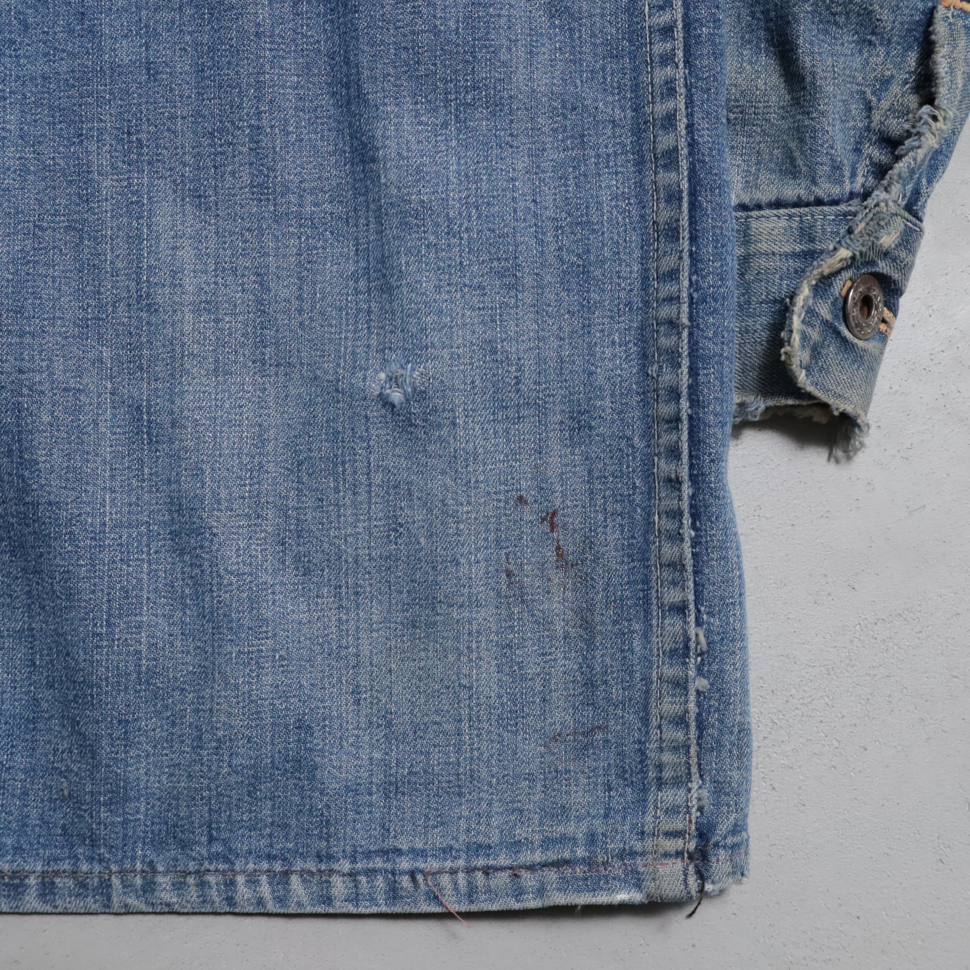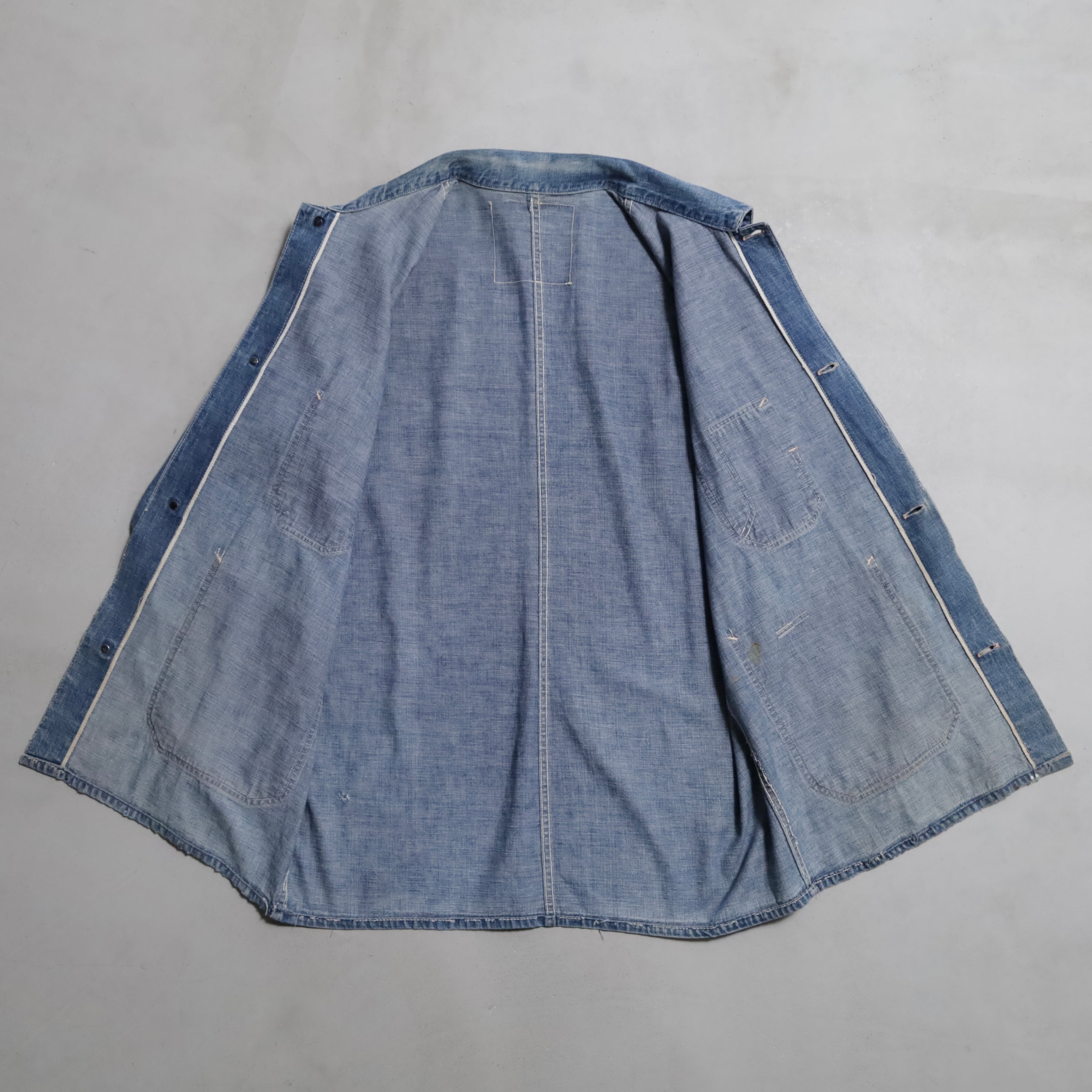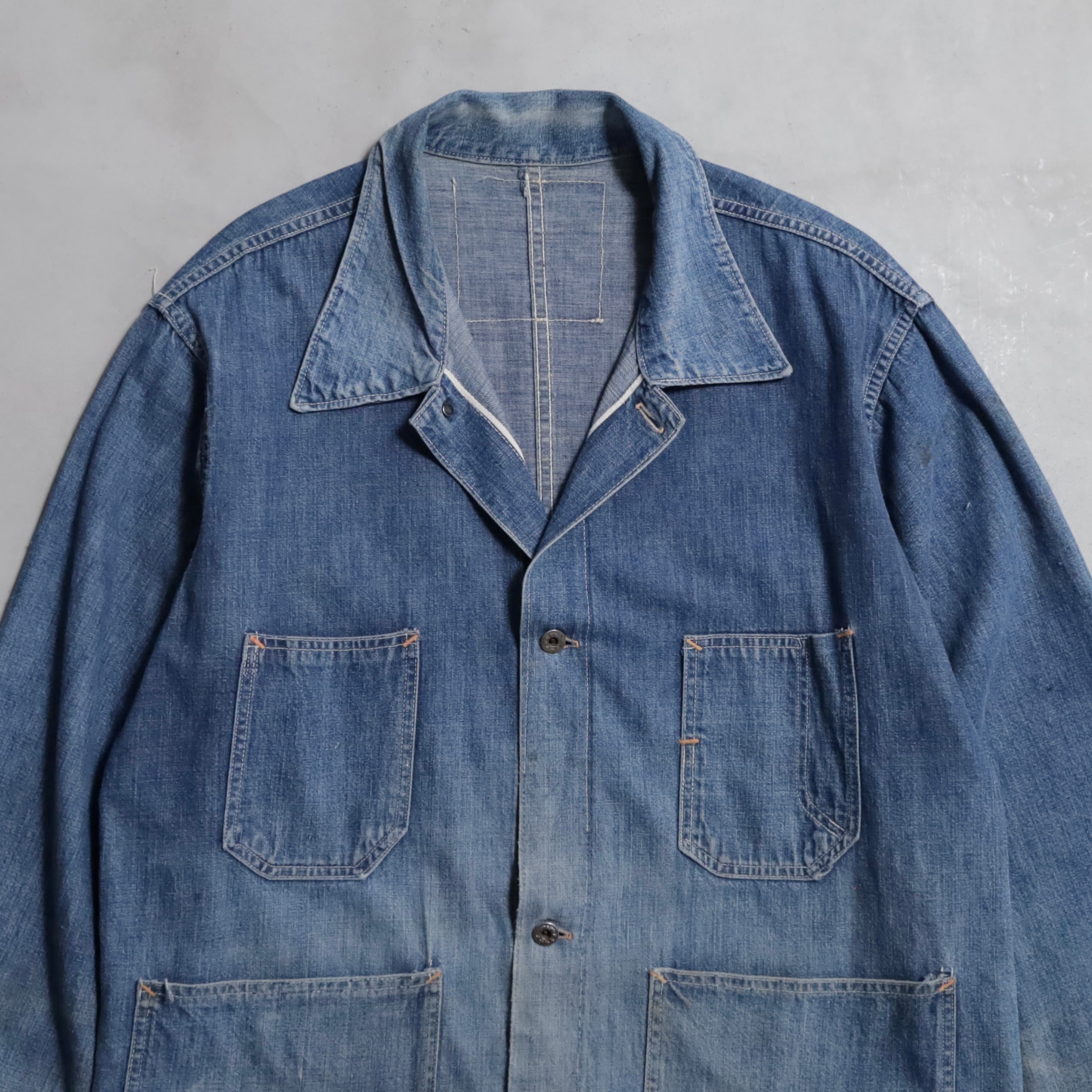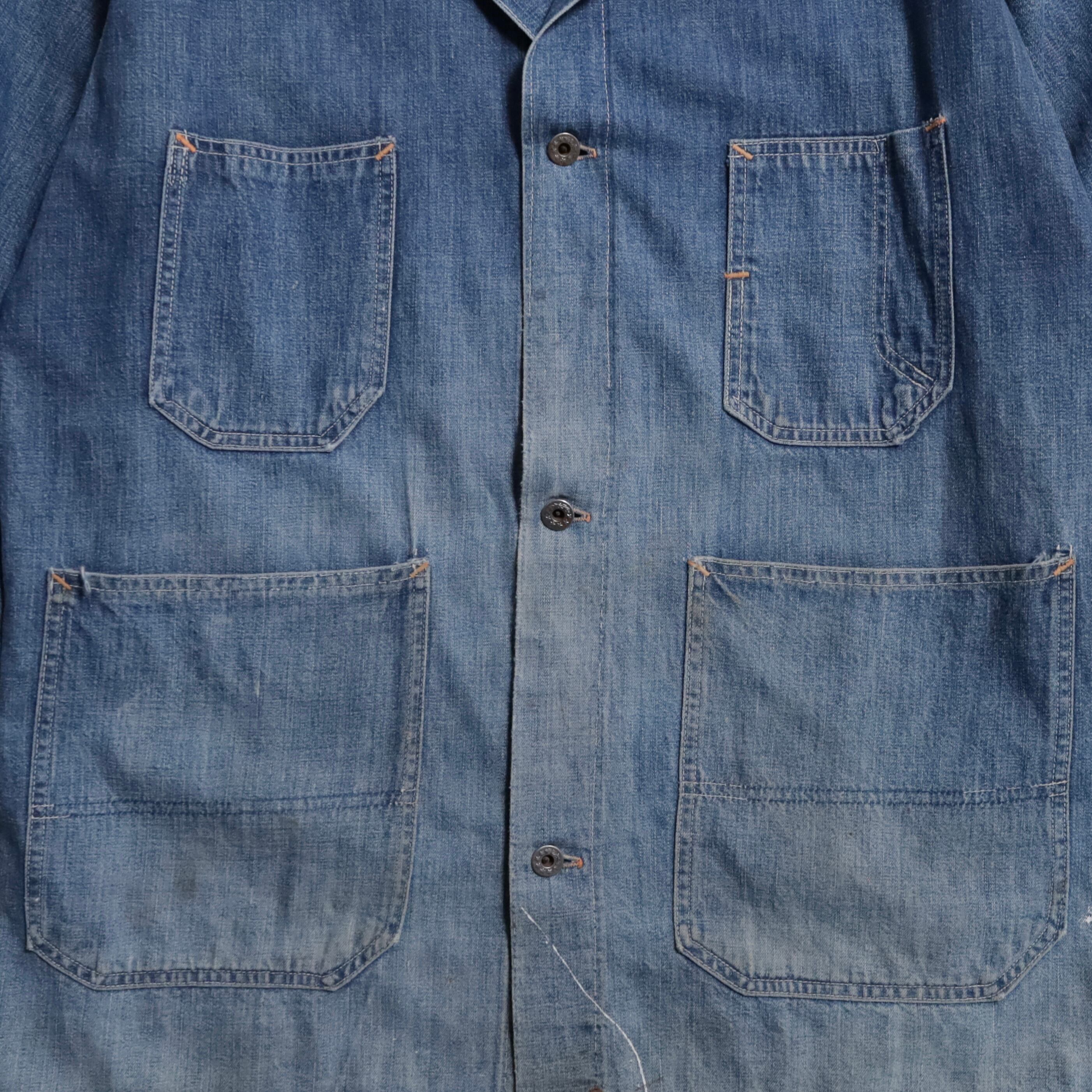 大変希少な大戦期のデニムカバーオールを買付できました。4ポケットにダブルステッチ、フロント/月桂樹打込4ボタン、カフス/月桂樹打込1ボタンのグッドディテールです。ペンキ飛びも最高にかっこいいですね。実寸で身幅63cmのビッグサイズも魅力です。デニムに限らず大戦期の評価は軒並み右肩上がりです。買い逃しのないようこの機会に是非ご検討ください。