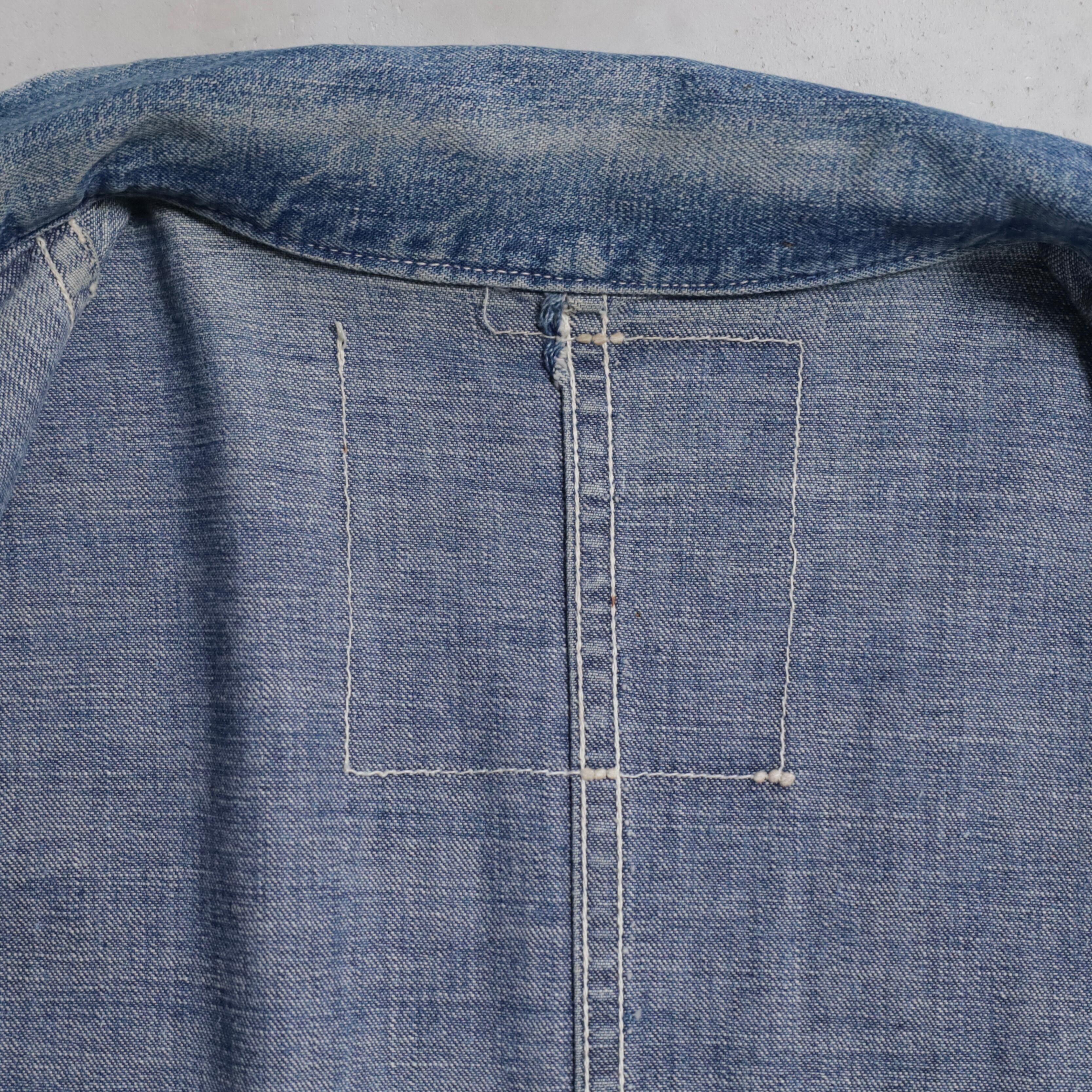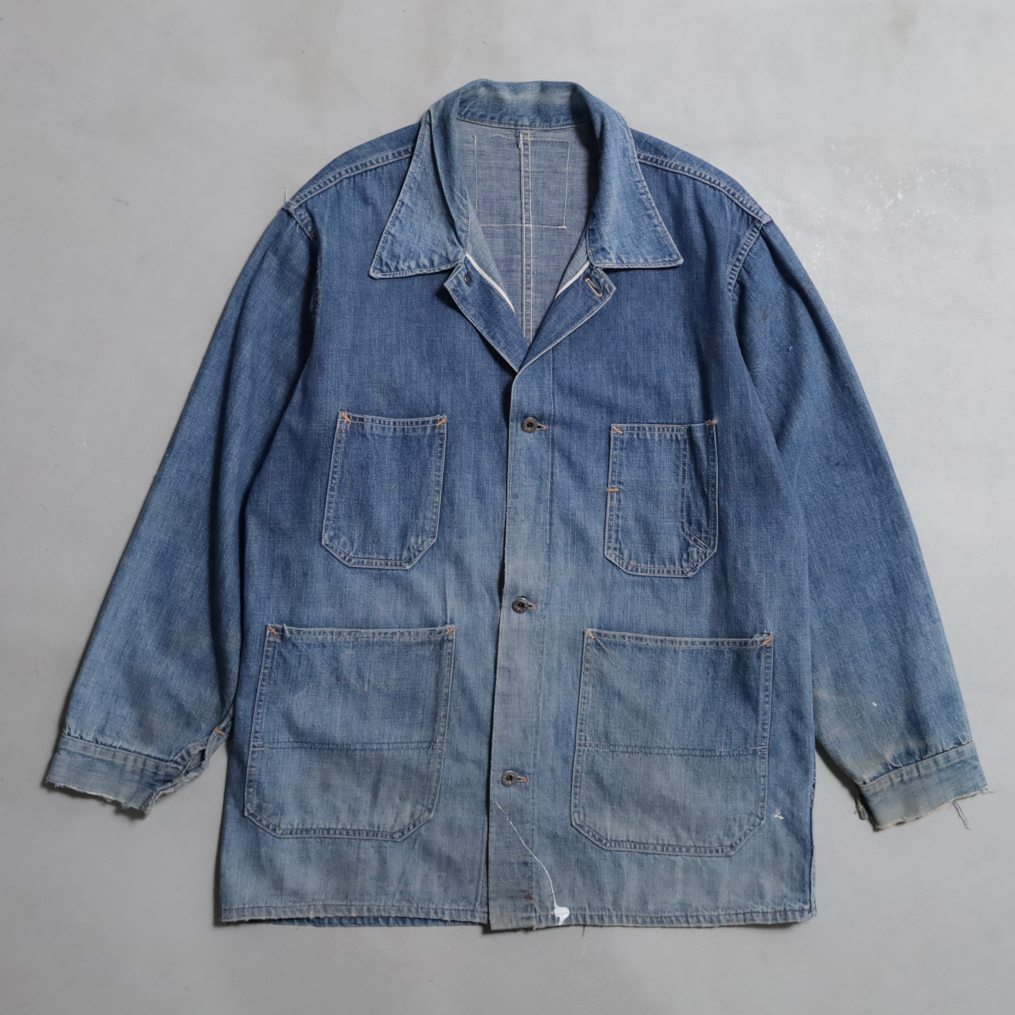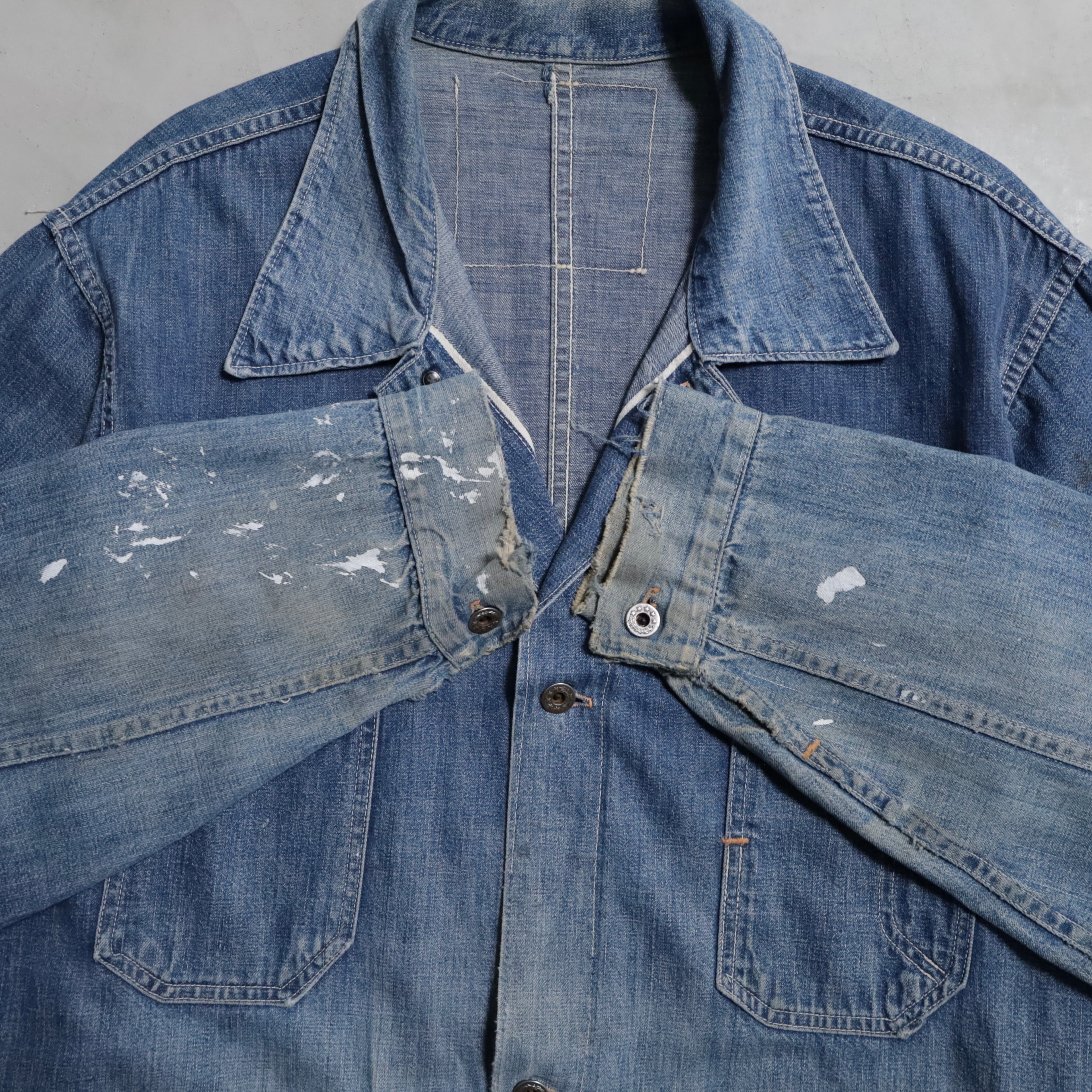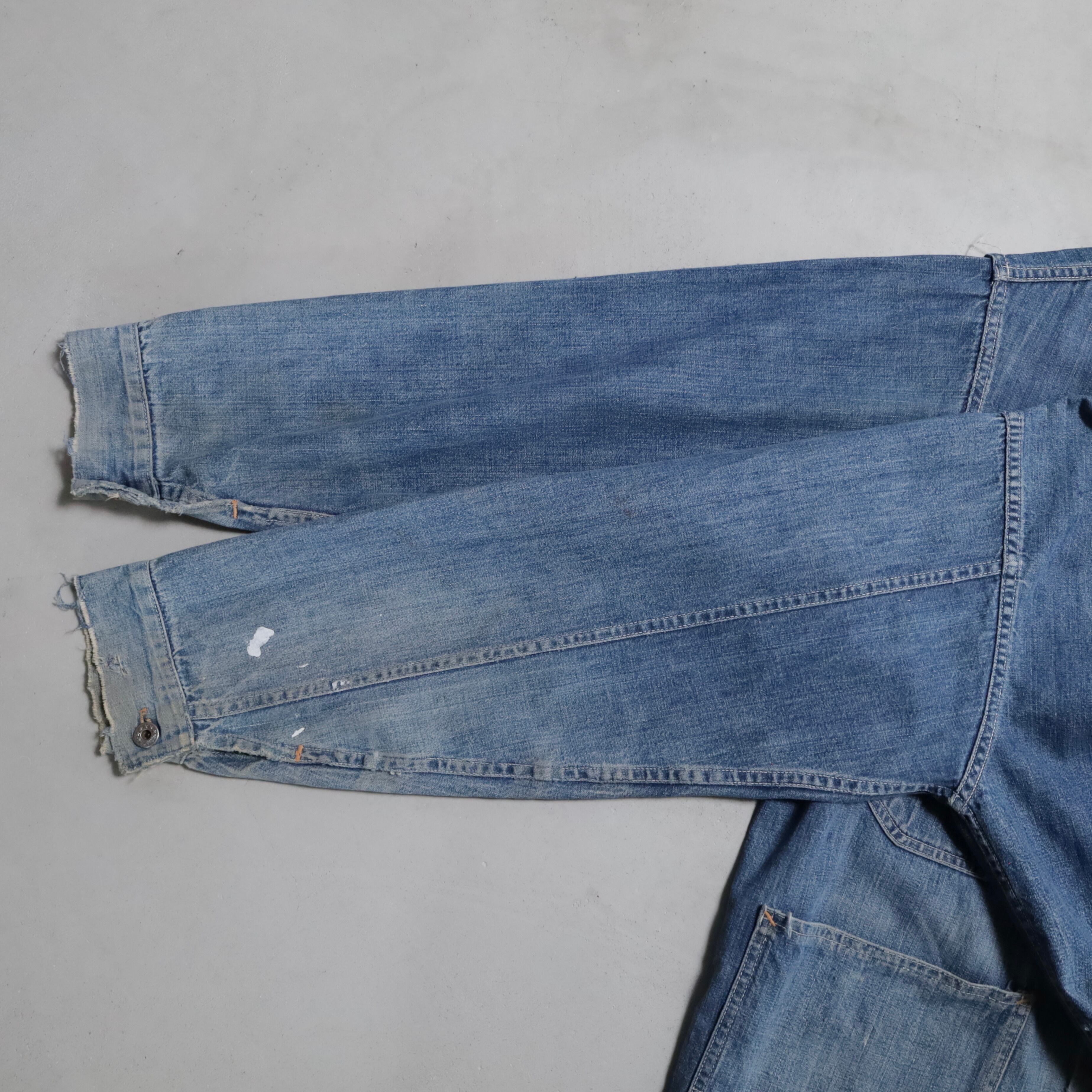 大変希少な大戦期のデニムカバーオールを買付できました。4ポケットにダブルステッチ、フロント/月桂樹打込4ボタン、カフス/月桂樹打込1ボタンのグッドディテールです。ペンキ飛びも最高にかっこいいですね。実寸で身幅63cmのビッグサイズも魅力です。デニムに限らず大戦期の評価は軒並み右肩上がりです。買い逃しのないようこの機会に是非ご検討ください。