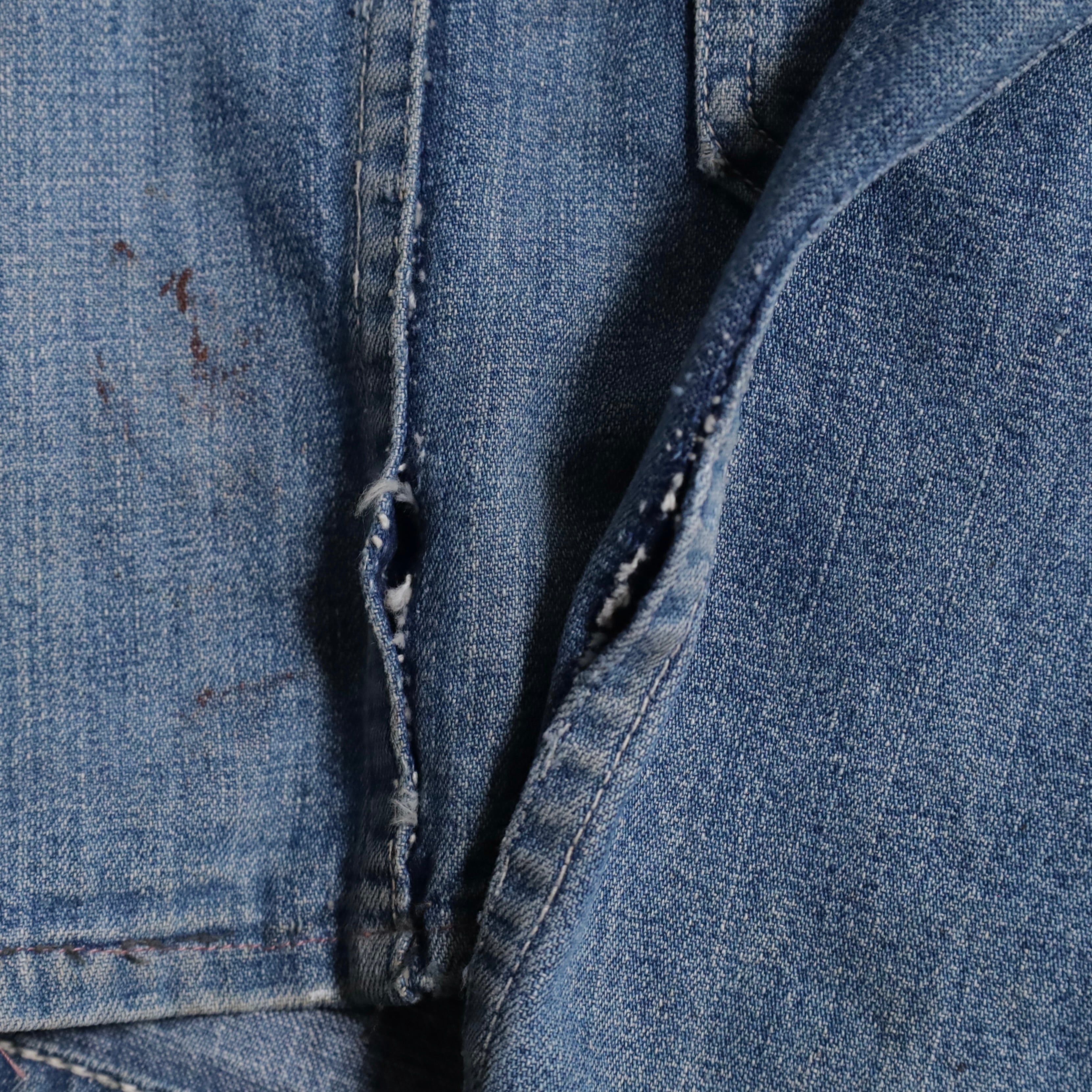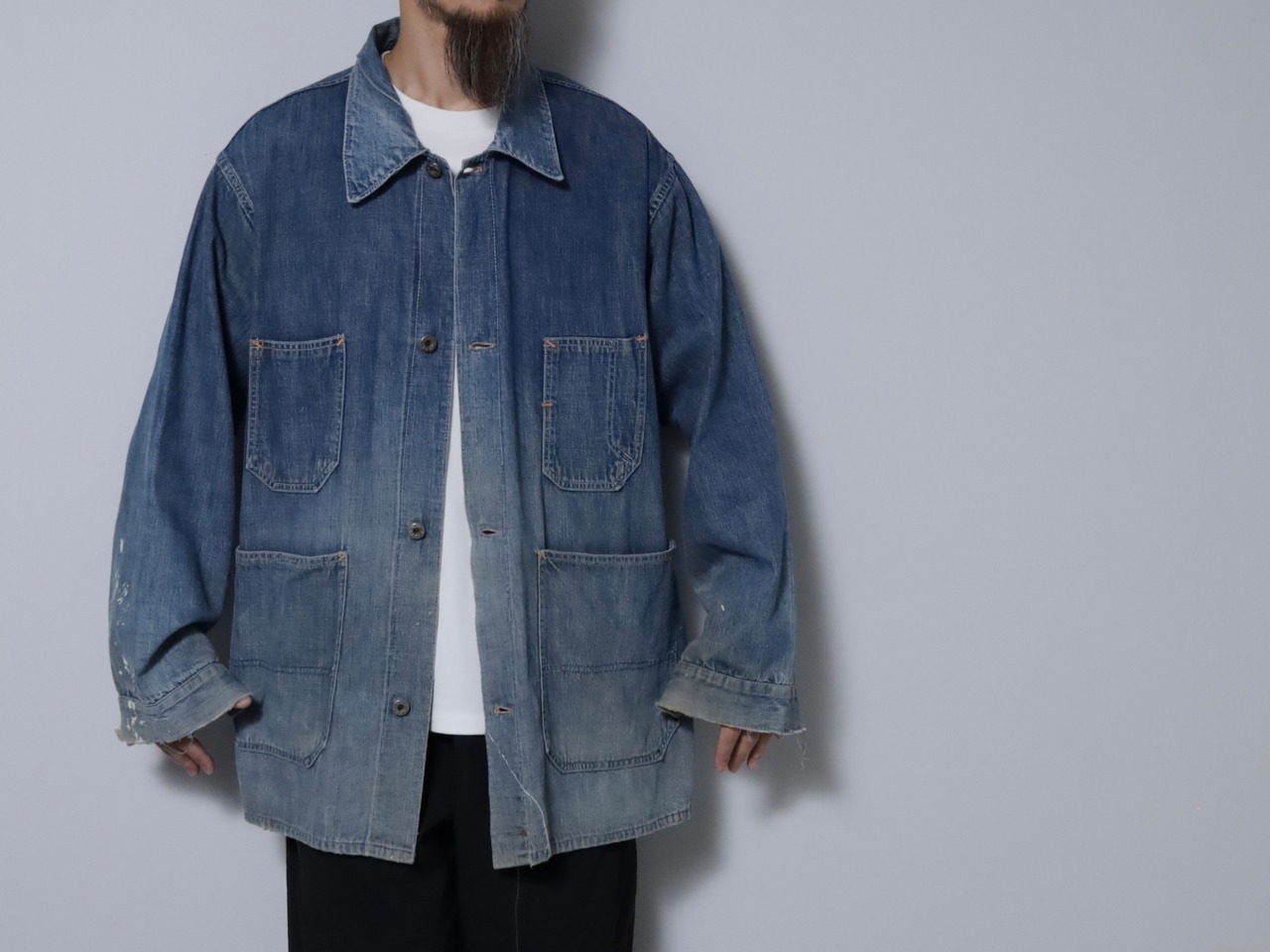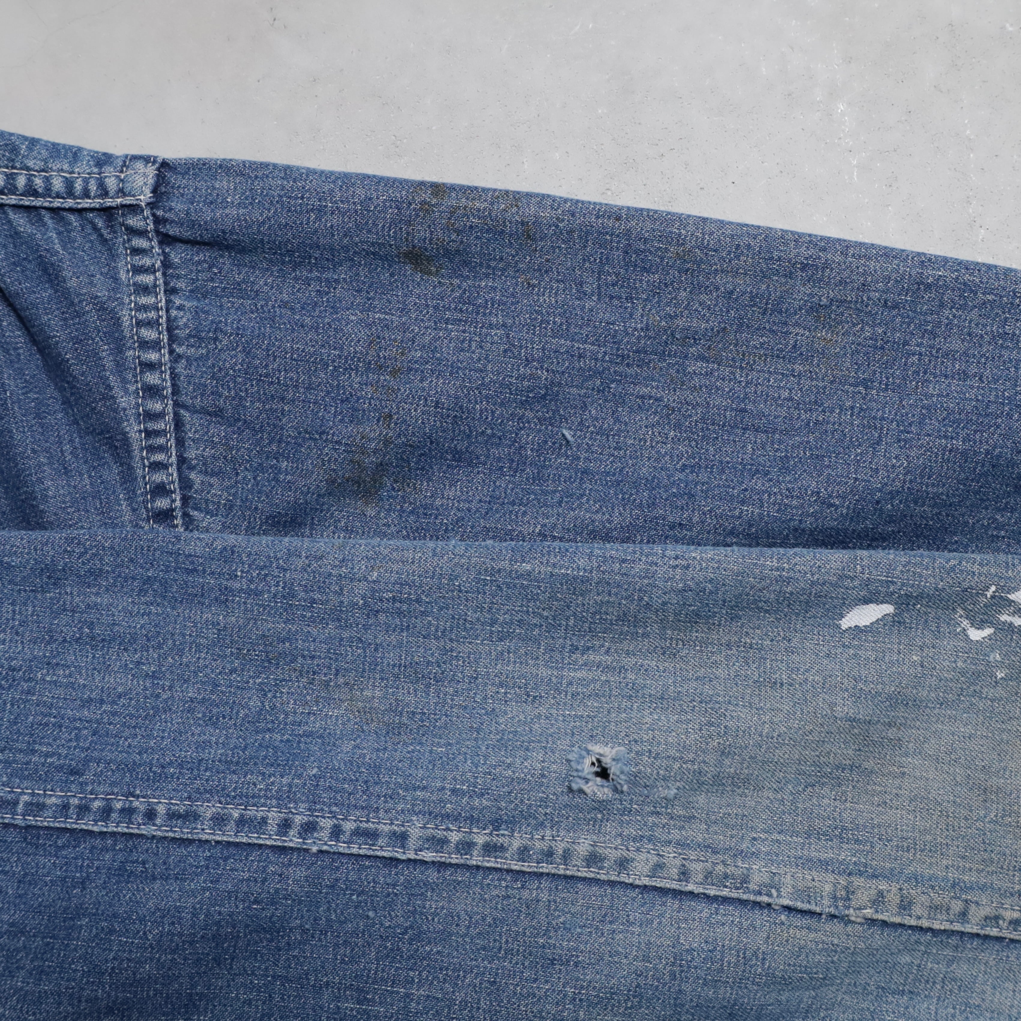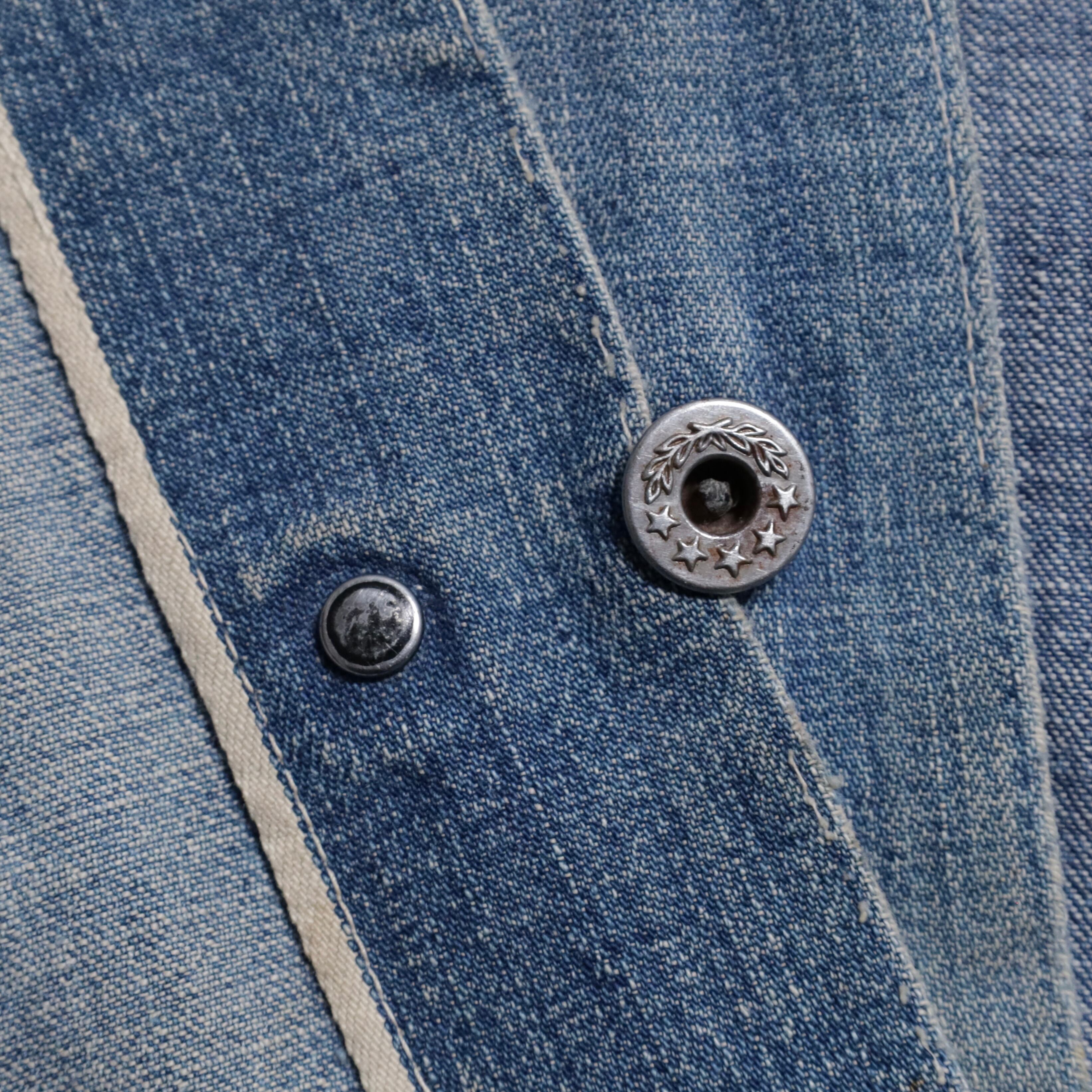 大変希少な大戦期のデニムカバーオールを買付できました。4ポケットにダブルステッチ、フロント/月桂樹打込4ボタン、カフス/月桂樹打込1ボタンのグッドディテールです。ペンキ飛びも最高にかっこいいですね。実寸で身幅63cmのビッグサイズも魅力です。デニムに限らず大戦期の評価は軒並み右肩上がりです。買い逃しのないようこの機会に是非ご検討ください。