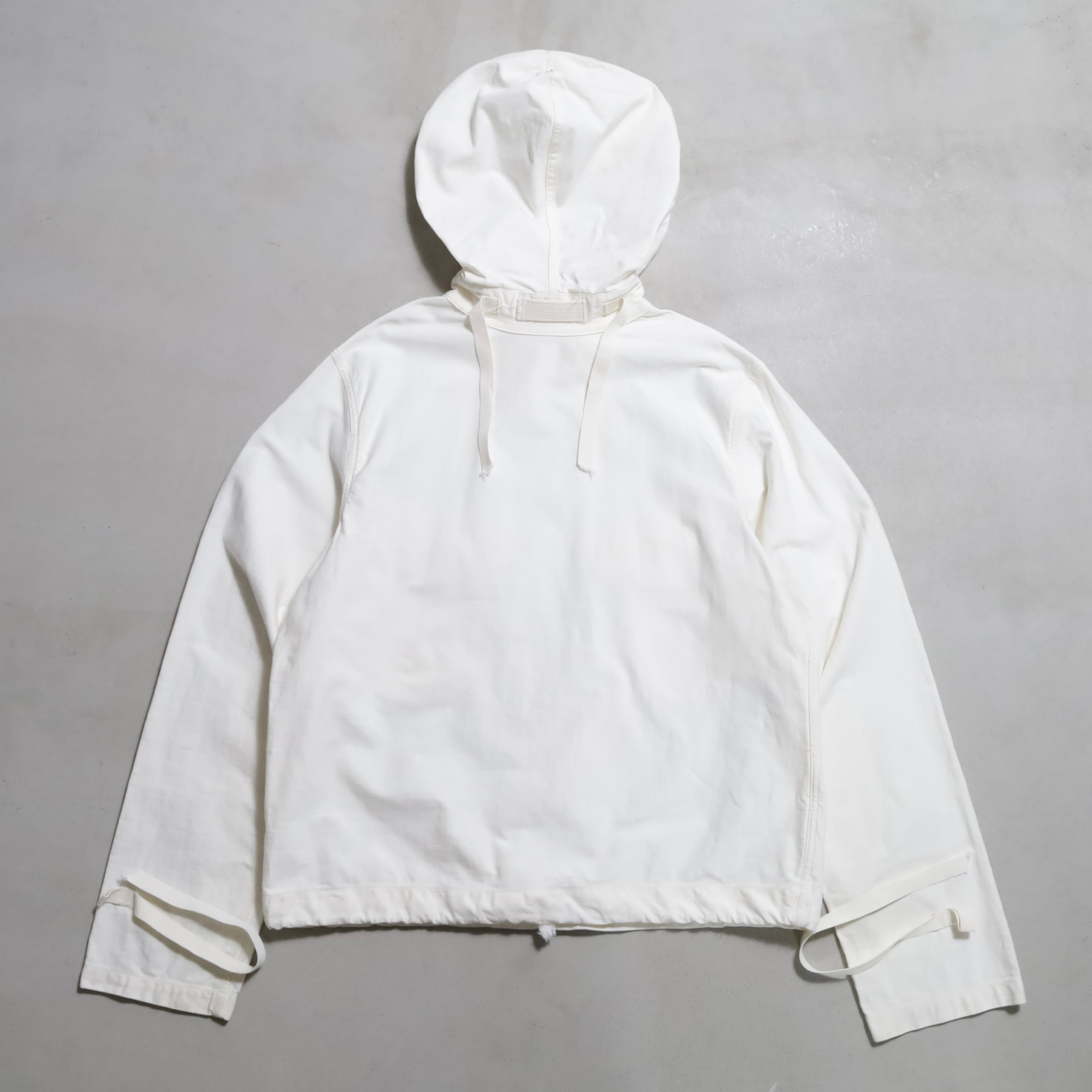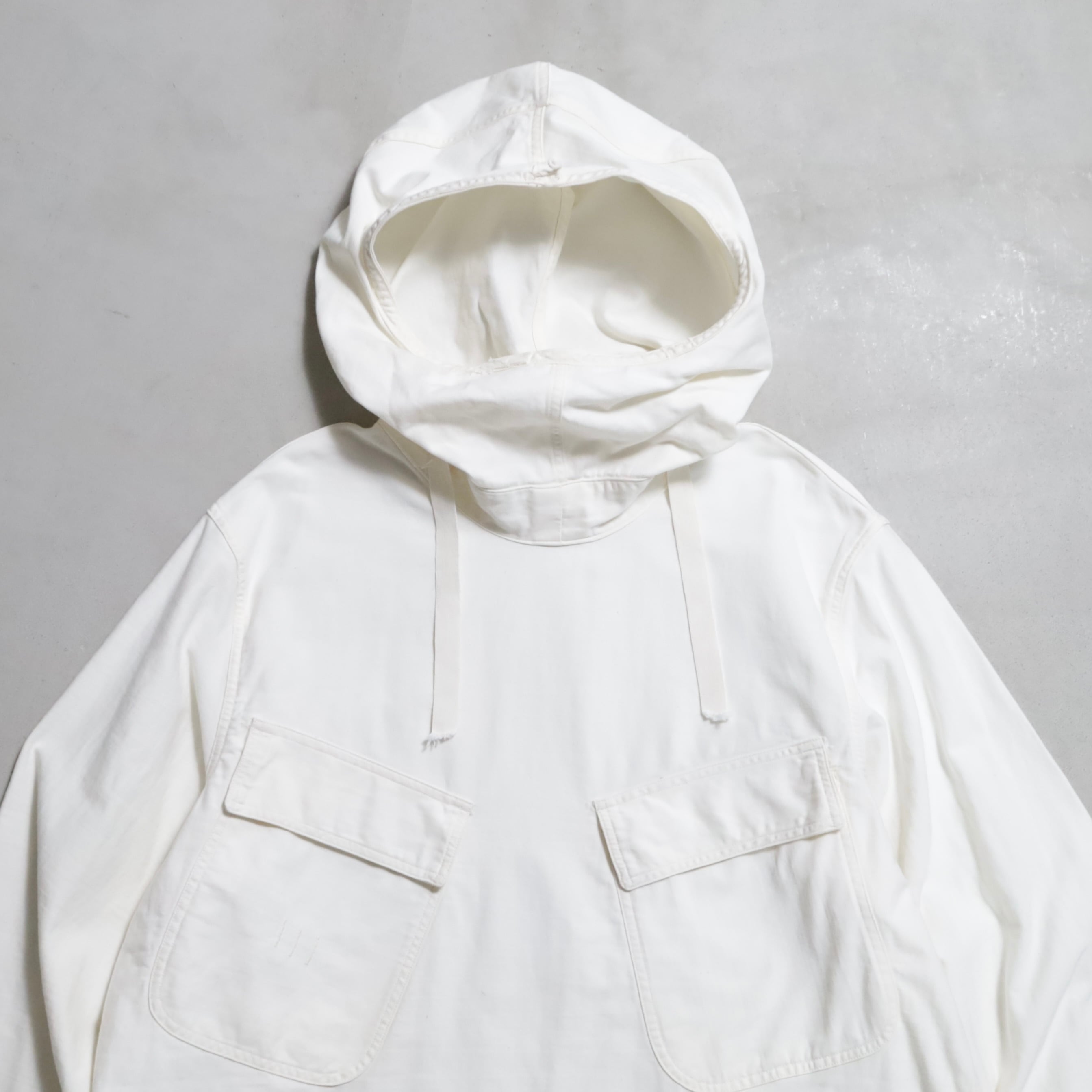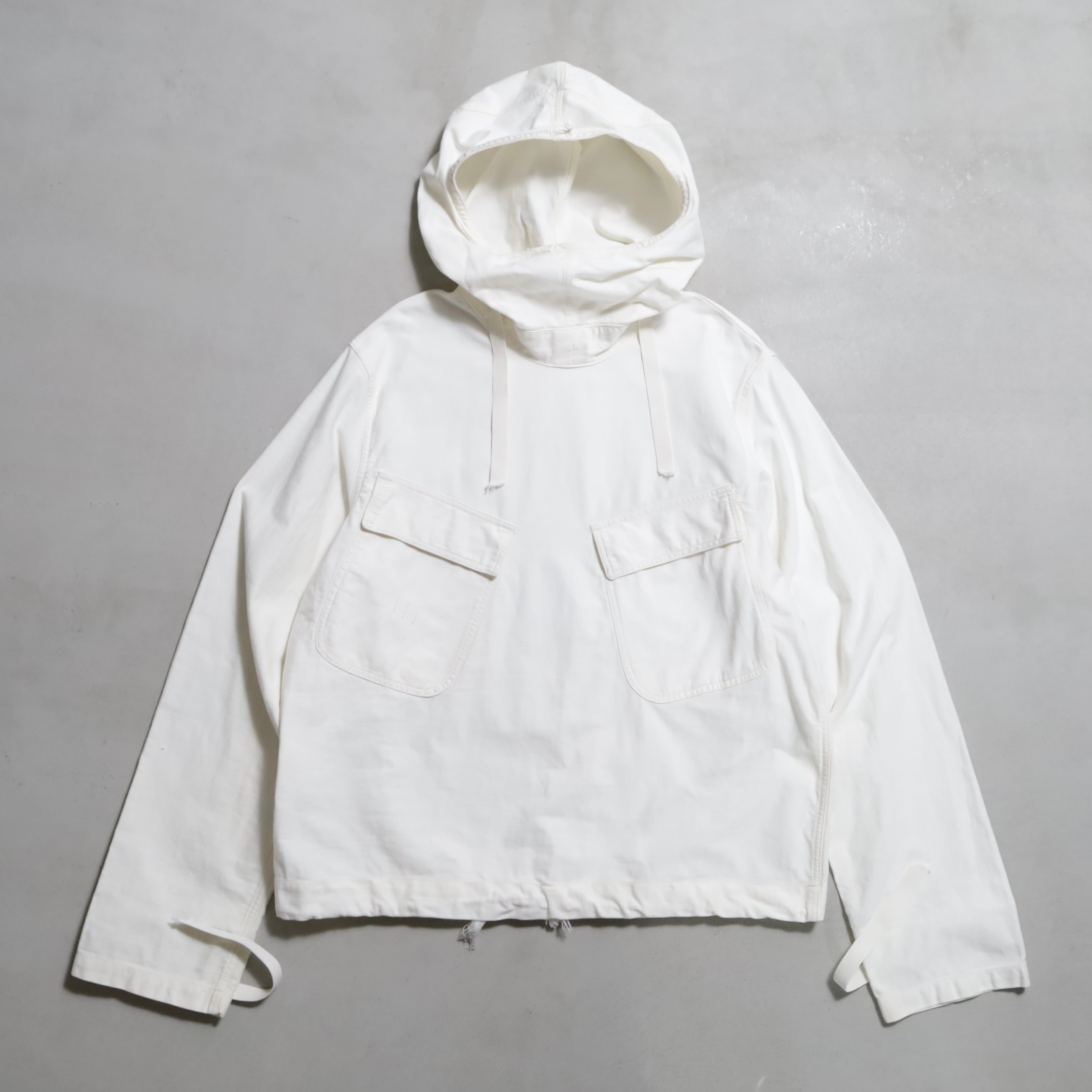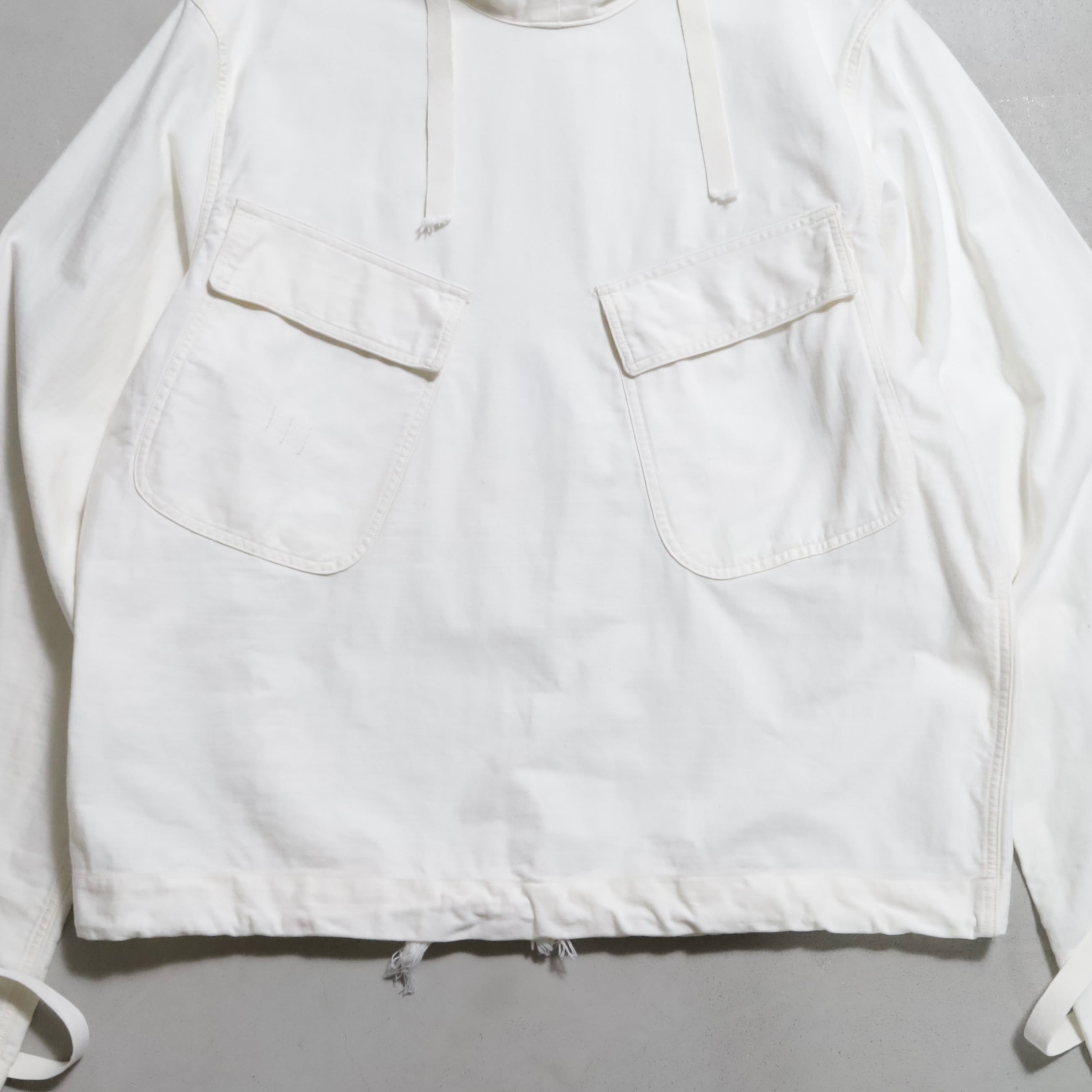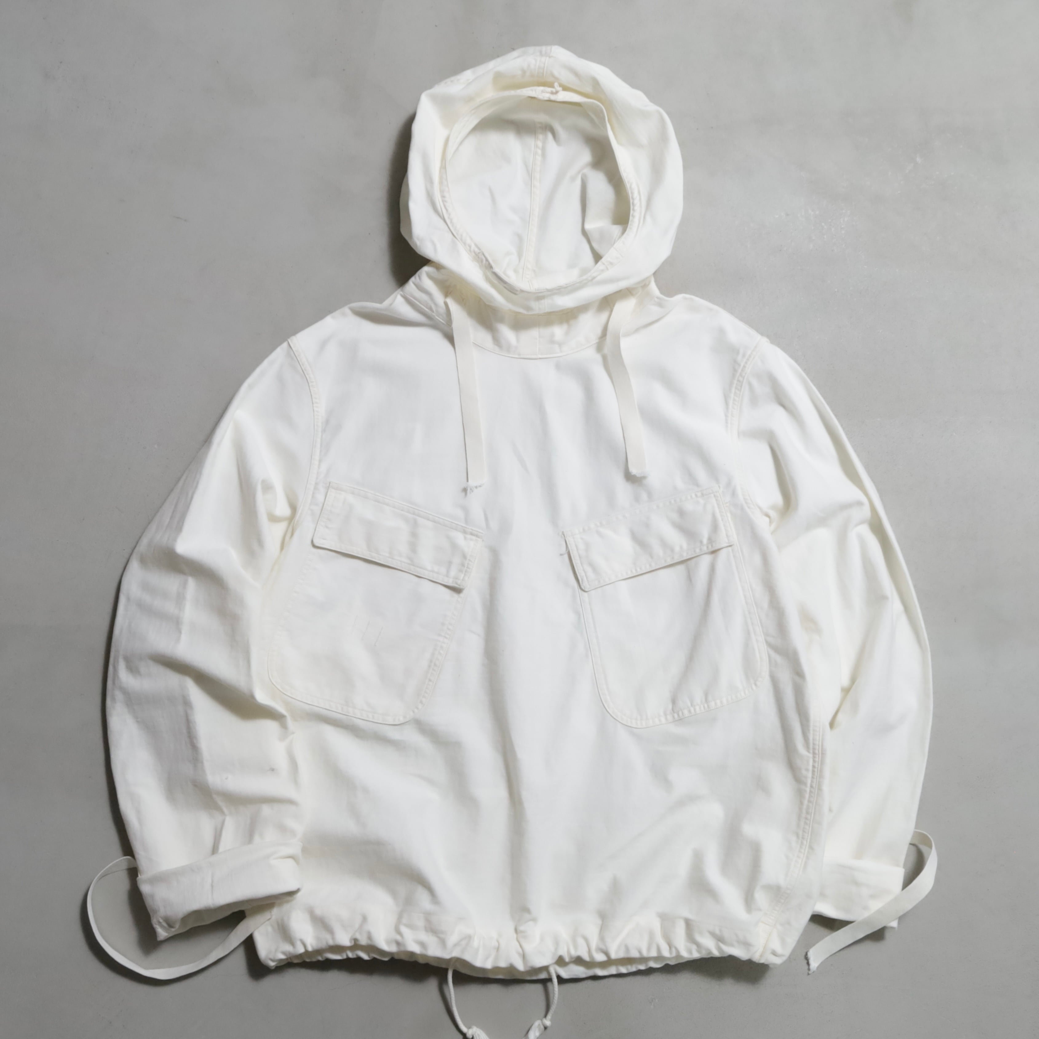 ガンナースモックとも言いますね。首周り前後・袖・裾ドローコード付(袖は平織)のコットン地。2ポケスラッシュの方です。3本ステッチで実寸XLARGE-XXLARGE相当のグッドサイズ。プルオーバーでデザイン性も高く多くのブランドがサンプリングしています。