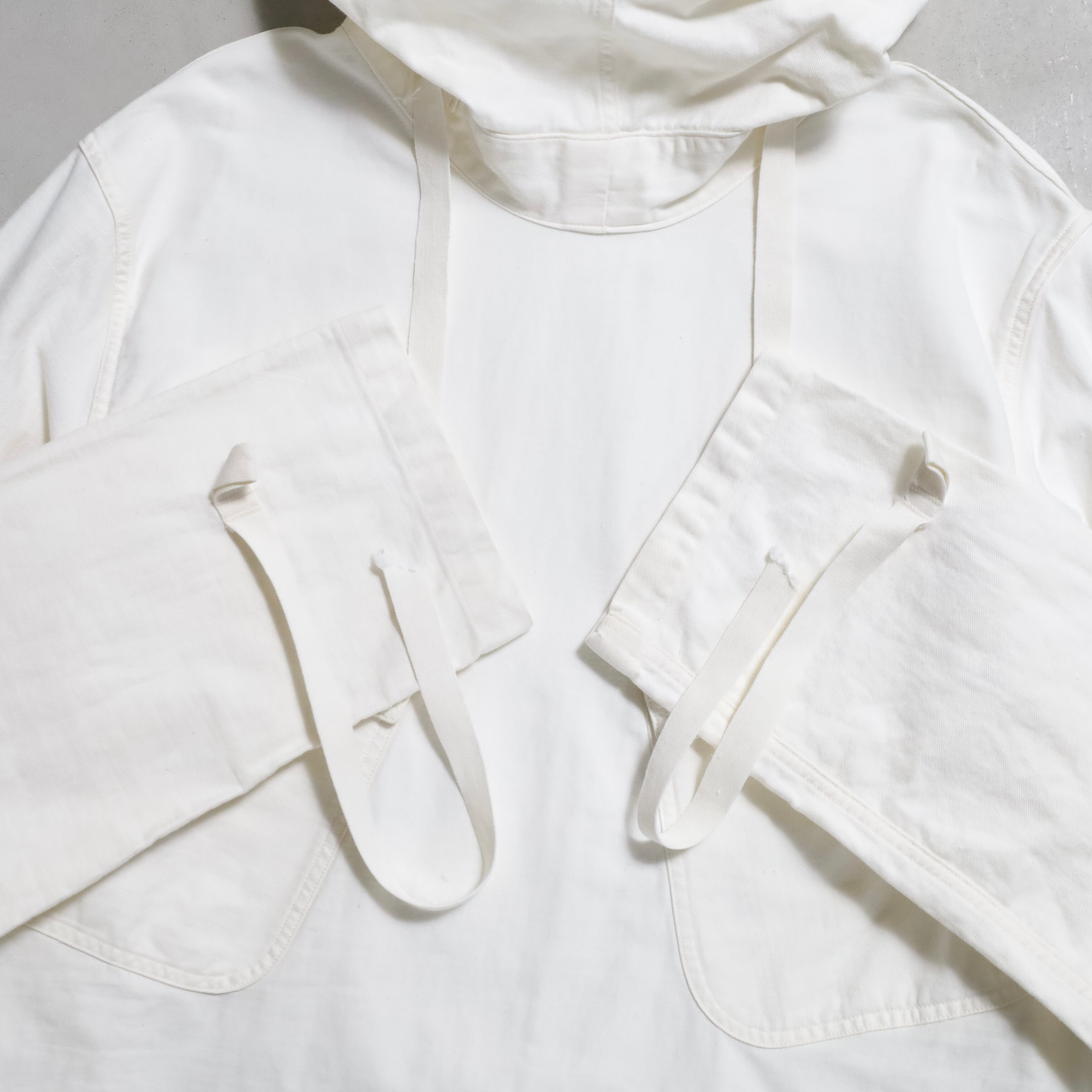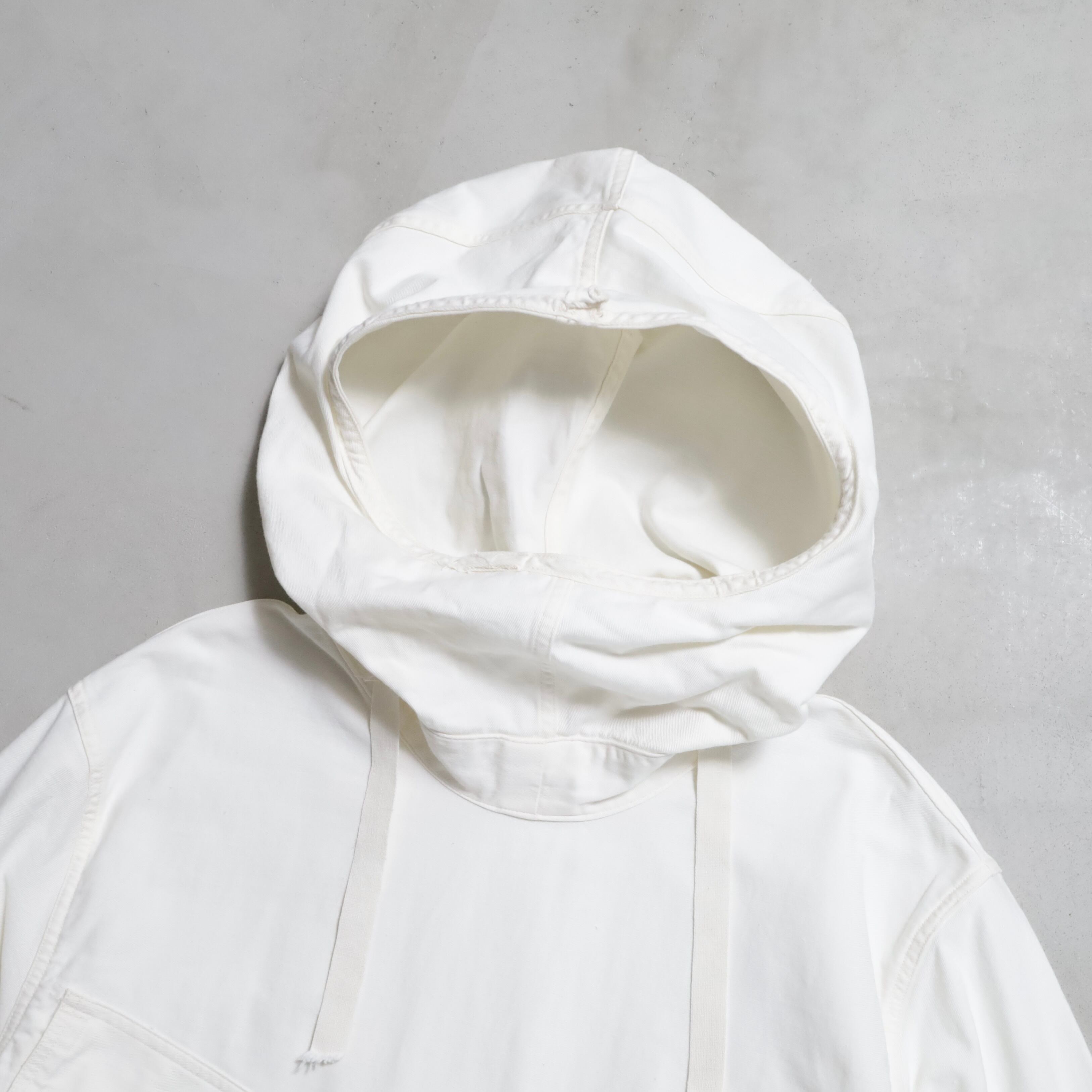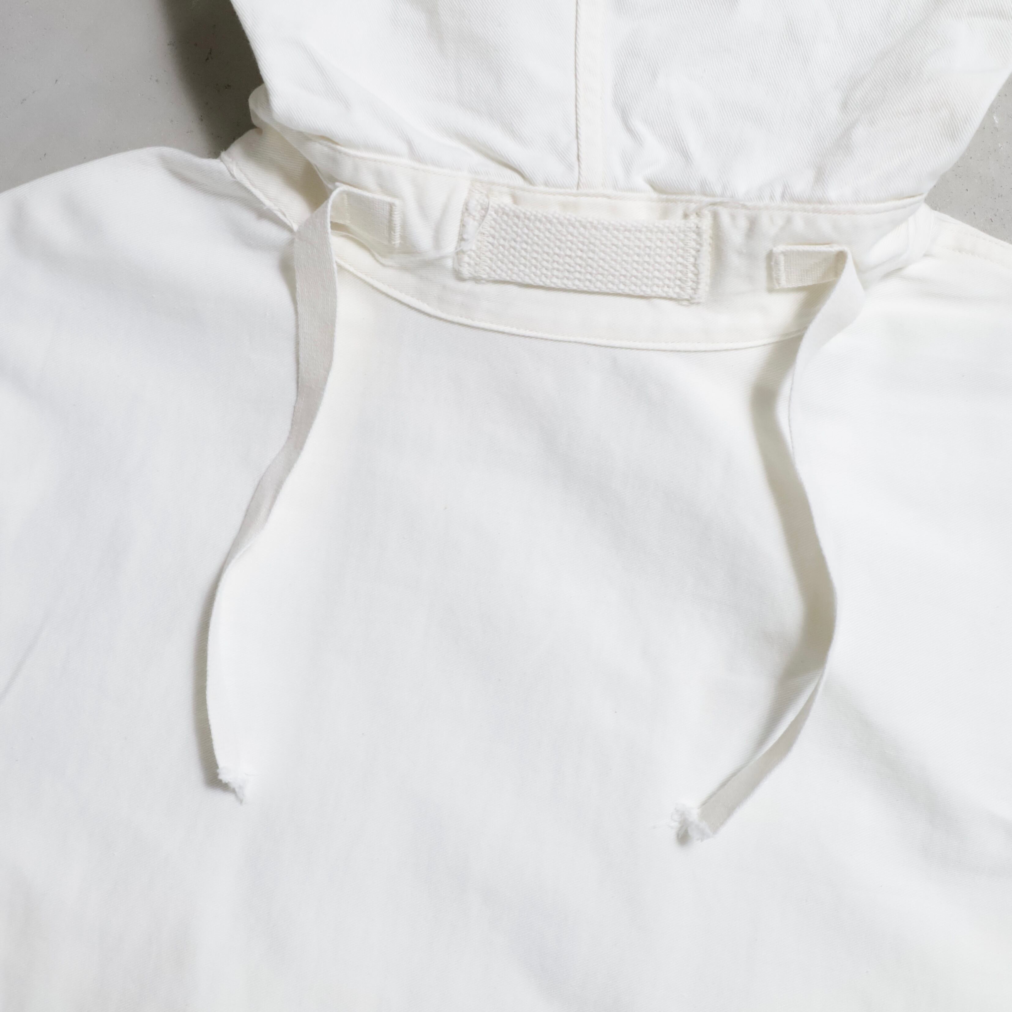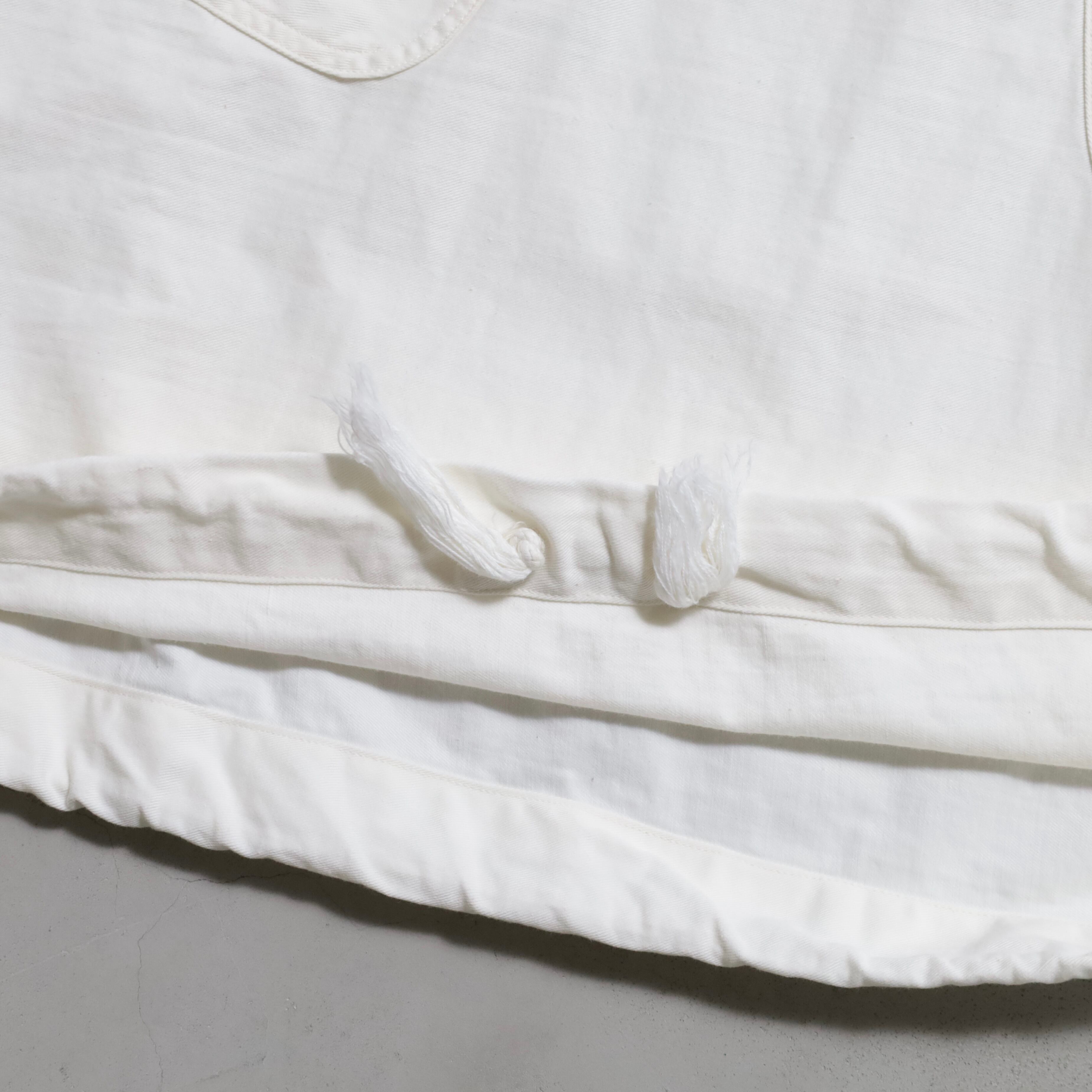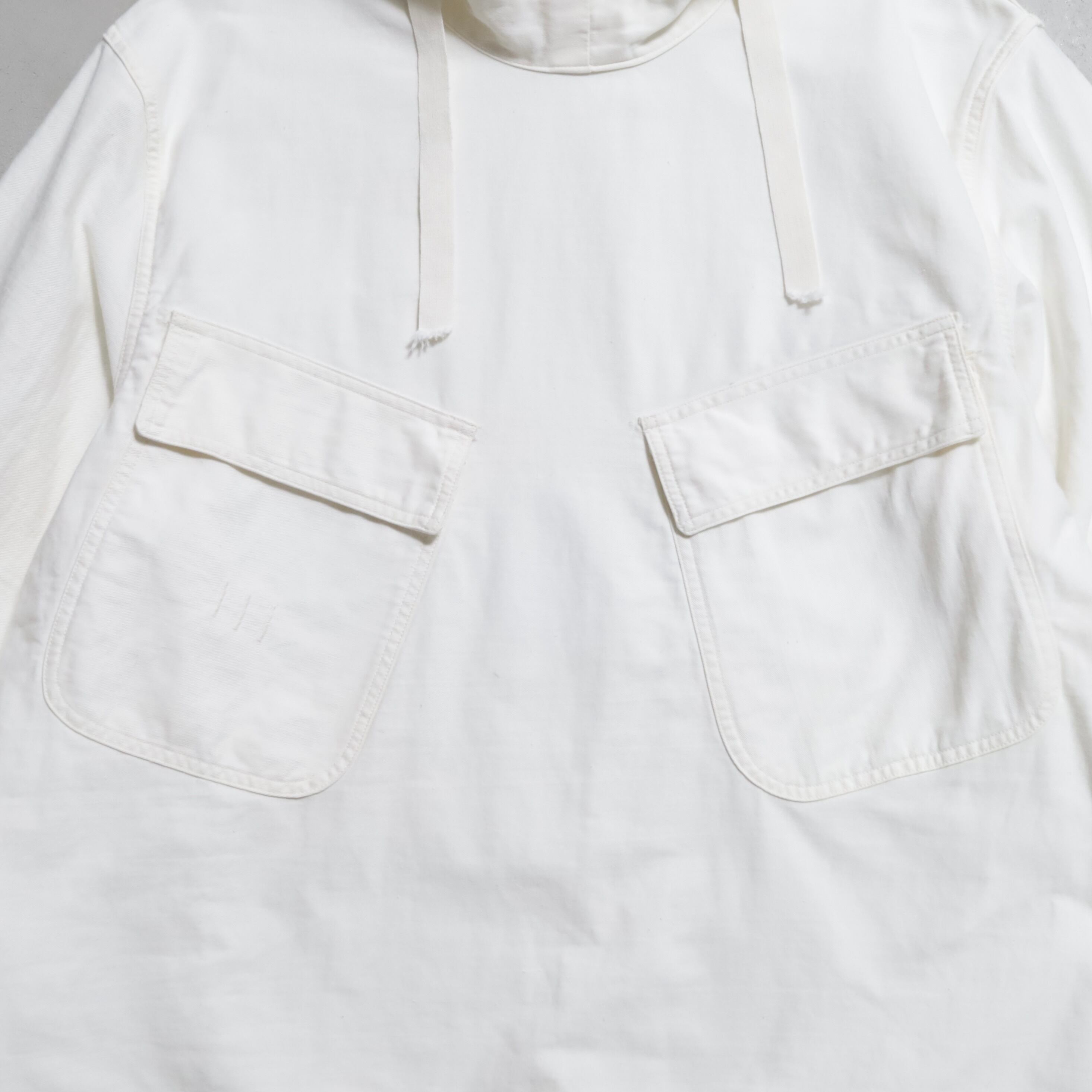 ガンナースモックとも言いますね。首周り前後・袖・裾ドローコード付(袖は平織)のコットン地。2ポケスラッシュの方です。3本ステッチで実寸XLARGE-XXLARGE相当のグッドサイズ。プルオーバーでデザイン性も高く多くのブランドがサンプリングしています。