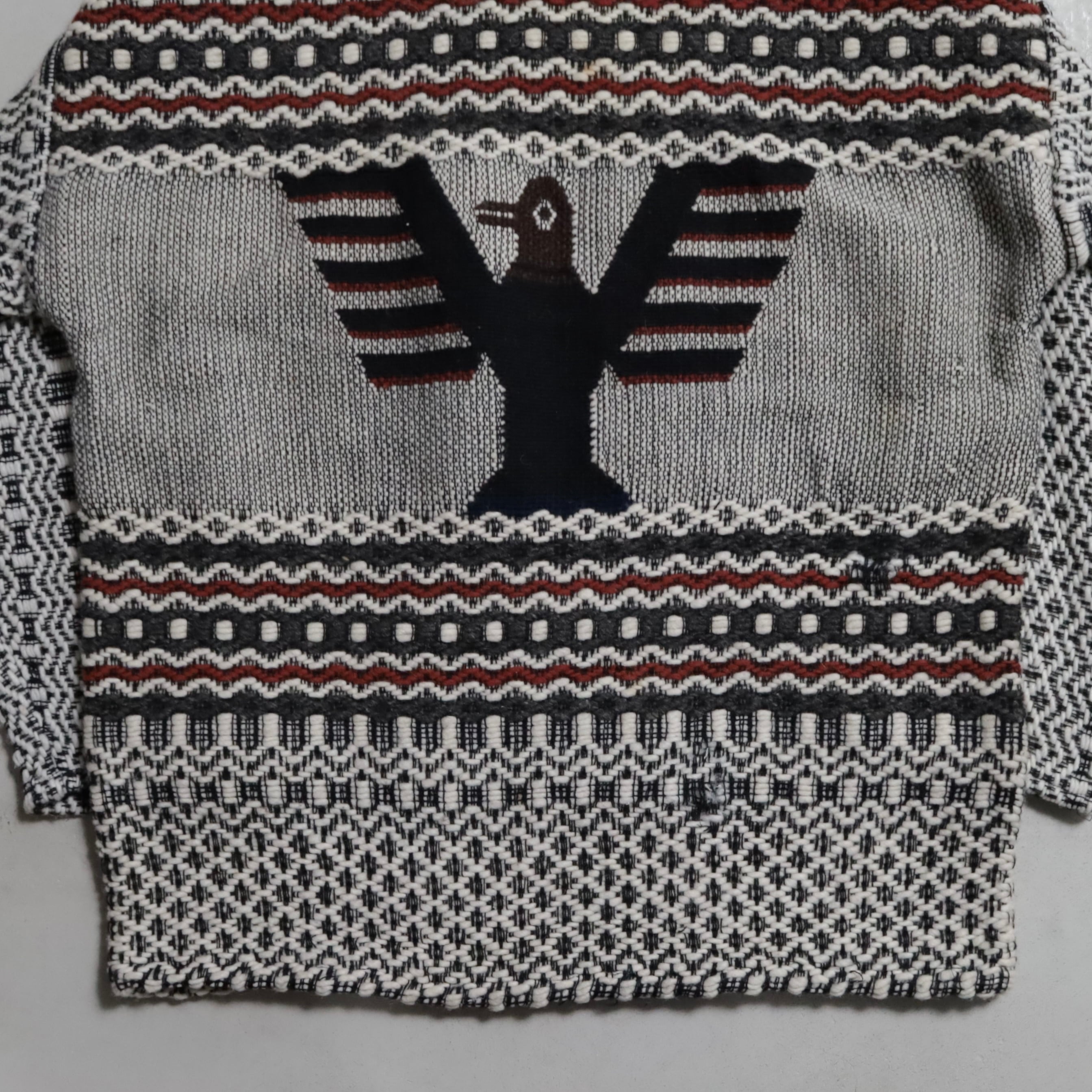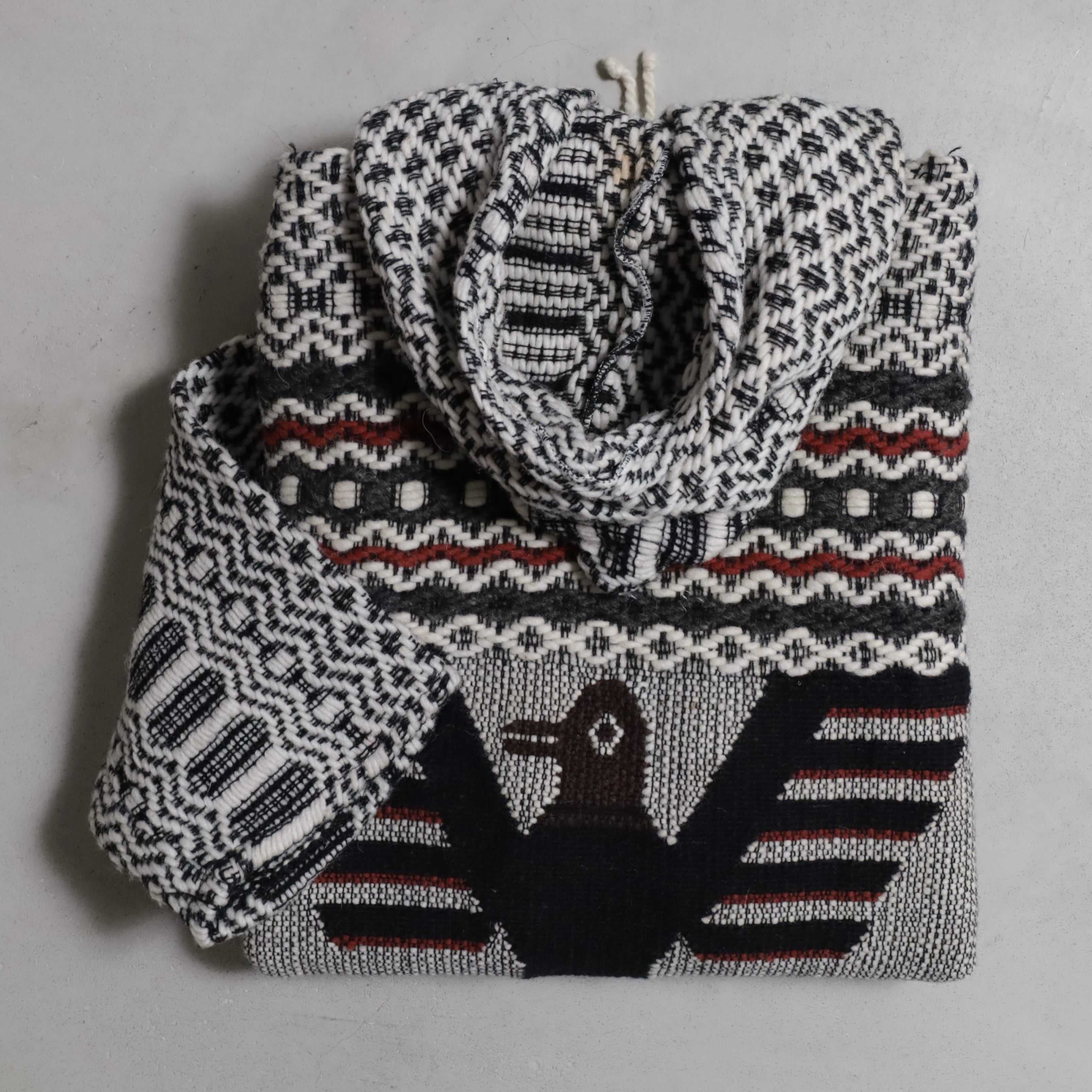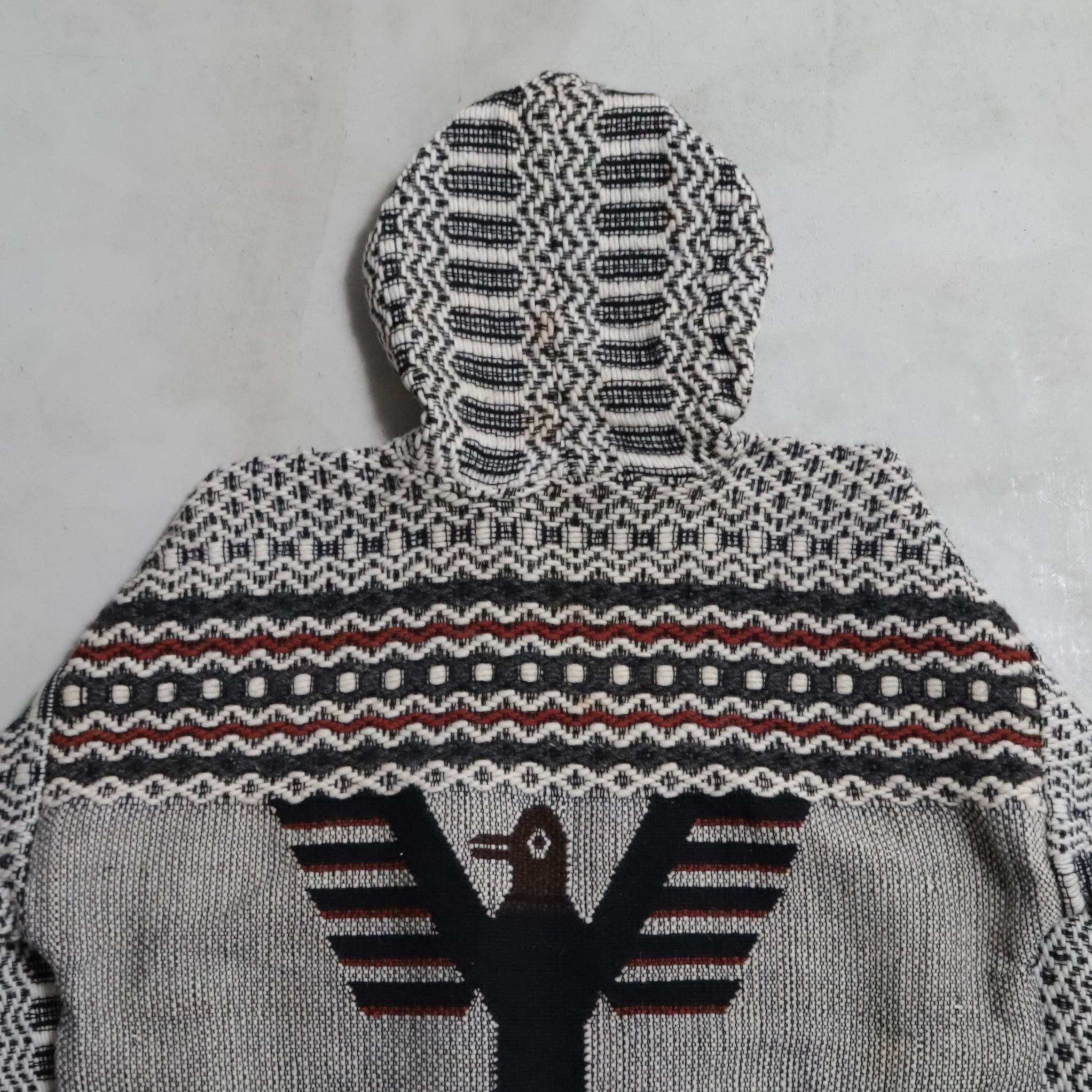 ネイティブ柄に背面に大きく入るサンダーバードが最高です。古着好きには刺さるデザインですね。恐らくウール素材、メキシカンフーディーとも似てますね。ハーフボタン仕様に裾はドローコードで調整可能。古着らしく雰囲気の良い一着ですしゆったり着用できるサイズ感でおすすめです。
