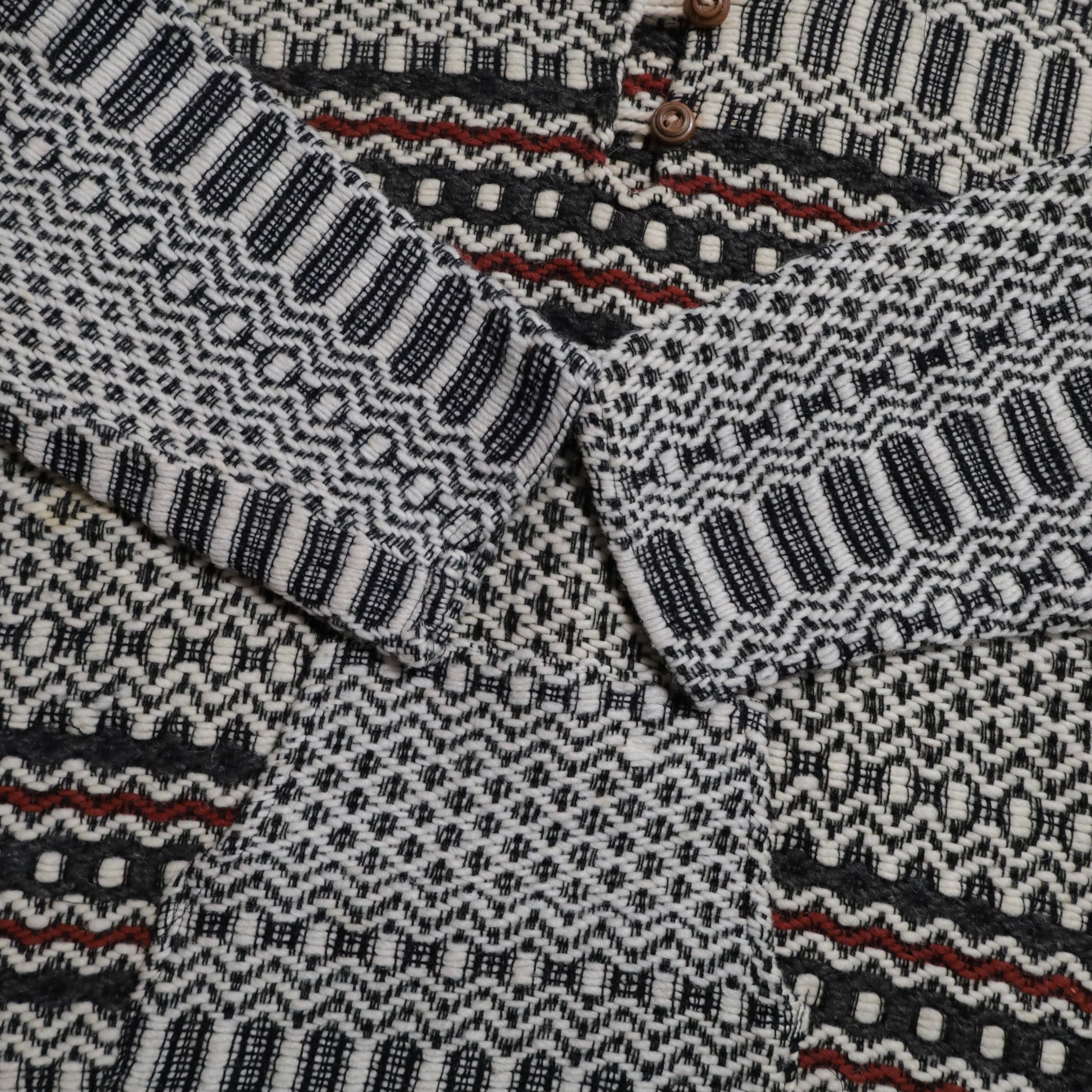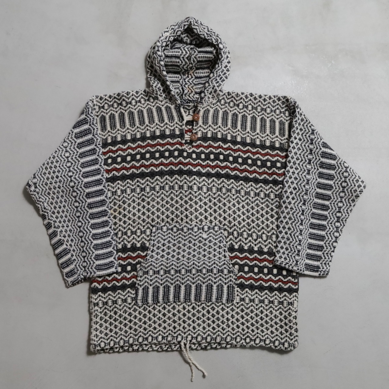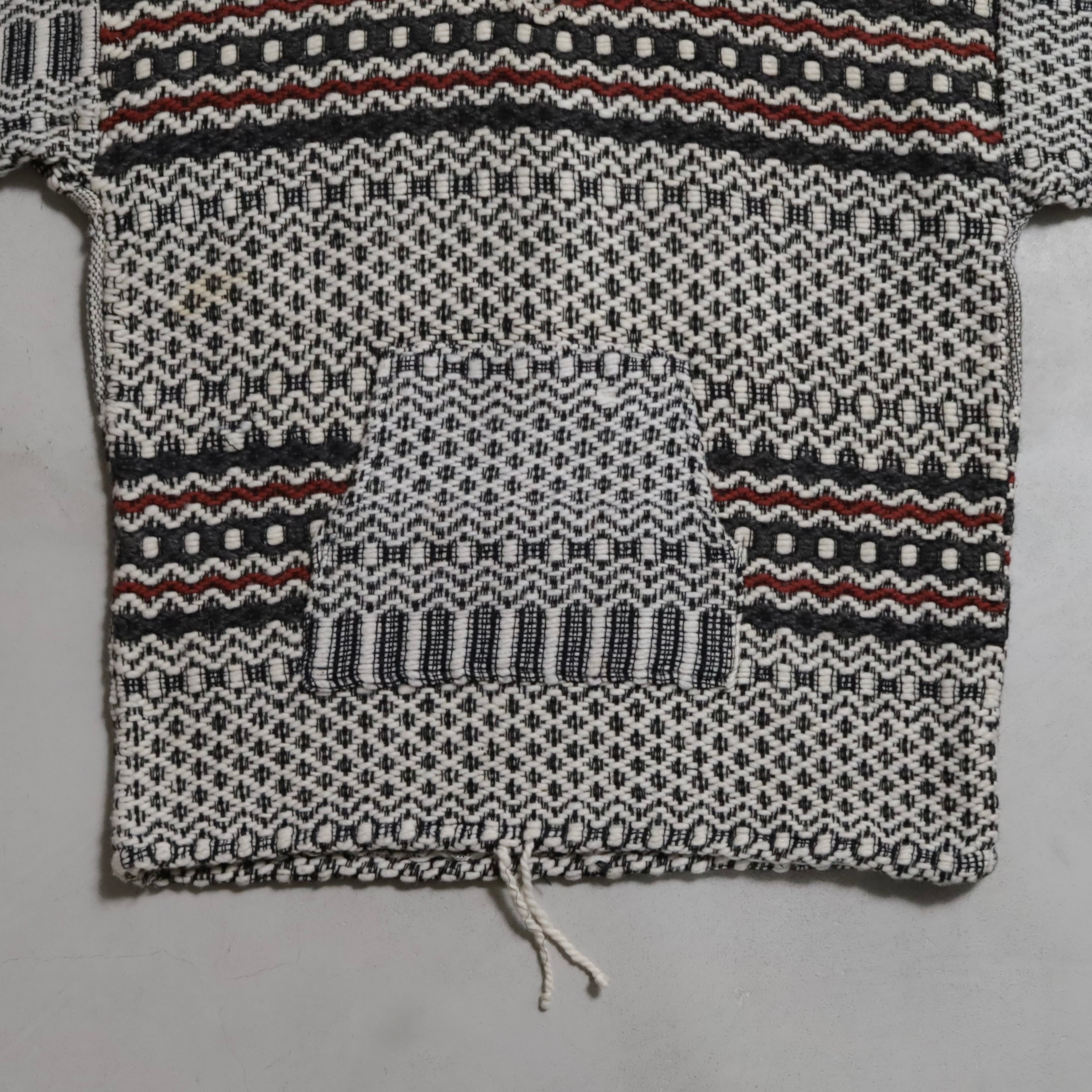ネイティブ柄に背面に大きく入るサンダーバードが最高です。古着好きには刺さるデザインですね。恐らくウール素材、メキシカンフーディーとも似てますね。ハーフボタン仕様に裾はドローコードで調整可能。古着らしく雰囲気の良い一着ですしゆったり着用できるサイズ感でおすすめです。