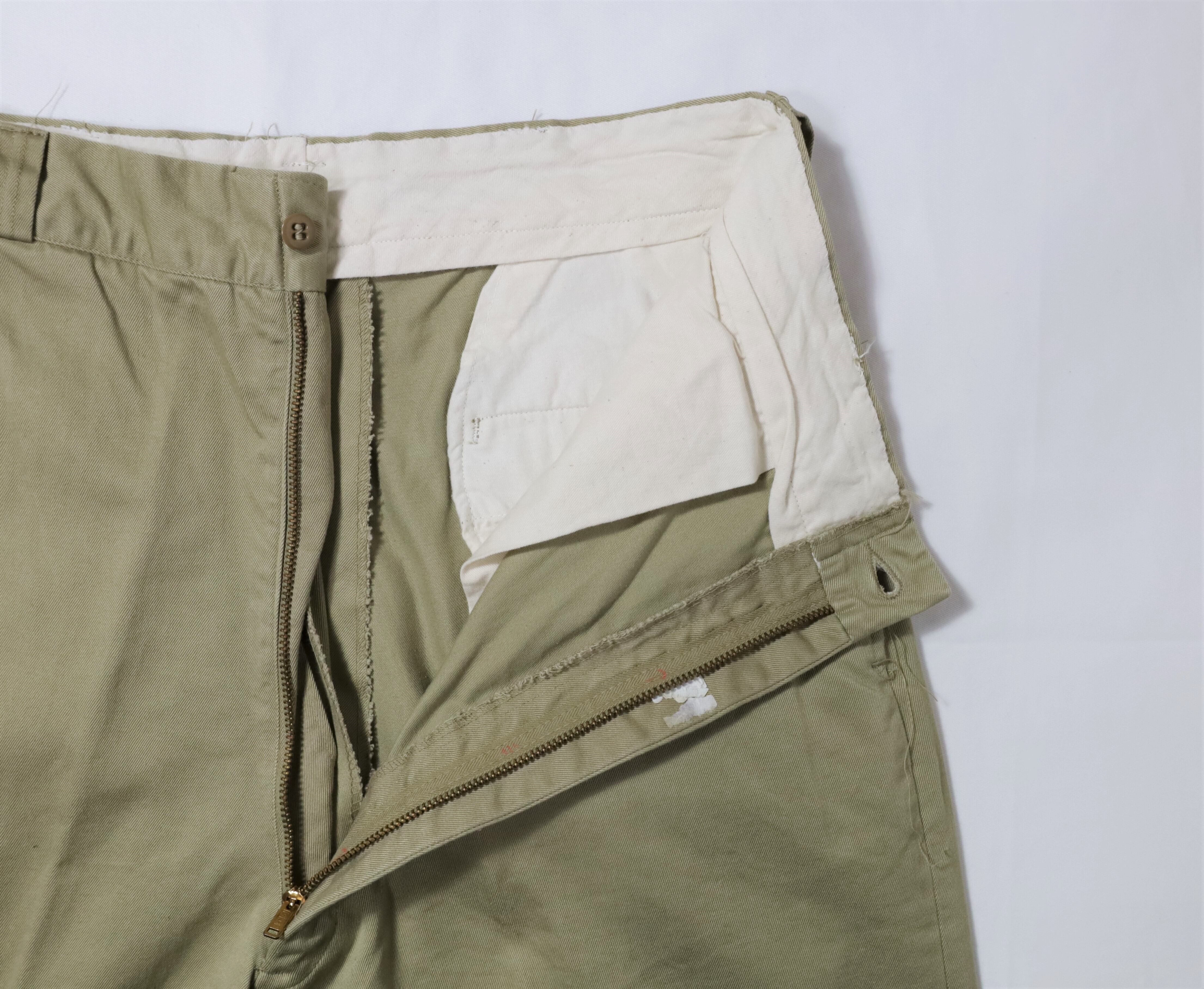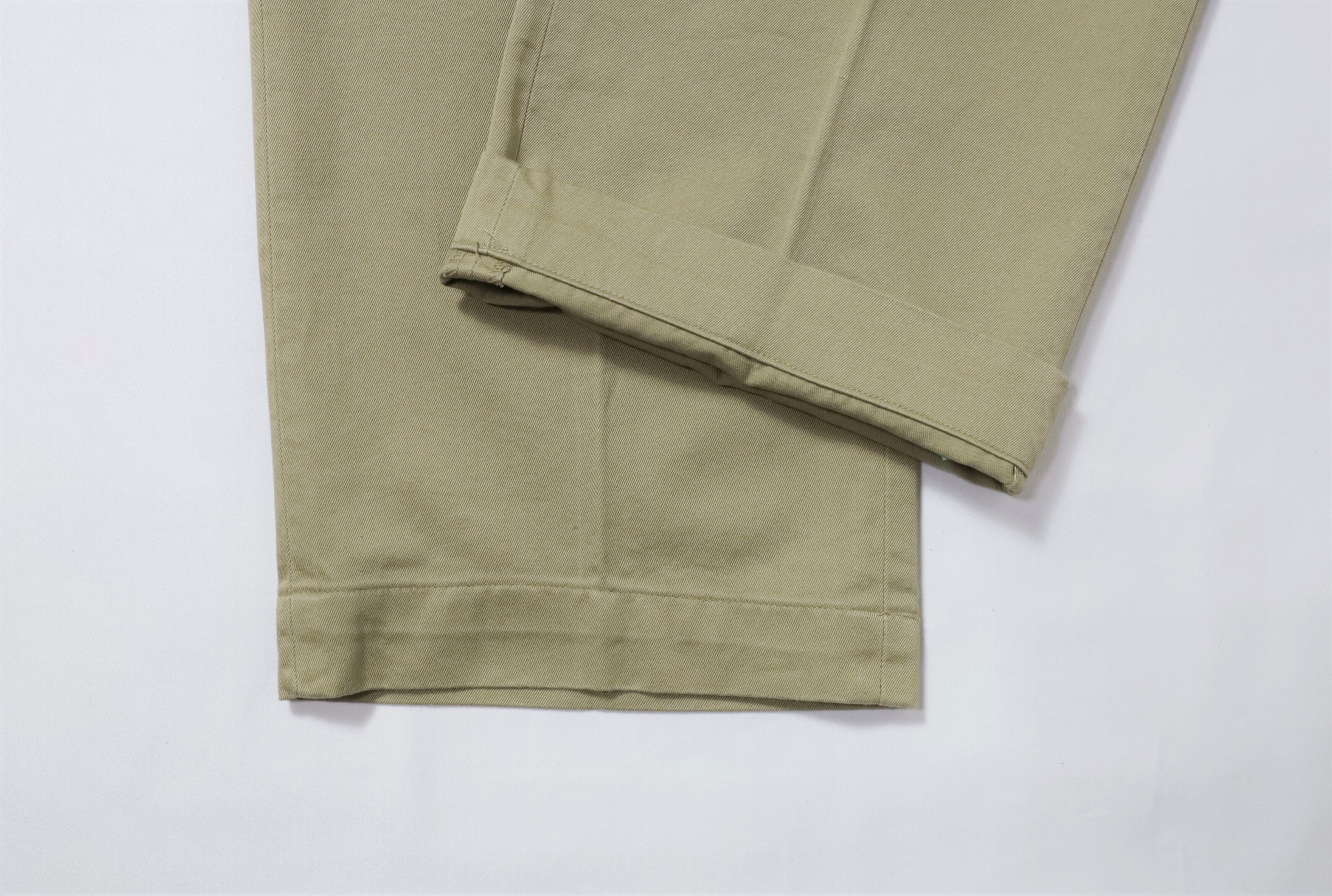 素材感、色味の良いアーミーチノ、ワイドシルエットの武骨な雰囲気が最高です。コットンツイルの風合い、バックポケットの玉縁ディテールも見逃せないですね。この機会に是非ご検討ください。