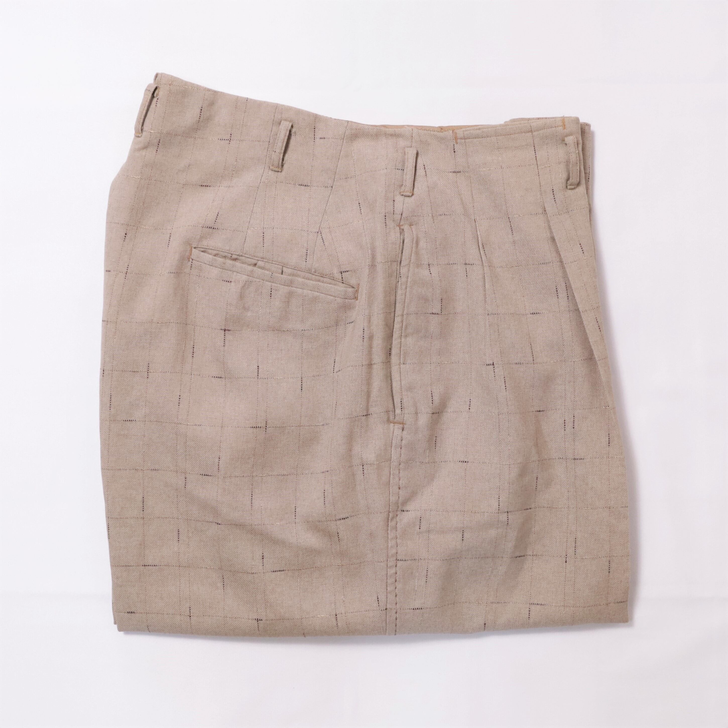 腰帯と身頃が一体となったピストルパンツの様なディテールです。裾に向かってテーパードの掛かった超ワイドシルエット。丈詰めありのダブル仕上げ。この年代らしい良いシルエットですし、時代にも合っていますのでおすすめですよ。落ち着いた色味に絣柄が最高の雰囲気でかっこいいですよ。この機会に是非ご検討ください。