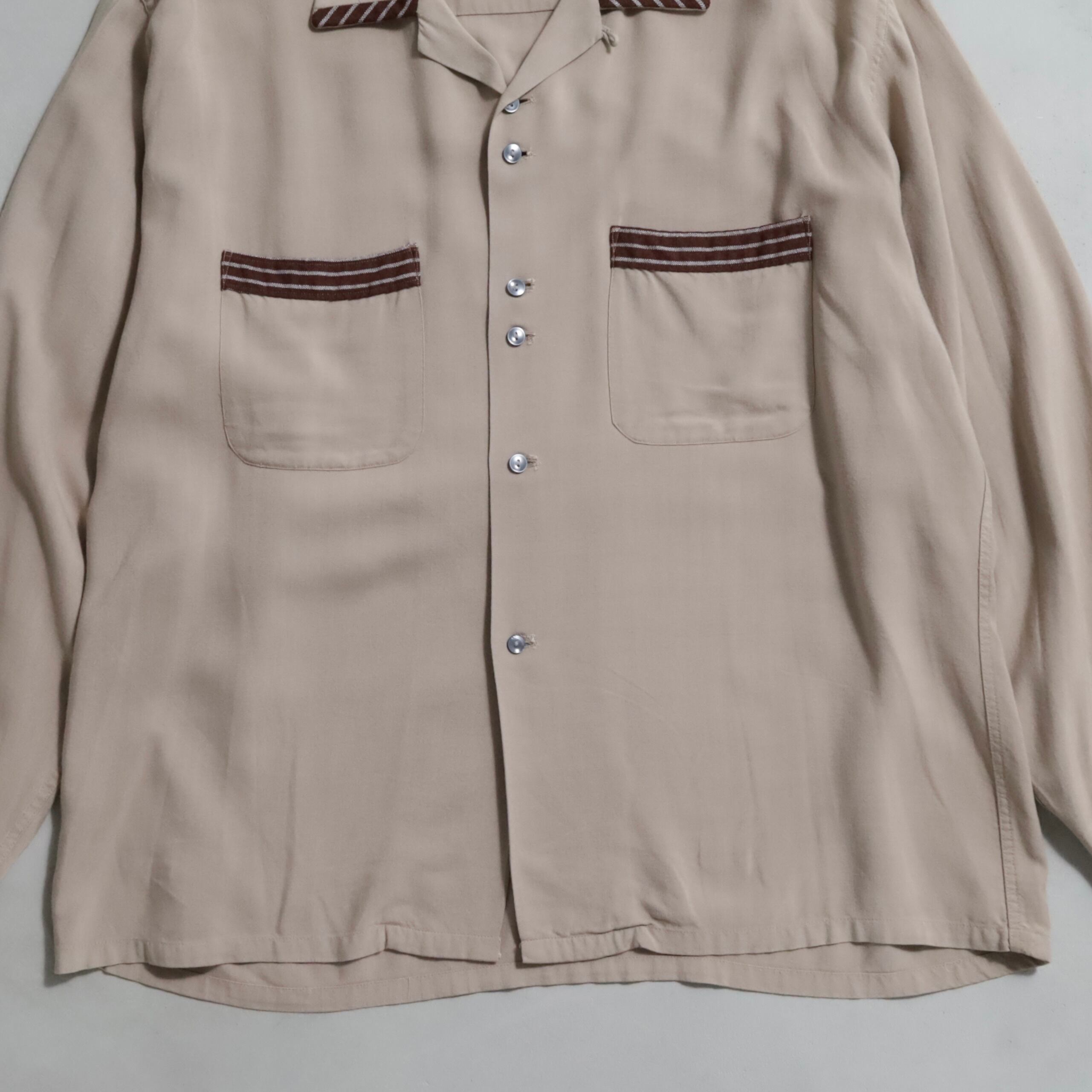 スペシャルピース。古いレーヨンシャツだとシャドーチェックより出てこない印象です。ロカビリー全開のデザイン、かっこいいですよ。極上ミントコンディション。Largeサイズは評価できますし、ボタンの仕様も珍しく、開襟・ボックスシルエットもトレンドに合っているのでおすすめです。この機会に是非ご検討ください。
