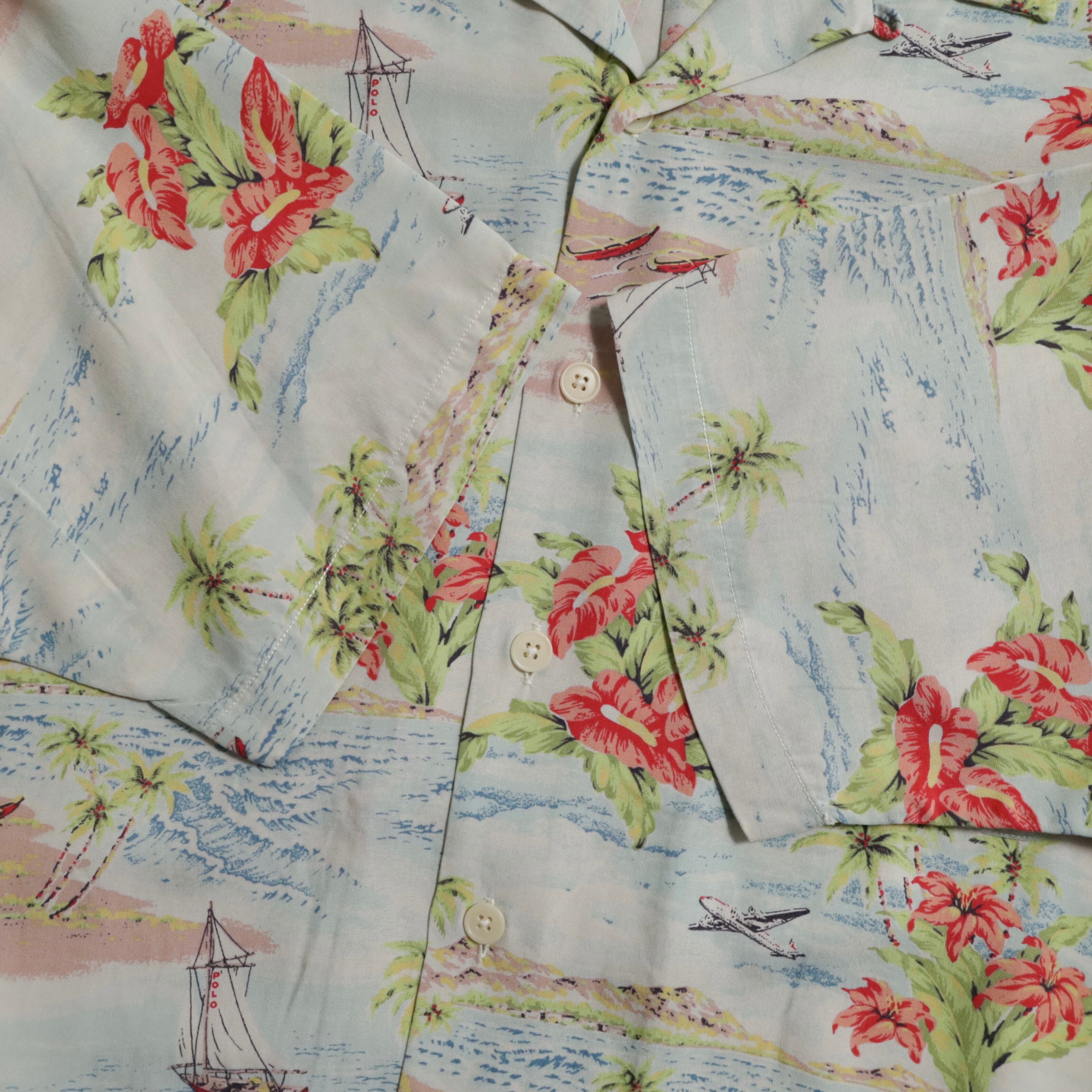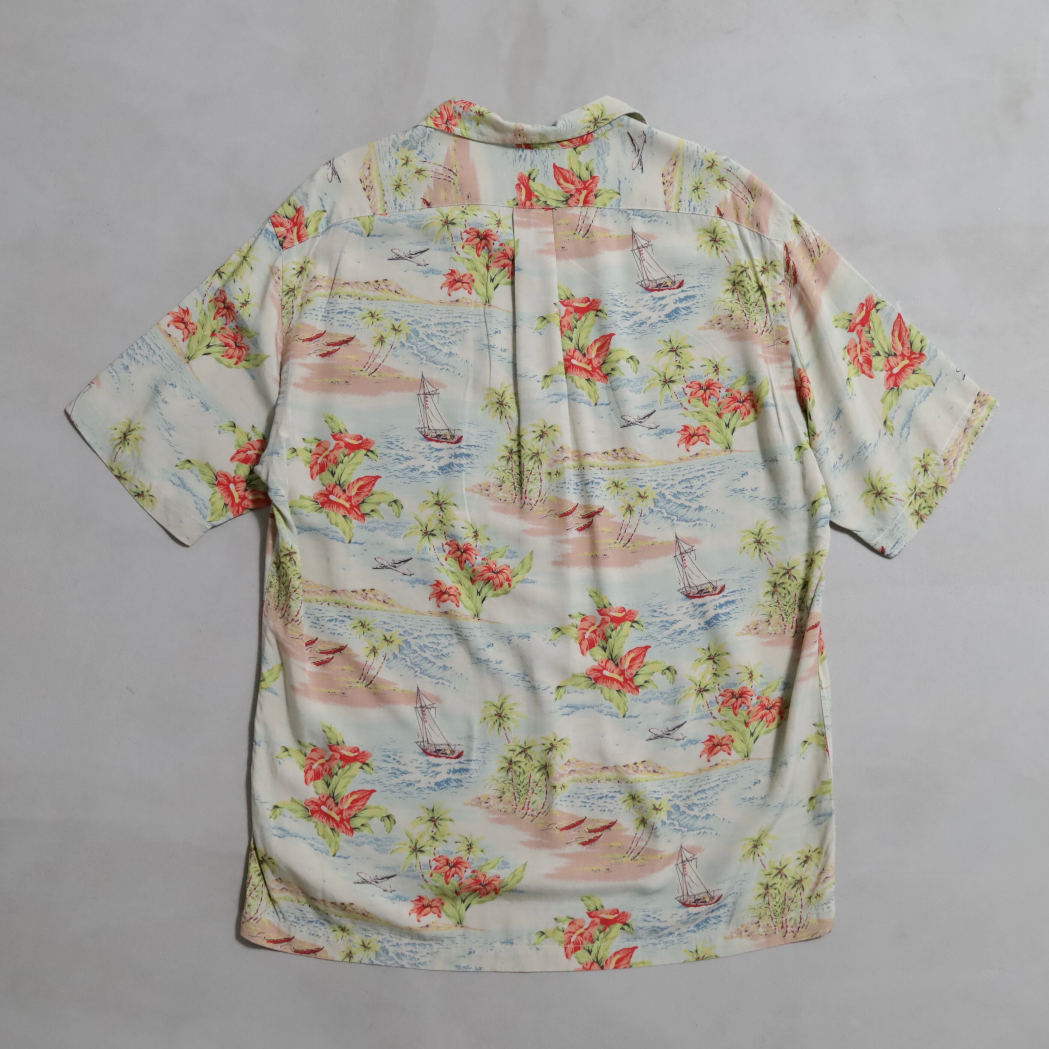 デザインセンス抜群のポロスポーツレーヨンハワイイアン、グッドコンディションです。ビンテージハワイアンの大きいサイズを探している方はリーズナブルなこの辺もありだと思います。このパターンと飛行機の組み合わせが最高ですね。デザイン・カラー含め全体的に落ち着いたトーンなので総柄が苦手な方もおすすめです。この機会に是非ご検討ください。