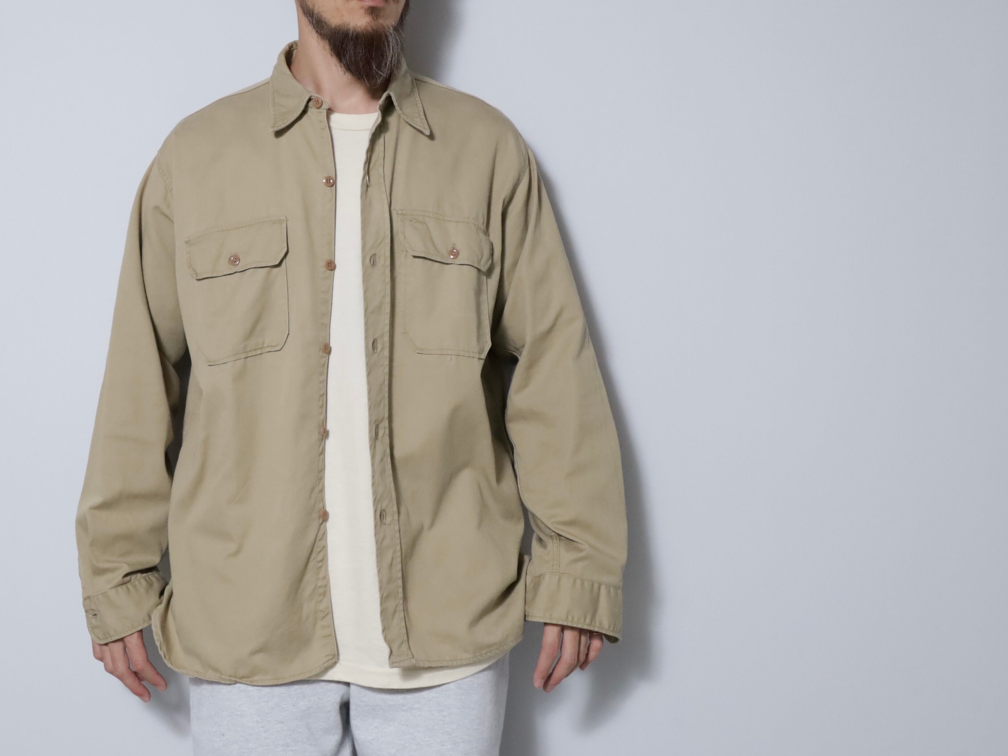 良い風合いのチノワークシャツ、グッドコンディションです。無駄のない無骨なかっこよさが最高ですね。フラップ、ペン差し付。ゆったりとしたサイズも魅了です。マチ付の嬉しいディテール。まだ所有されていない方には是非挑戦して頂きたいオールド物。おすすめです。この機会に是非ご検討ください。