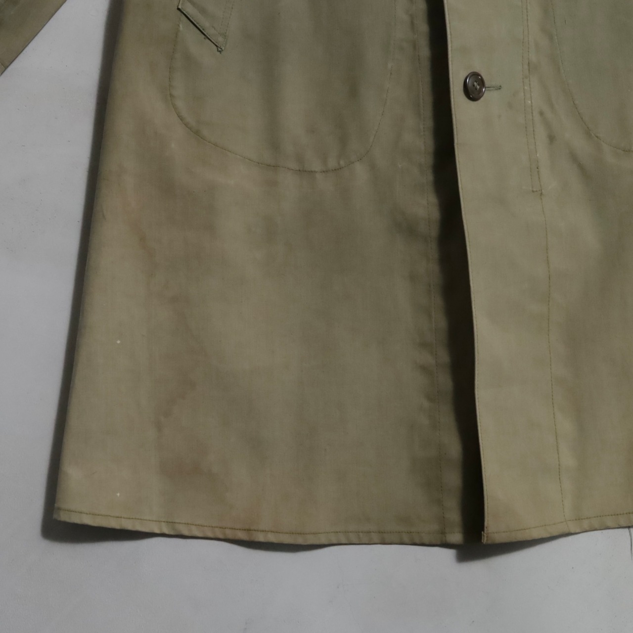 希少な第二次大戦期のレインコート、グッドコンディションです。両脇にベンチレーション付。ラバーコーティングされたバルマカーンタイプ、着用するとAラインの綺麗なシルエットがより際立ちます。フェードが掛かった雰囲気もかっこいいですし、タウンユースとしてもリアルに着用頂けます。SMALL表記ですが175/60でLARGE相当のサイズ感です。雰囲気も別格ですしファッションとして取入れて頂きたい逸品、この機会に是非ご検討ください。