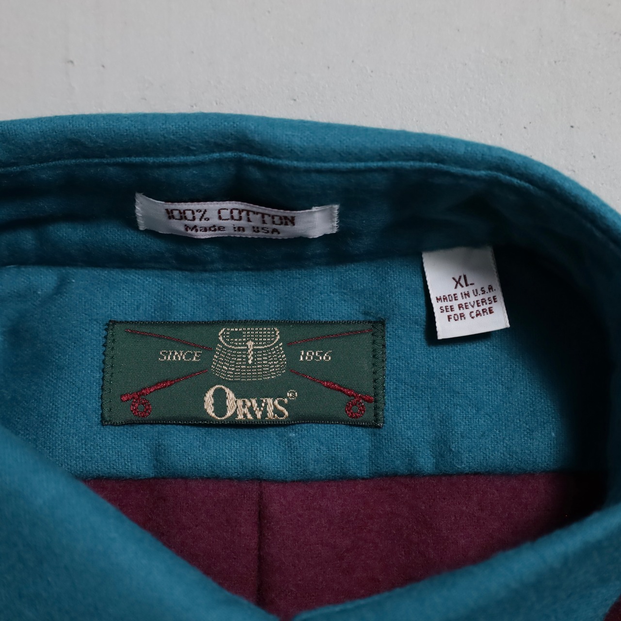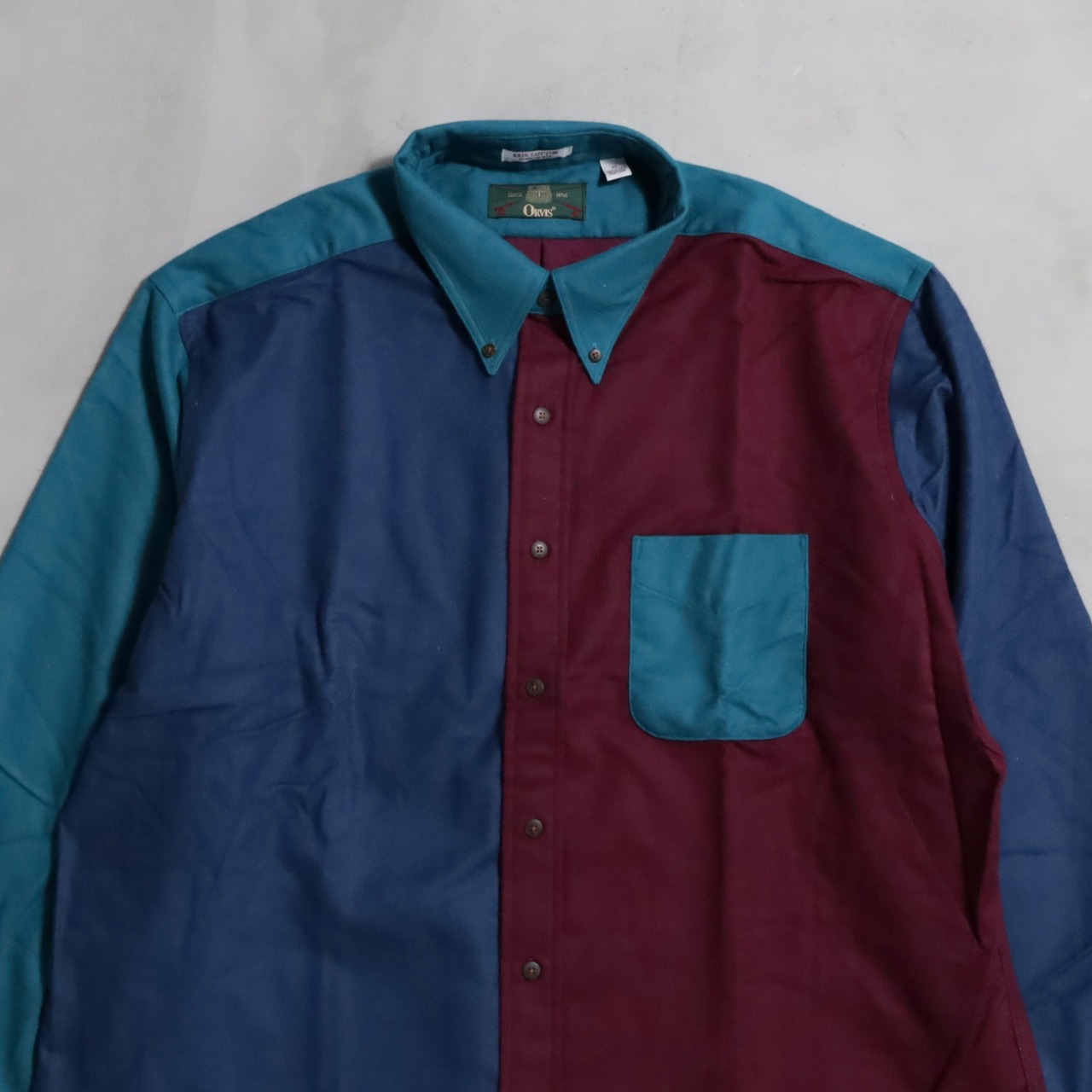 良いブランド、良い配色、良い古着です。希少なデッドストック。U.S.メイドにゆったりとしたXLARGEサイズも魅力です。ボタンダウンなのでよりカジュアルに着回せますし、シャモアクロス特有の毛羽立ちは洗濯着用を繰り返すと風合いも増していきます。この年代のORVISはセンスの光る良い古着が多いのでおすすめです。この機会に是非ご検討ください。